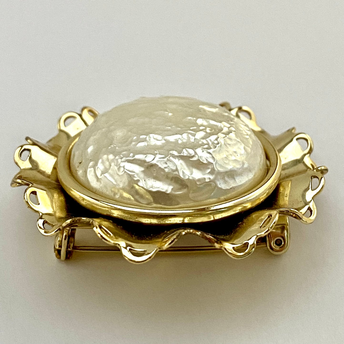 This beautiful, bold, flower brooch is an unsigned beauty. The brooch features a huge, lustrous, faux baroque pearl button that measures approximately 1¼” in diameter. The pearl sits on a gold-tone circle and is the center of the unusual brooch. The flower center is surrounded by a gold-tone ruffle that serves as the open work petals. The brooch measures approximately 1¾” in diameter and closes with a locking C clasp. This brooch is in excellent vintage condition.
