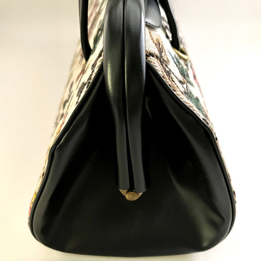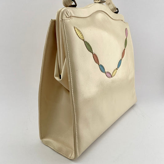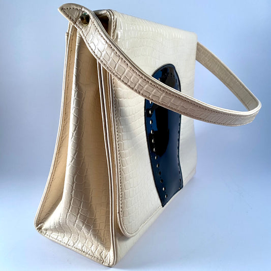 1950s Ivory & Black Patent Leather Front Flap Handbag
