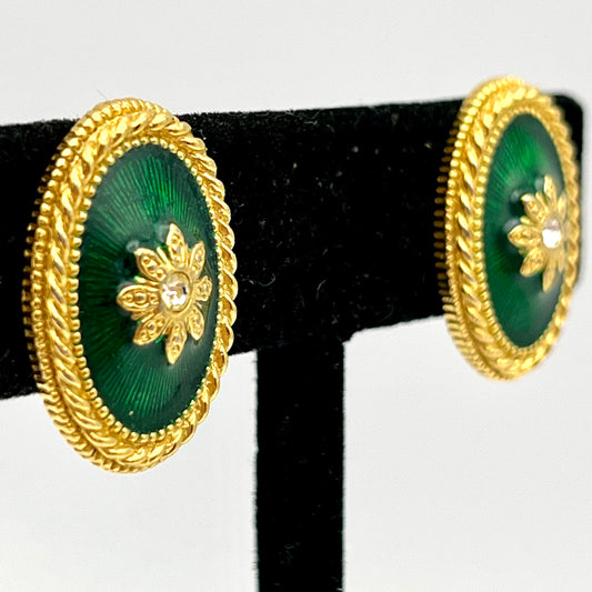 1960s Gold-Tone & Green Enamel Oval Earrings