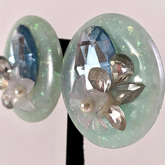 1950s Confetti Lucite Rhinestone Flower Earrings
