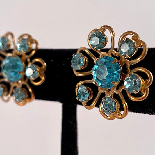 1950s Blue Rhinestone Flower Earrings
