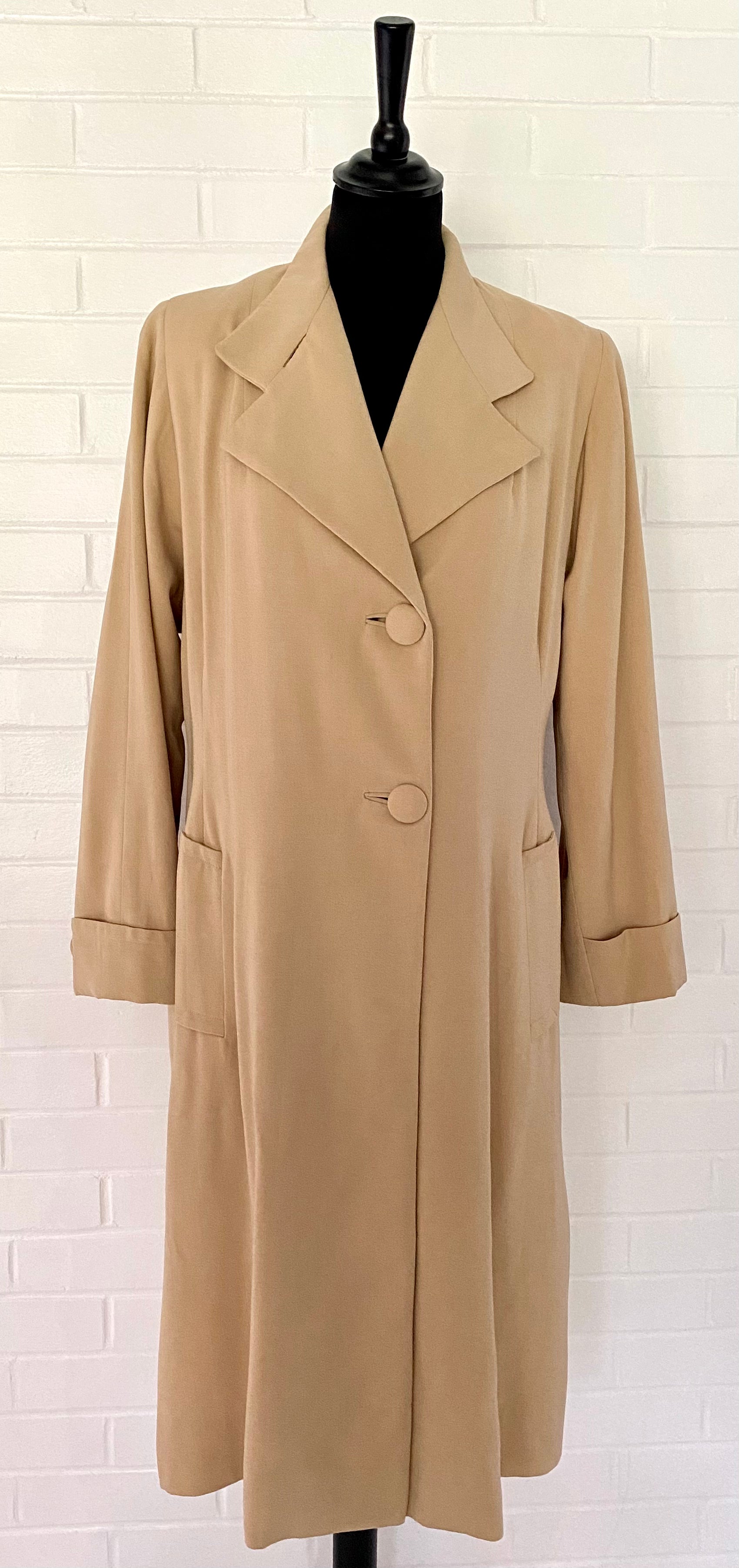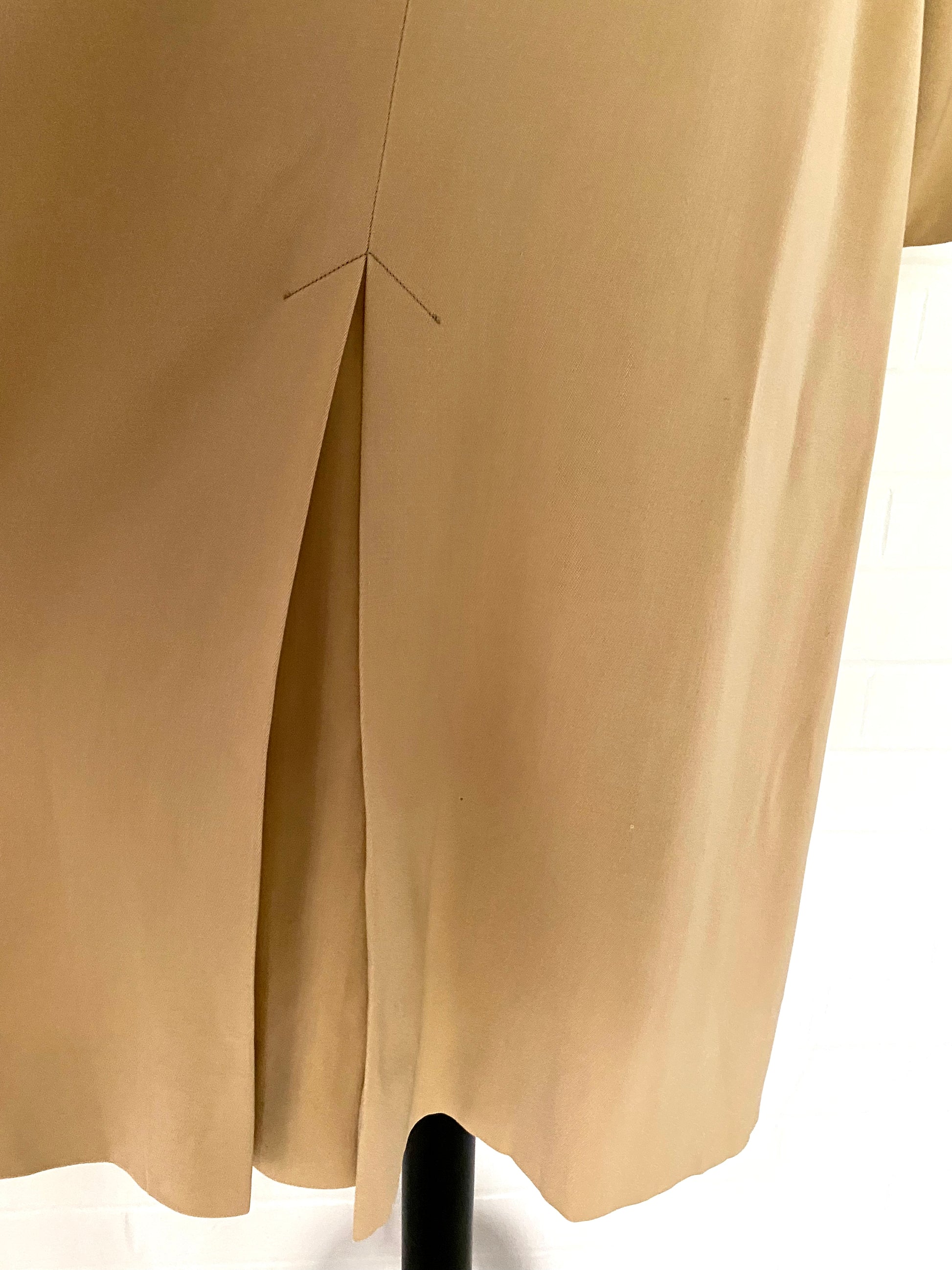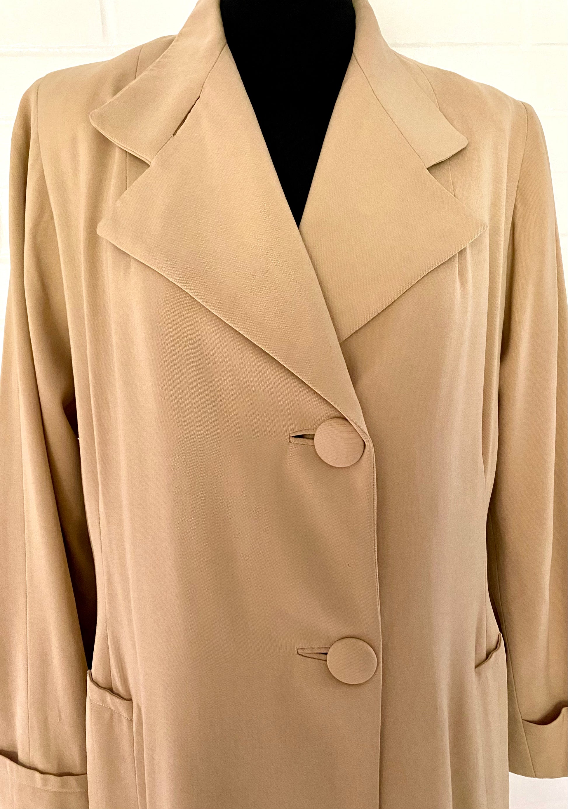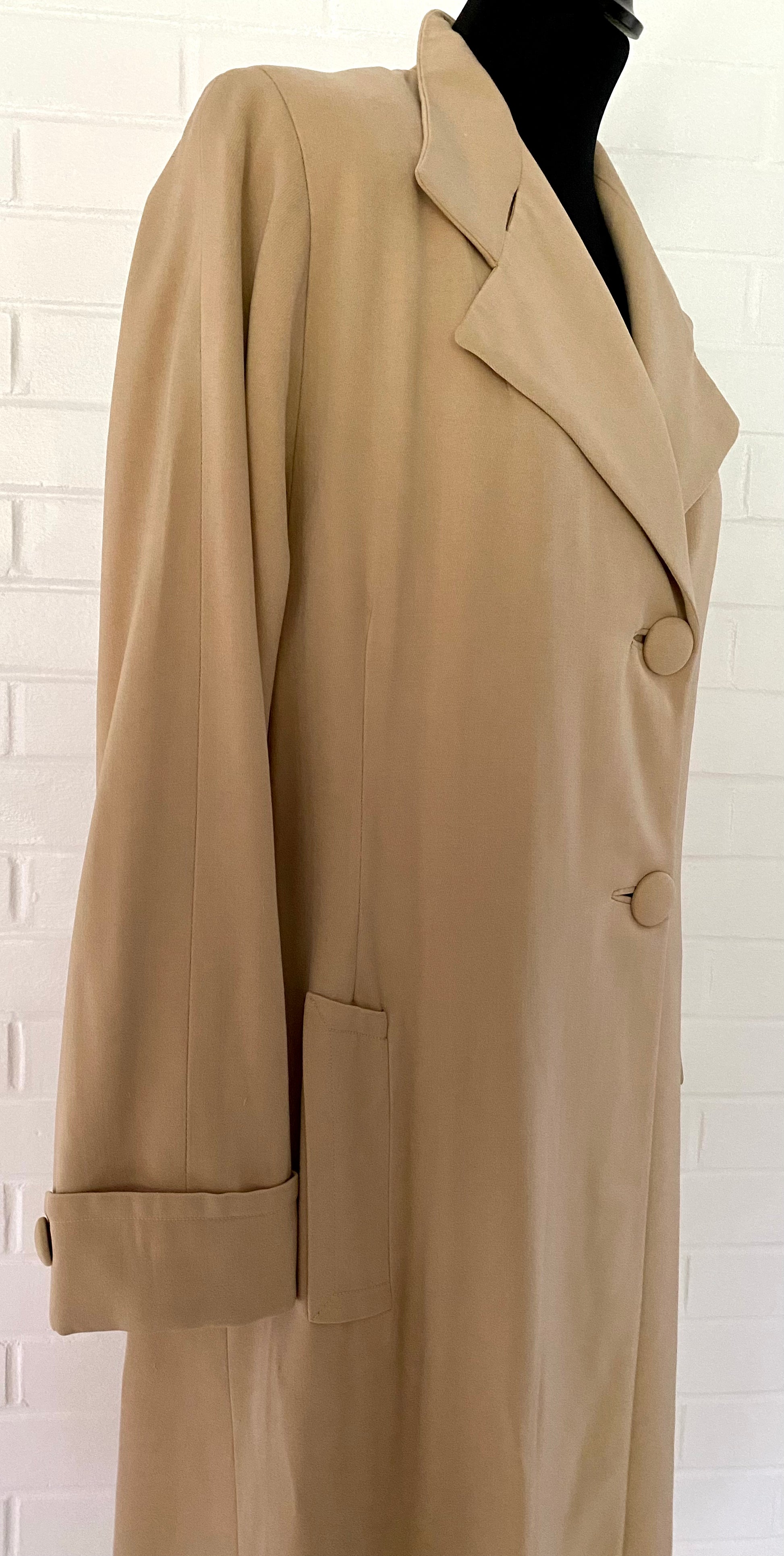 Style: This long coat has a large notch collar with an optional button closure at the collar. There is a 2 button closure slight off centered from the center front. The button holes are bound button holes and buttons are large and covered in self fabric. The sleeve are long with cuffs at the bottom with self fabric covered buttons on the cuffs. There are 2 large self fabric welt pockets at the front. There is an attached back belt with 2 self fabric buttons. At the center back bottom there is an inverted kick pleat. The interior is fully lined and there are 2 straps at the front interior front opening to put your arms through and wear as a cape over your shoulders. There are also matching driving gloves.