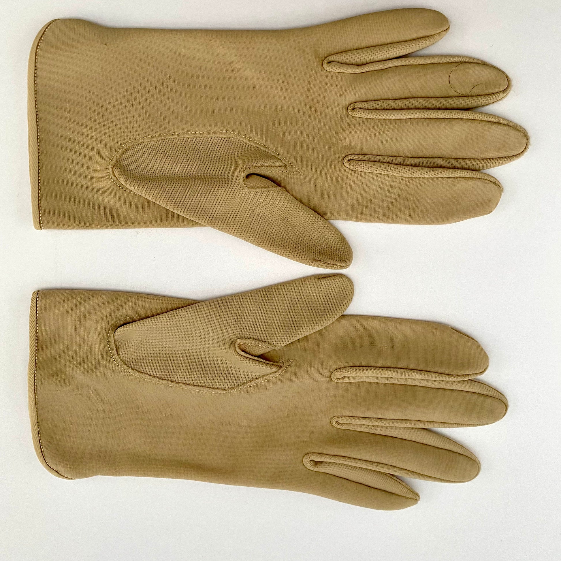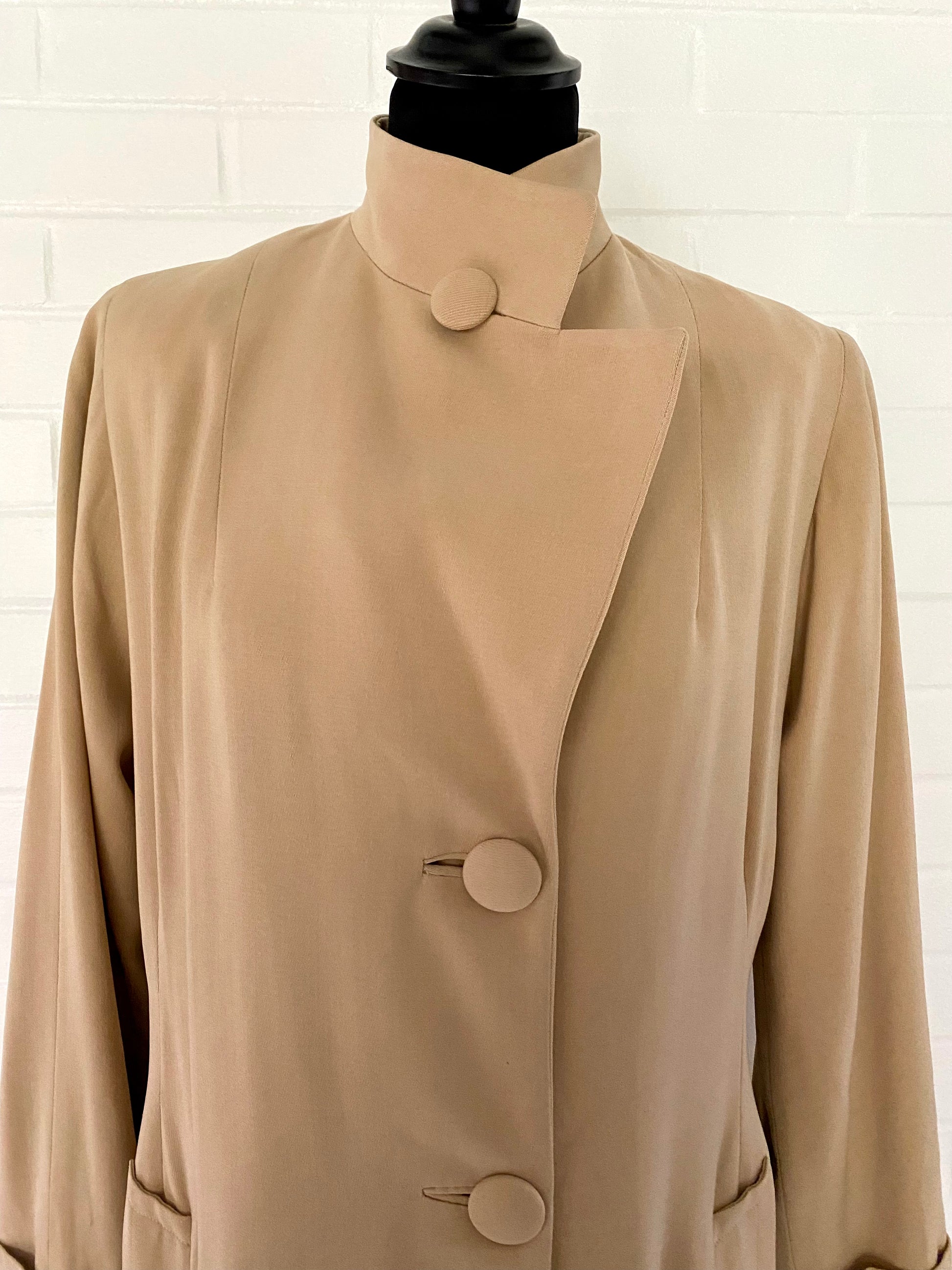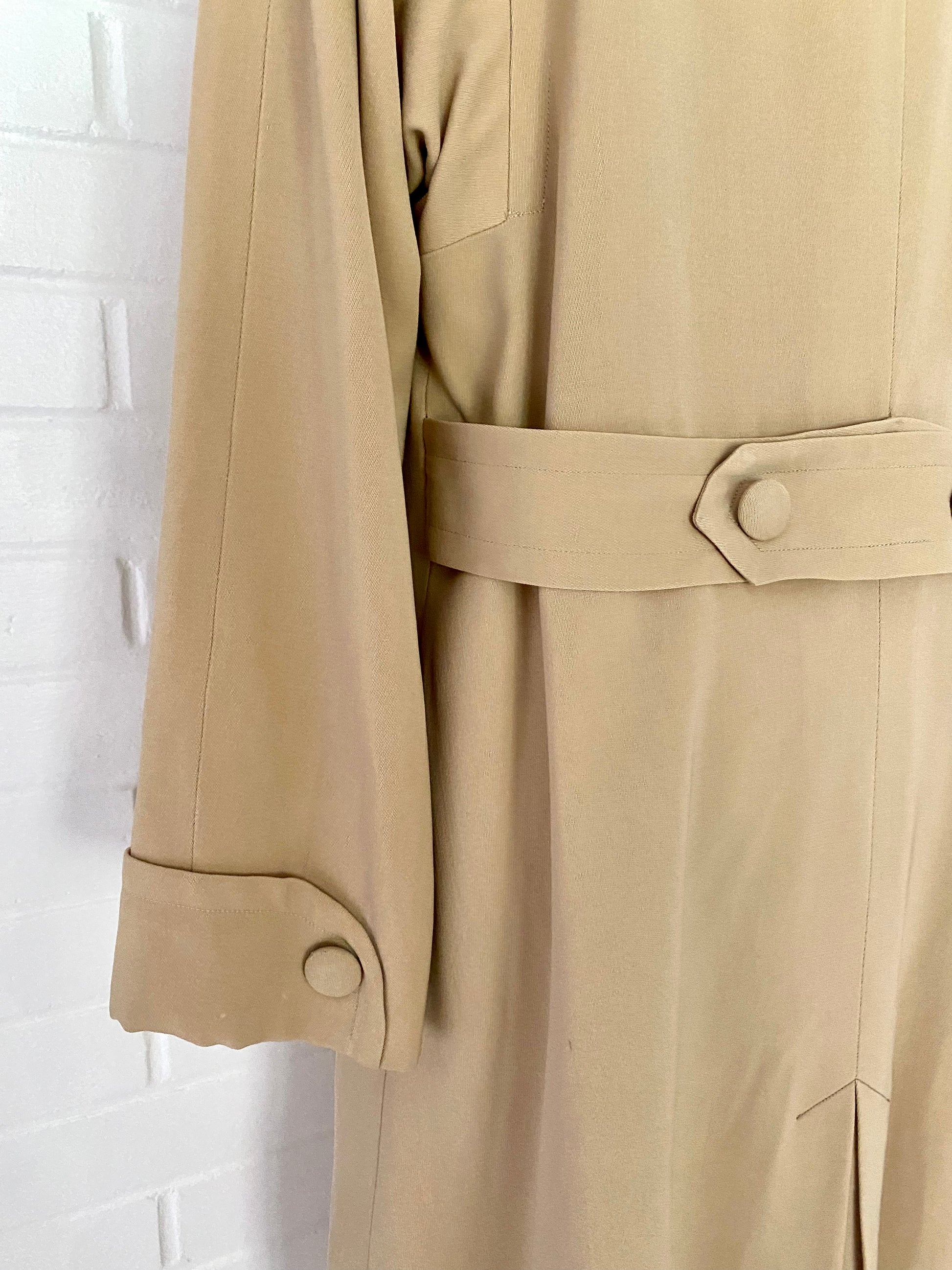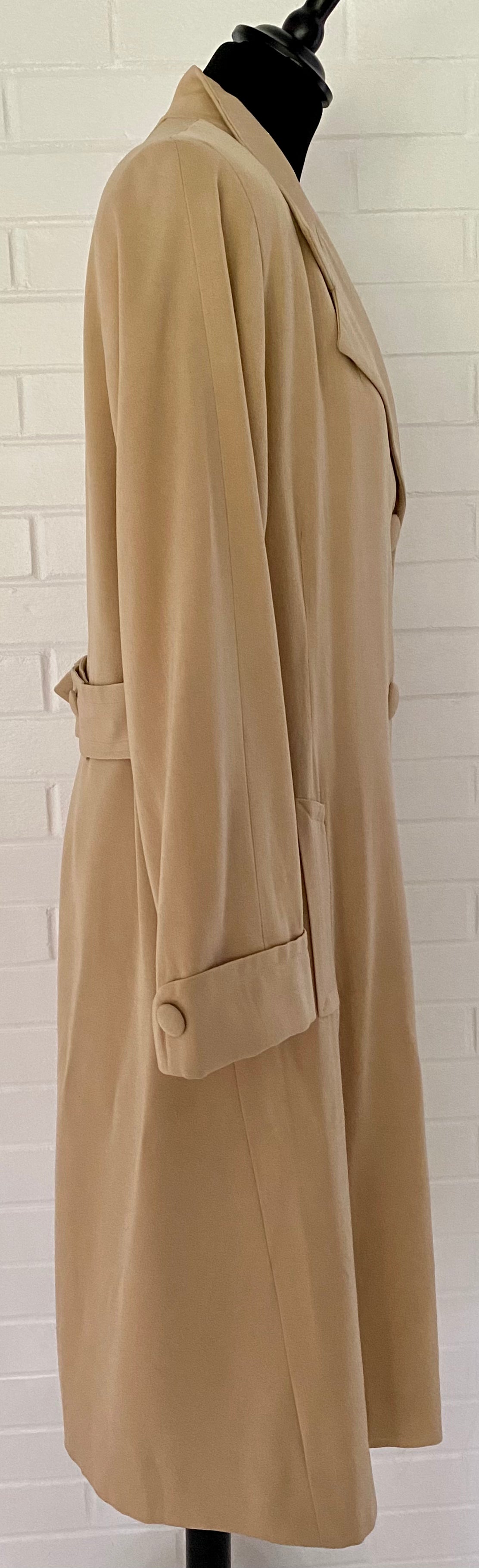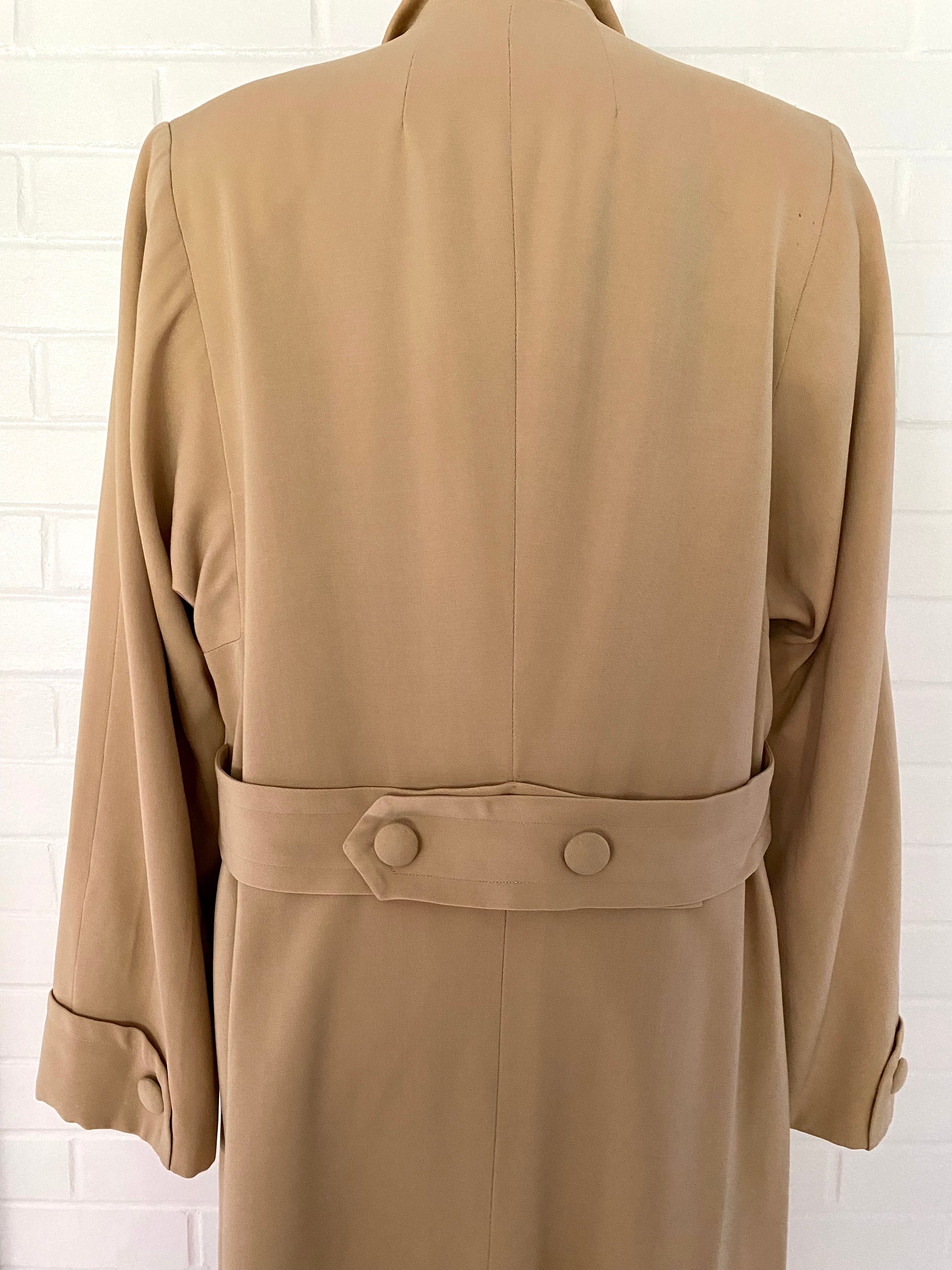 Style: This long coat has a large notch collar with an optional button closure at the collar. There is a 2 button closure slight off centered from the center front. The button holes are bound button holes and buttons are large and covered in self fabric. The sleeve are long with cuffs at the bottom with self fabric covered buttons on the cuffs. There are 2 large self fabric welt pockets at the front. There is an attached back belt with 2 self fabric buttons. At the center back bottom there is an inverted kick pleat. The interior is fully lined and there are 2 straps at the front interior front opening to put your arms through and wear as a cape over your shoulders. There are also matching driving gloves.