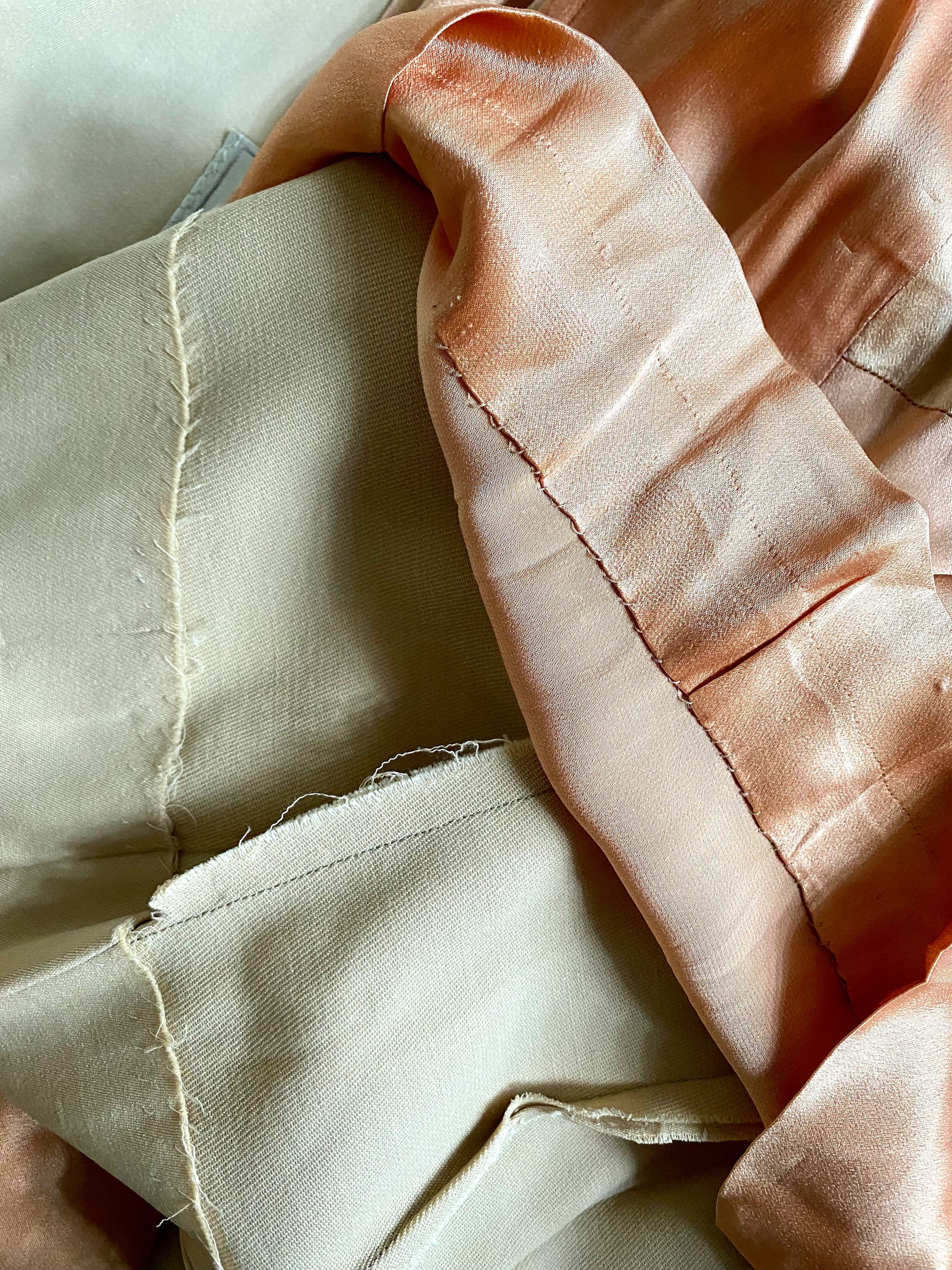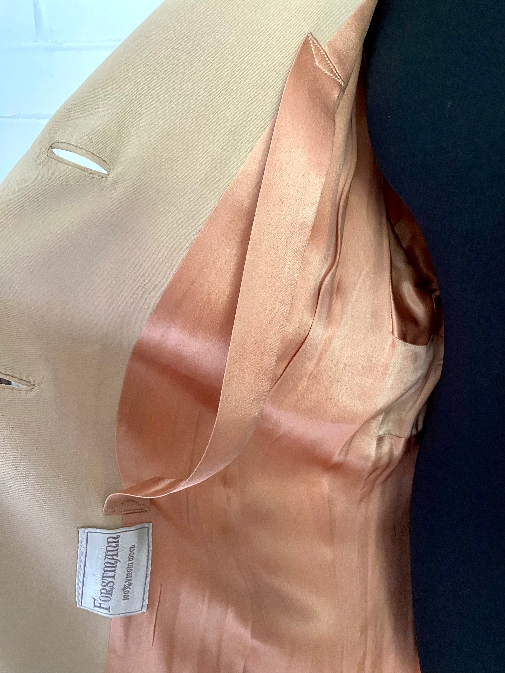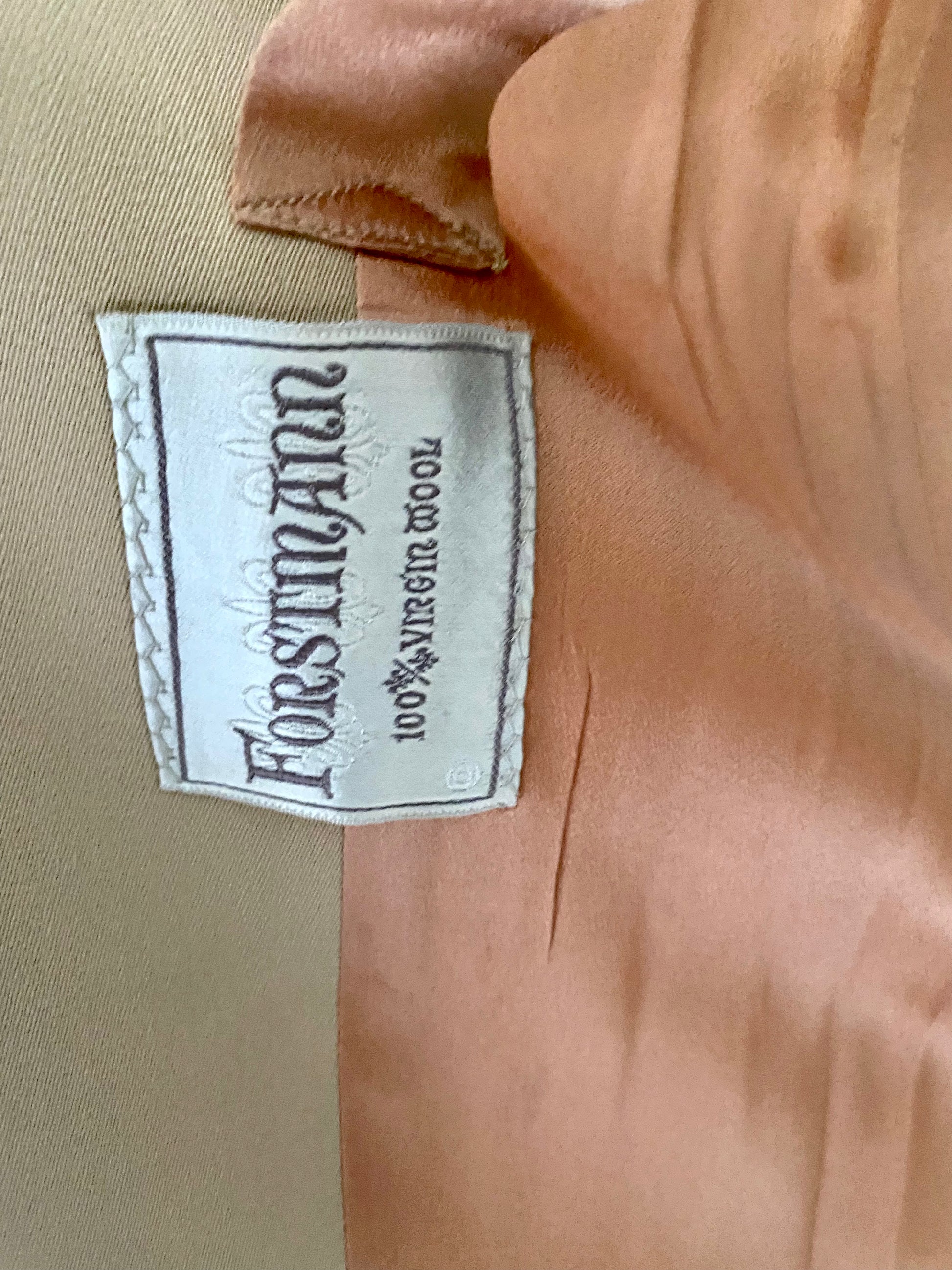 Fabric: The exterior is Forstmann, 100% Virgin Wool (the label is present) & the interior lining is satin.