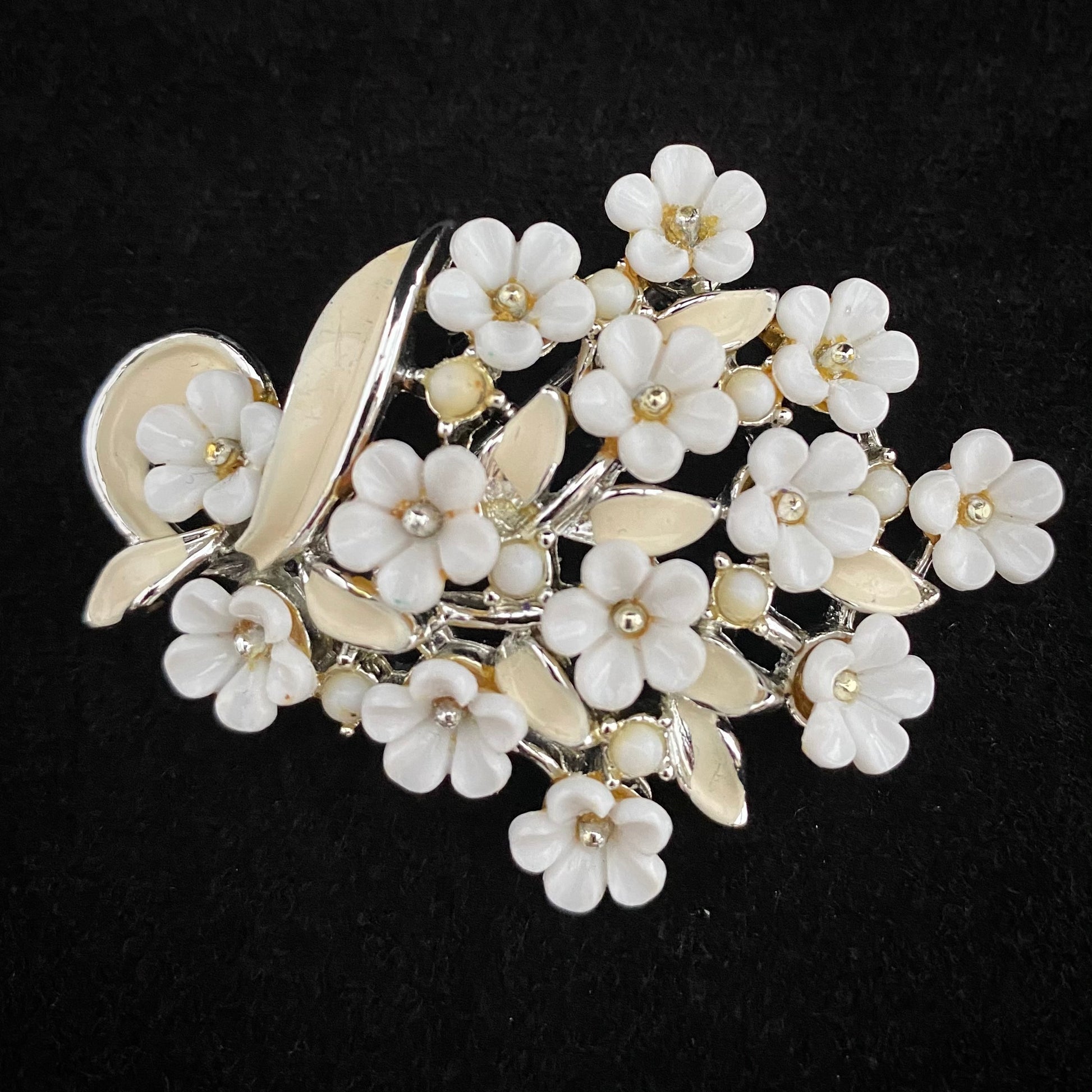 This beautiful floral brooch is by Art. The brooch features a bouquet of tiny, white, thermoset flowers with round silver-tone centers. The flowers are accented by small, white beads and enameled leaves. The brooch measures approximately 1¾” H x 1¾” W and closes with a locking C clasp. It is signed ART ©. The brooch is in excellent vintage condition.*