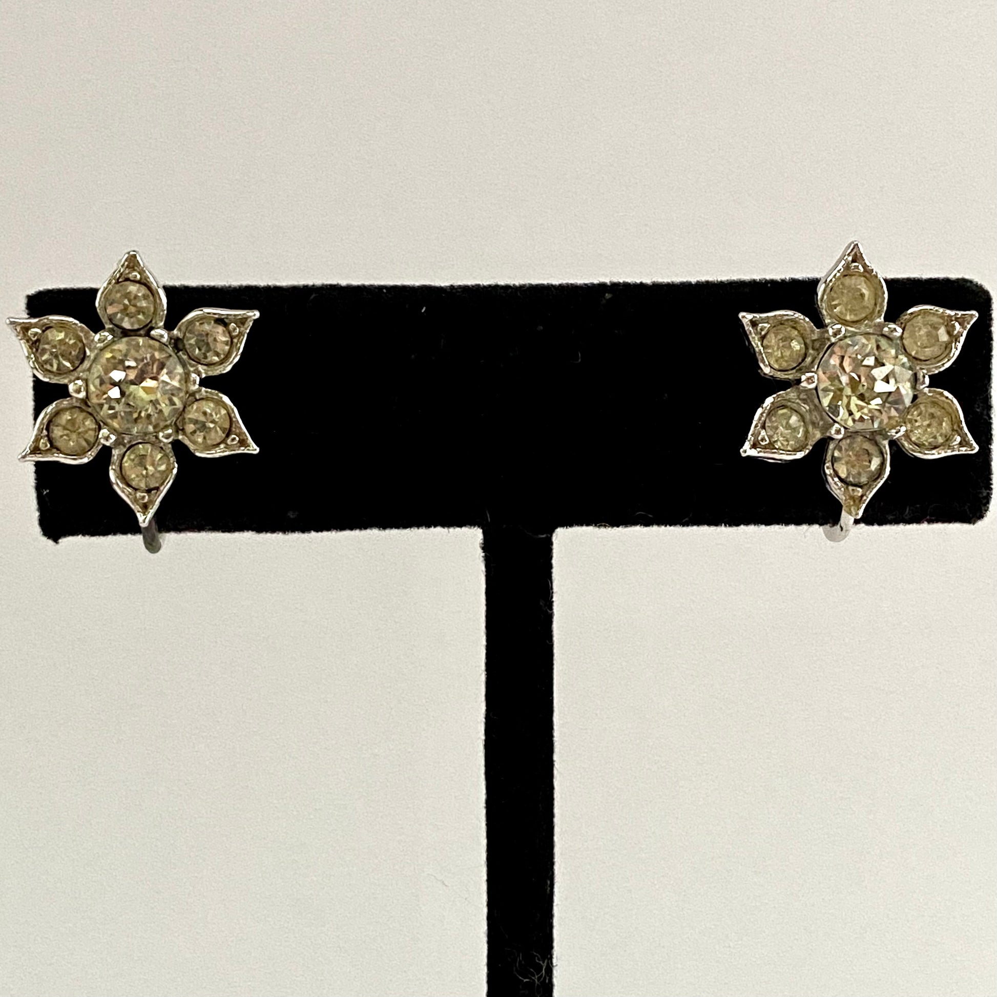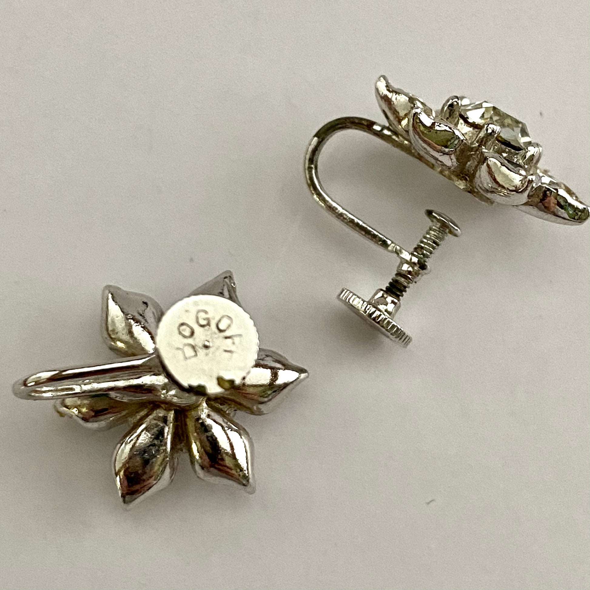 These beautiful Bogoff rhinestone earrings can be worn day or night. The silver-tone earrings are in the shape of a small flower. Each petal is a small clear rhinestone. The center is a large, clear, sparkling rhinestone. The earrings are signed BOGOFF on the earring screw backs. They measure approximately ¾” in diameter and are in excellent vintage condition.*
