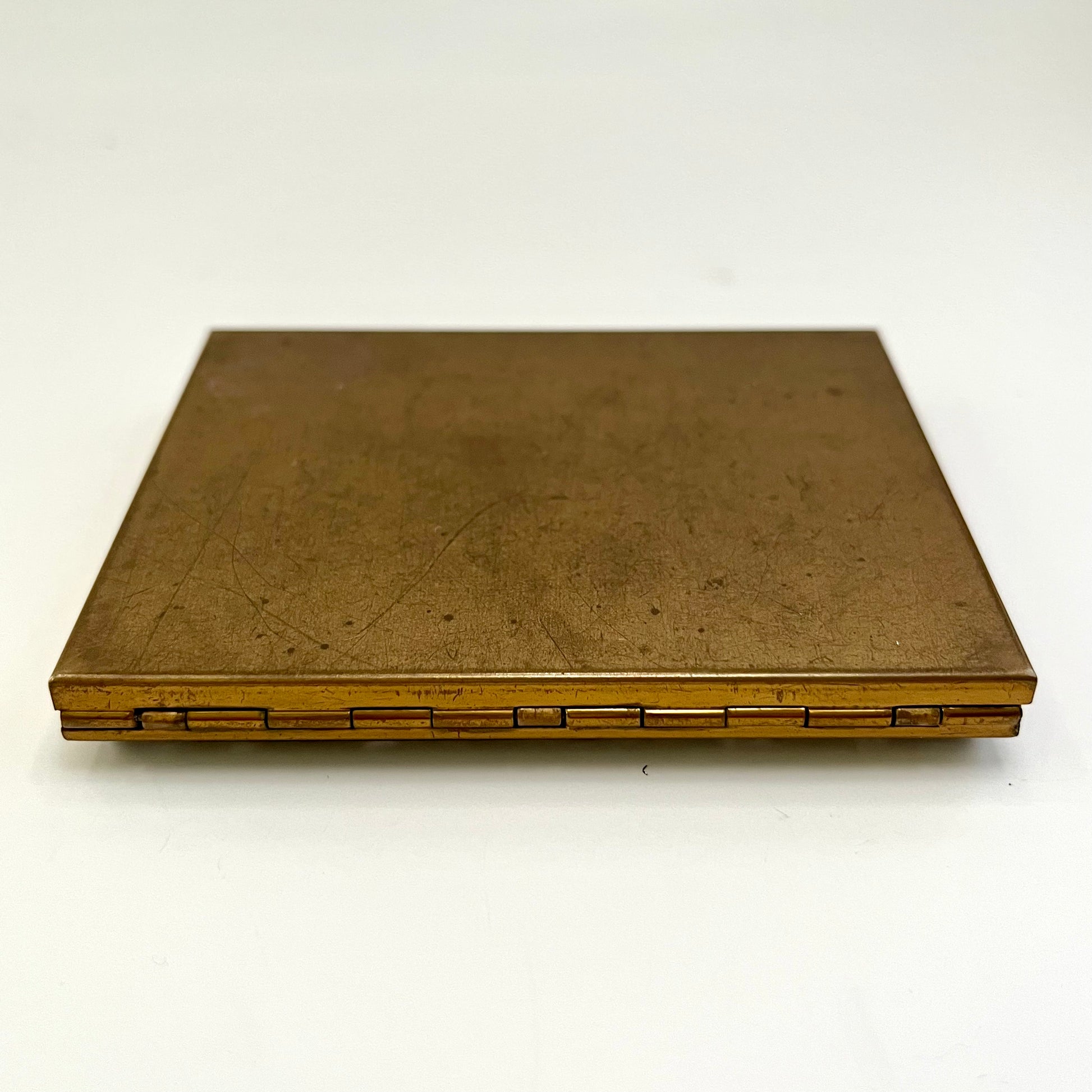 This amazing, vintage cigarette case is made of gold-tone metal. The top of the hinged case is a fantastic confetti lucite, clear with tiny, sparkling, silver stars. It opens with a push button clasp. The inside of the case is textured with gold-tone, overlapping circles. A moveable gold-tone arm lifts to allow the cigarettes, or any other thing you would like to carry, to be placed inside. It must be pushed down and click securely in place to hold the contents of the case. This case measures approximately 4” H x 3” W and is in excellent vintage condition.*