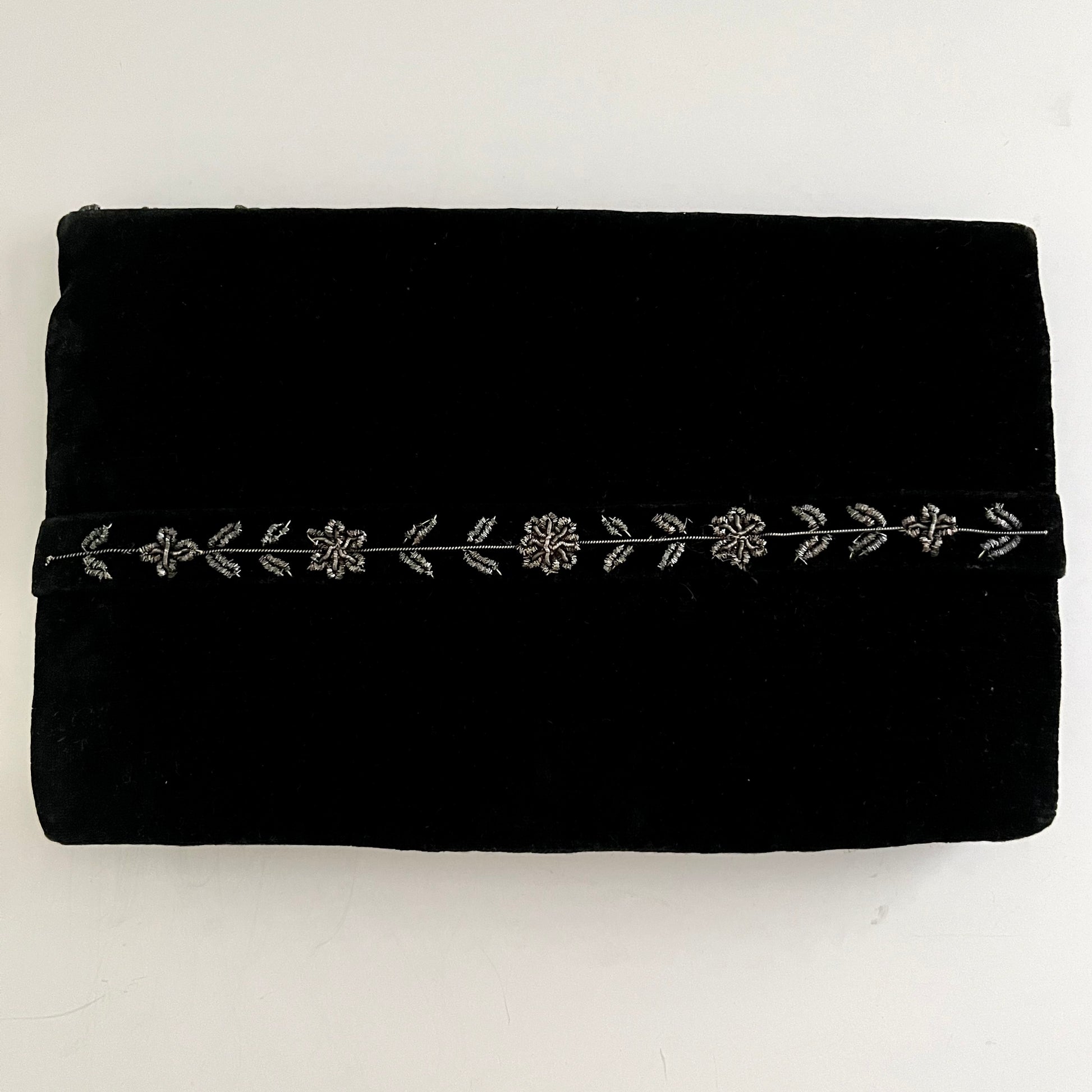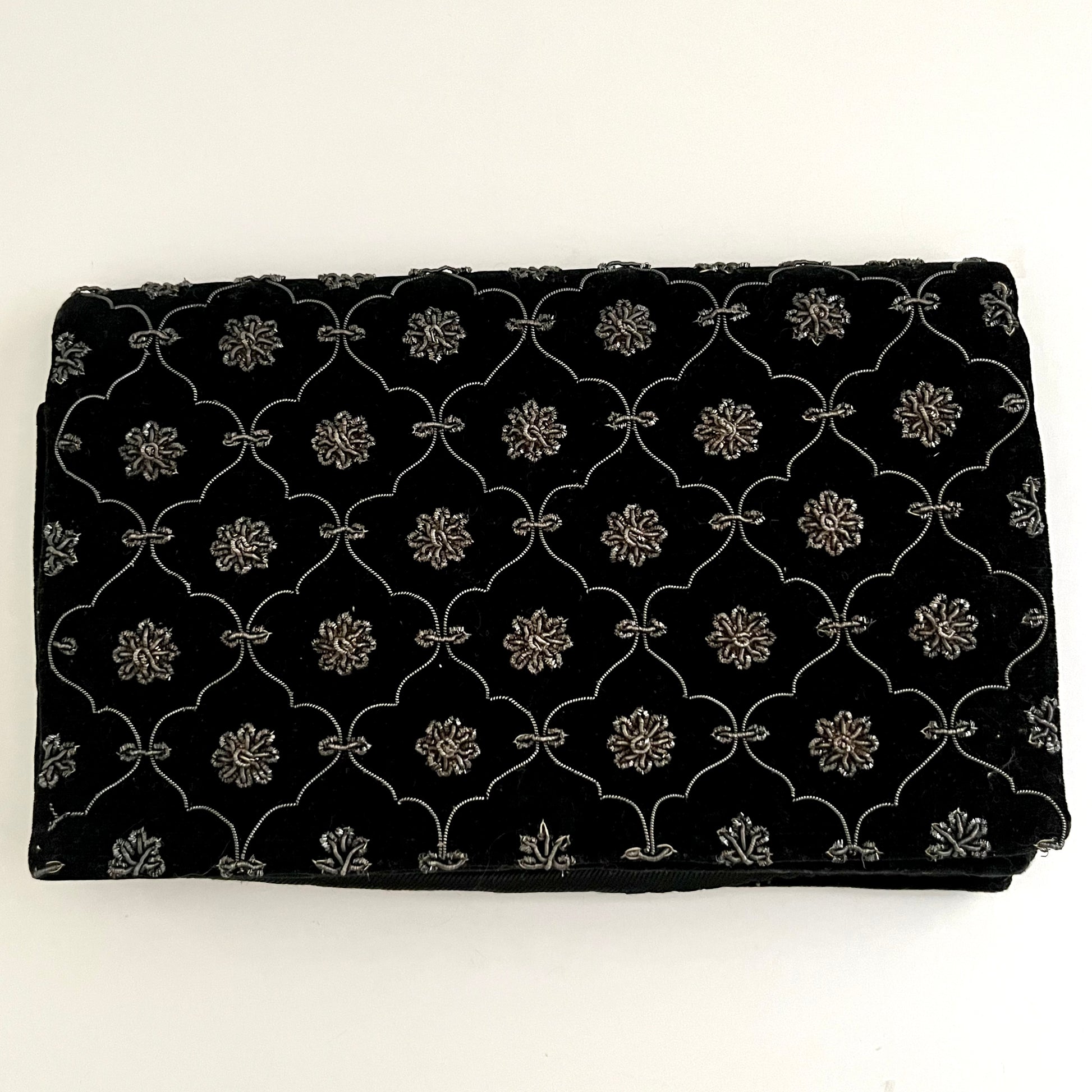 Style: This black velvet clutch is embroidered with genuine gold and silver thread and was made in New Delhi, India. The interior is fully lined and there are 3 interior wall pockets, two on one side and large one on the other side. It closes with a metal snap and there is a strap on the other side for your hand for easy carrying.