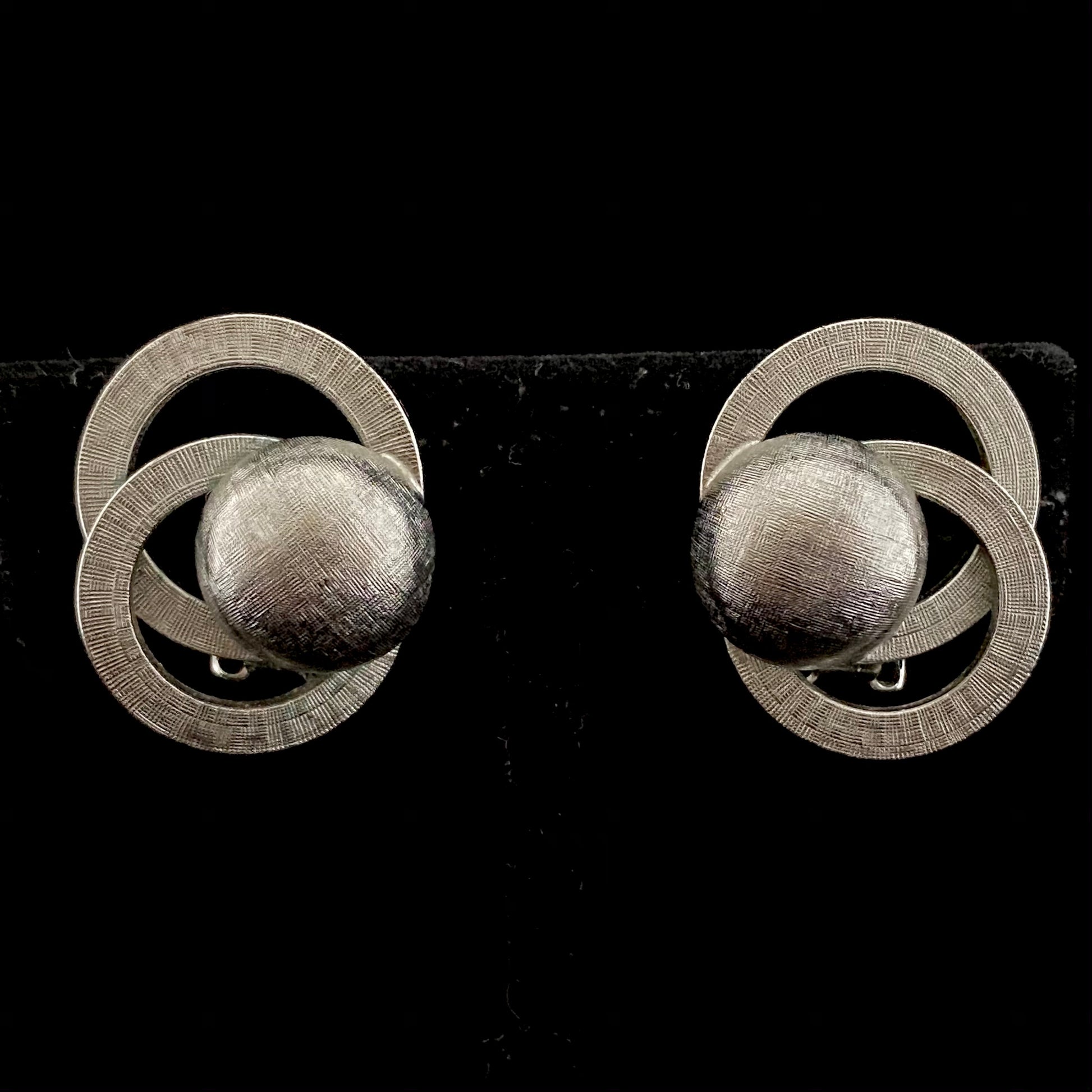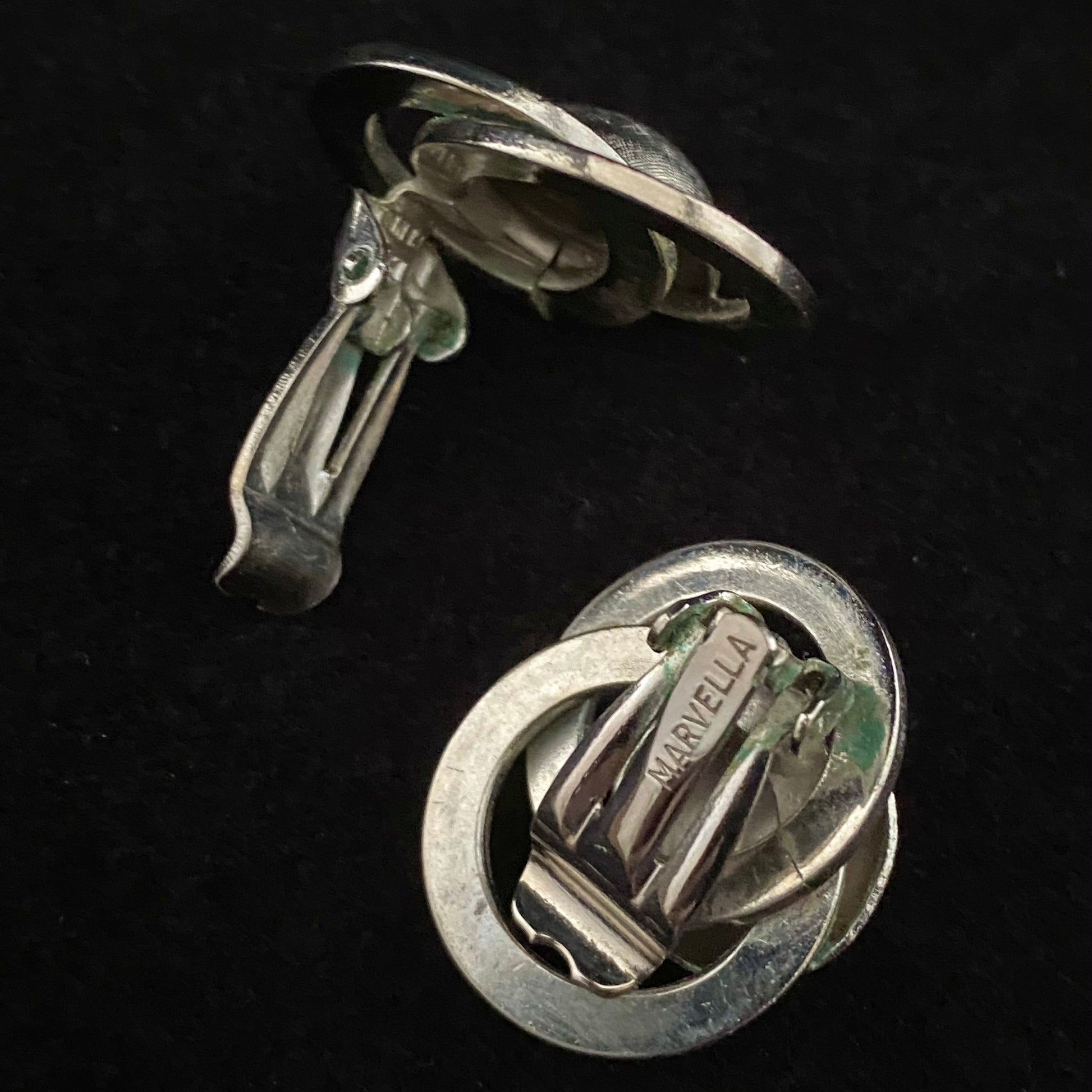 These unusual Marvella earrings feature 2 beautifully textured ¾” silver-tone rings that overlap each other. The rings are accented by a ½” textured silver-tone dome that covers one side where the rings overlap. The earrings are signed MARVELLA on the paddle back clasps. They measure approximately 1” H x 7/8” W and are in excellent vintage condition.