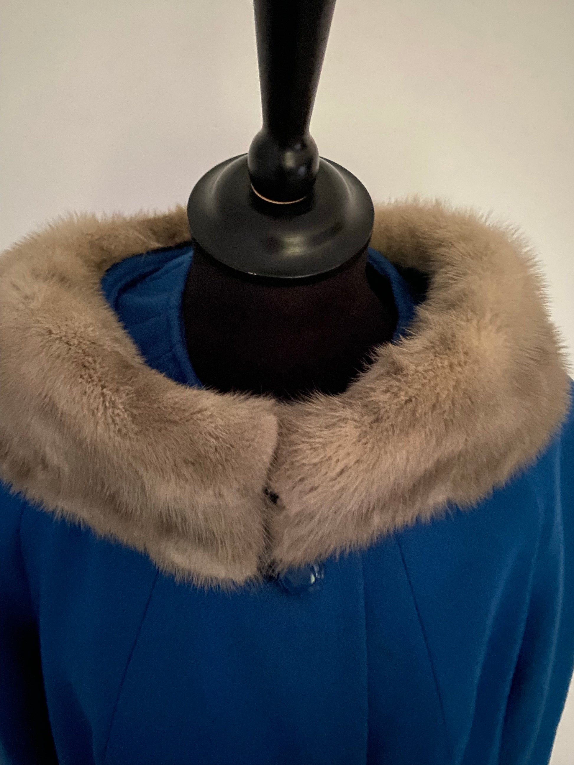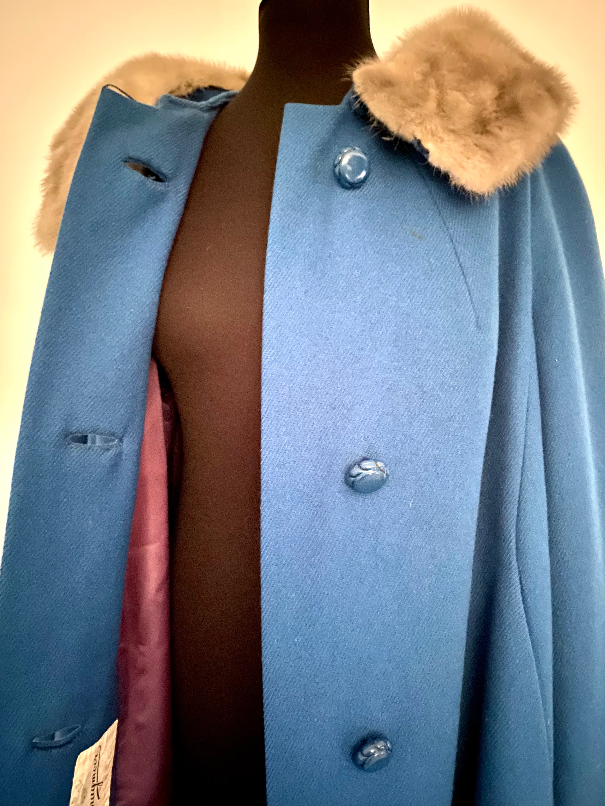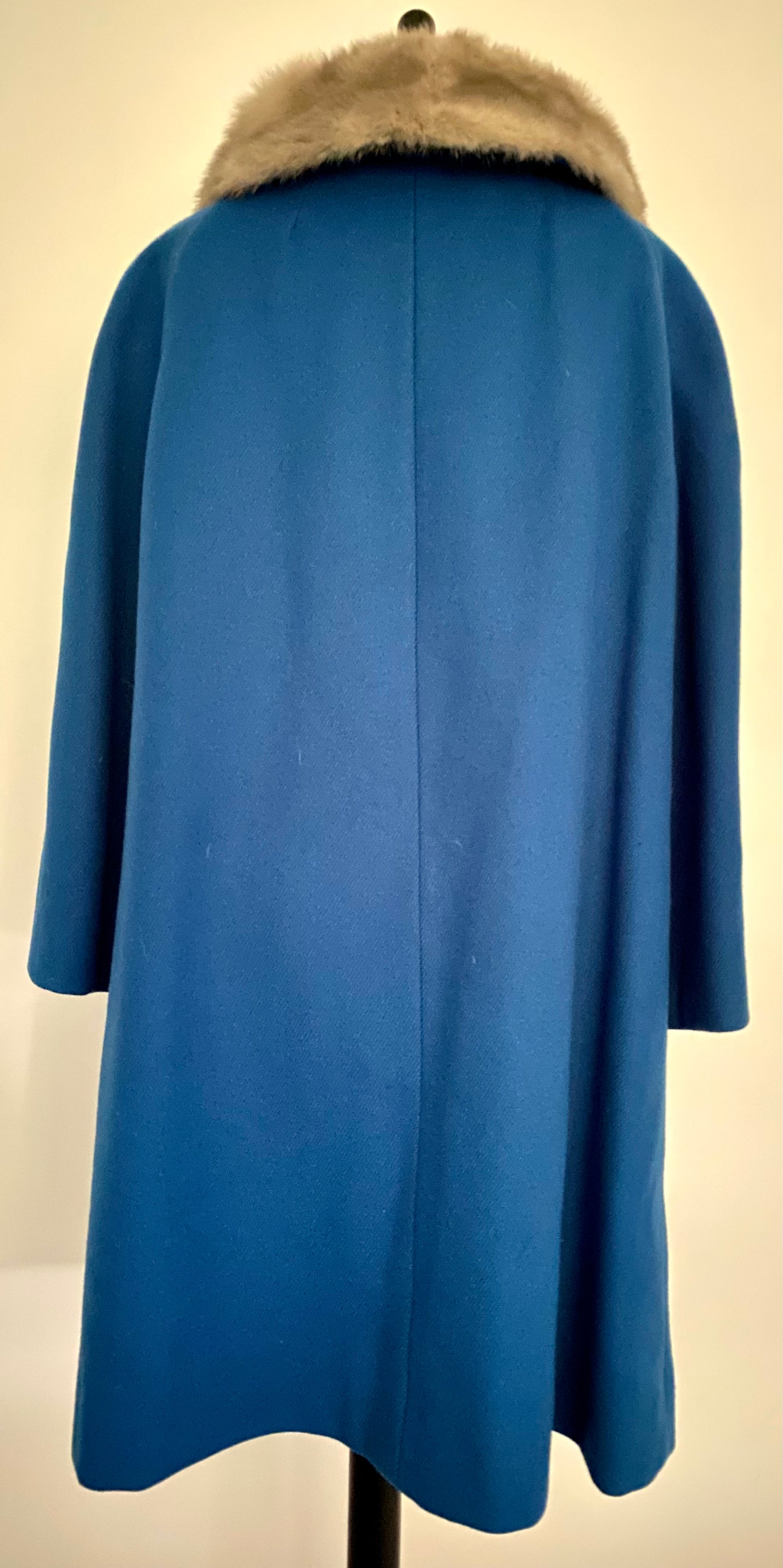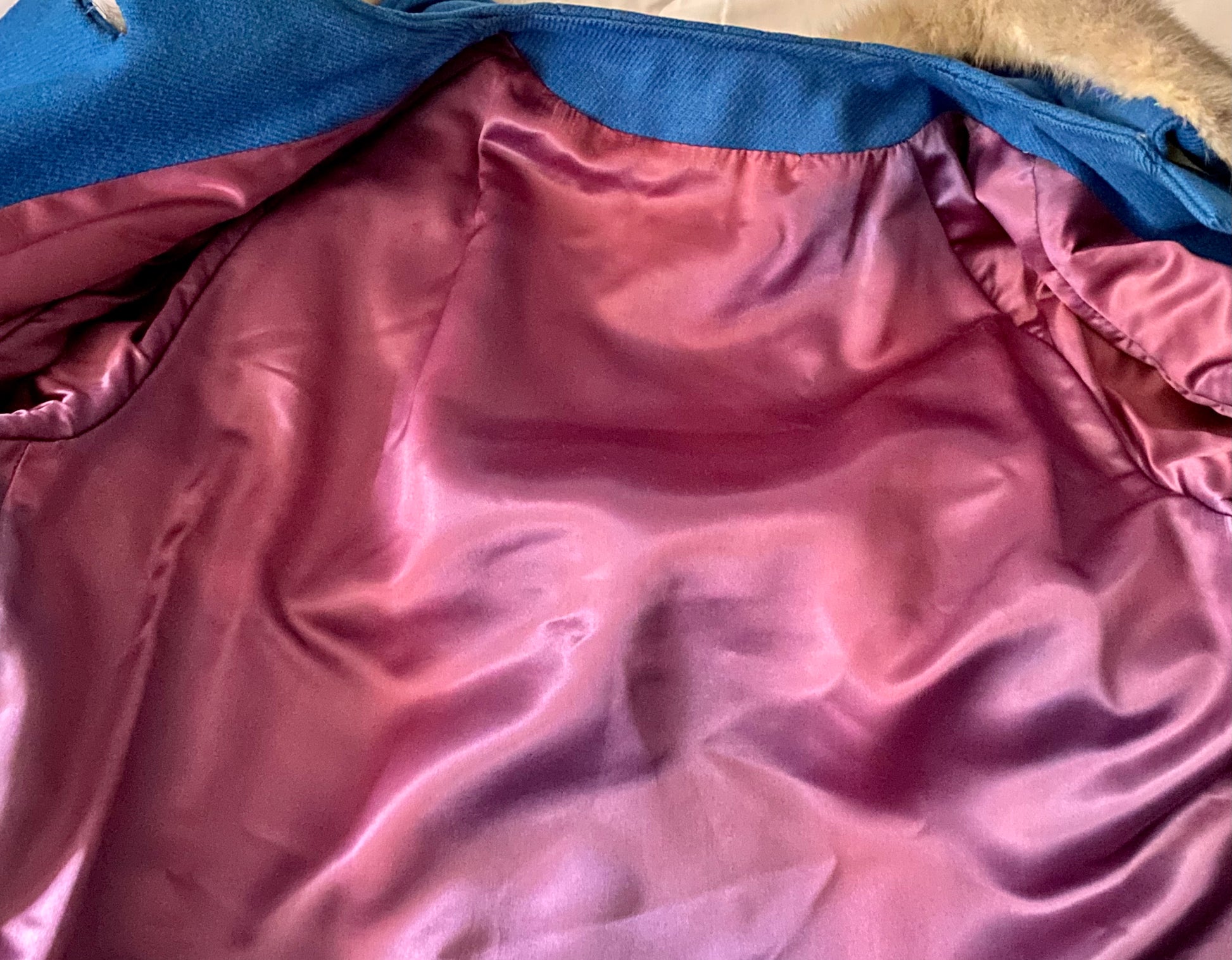 Style: This fur collared coat has dolman sleeves and a center front button entry. The buttons close with bound button holes. The sleeves are bracelet length & full at the opening. The front also has two pockets hidden in the seams. The collar can be worn flat and open or can be puffed up by closing the large hook and eye at the end of the collar. The coat is fully lined.