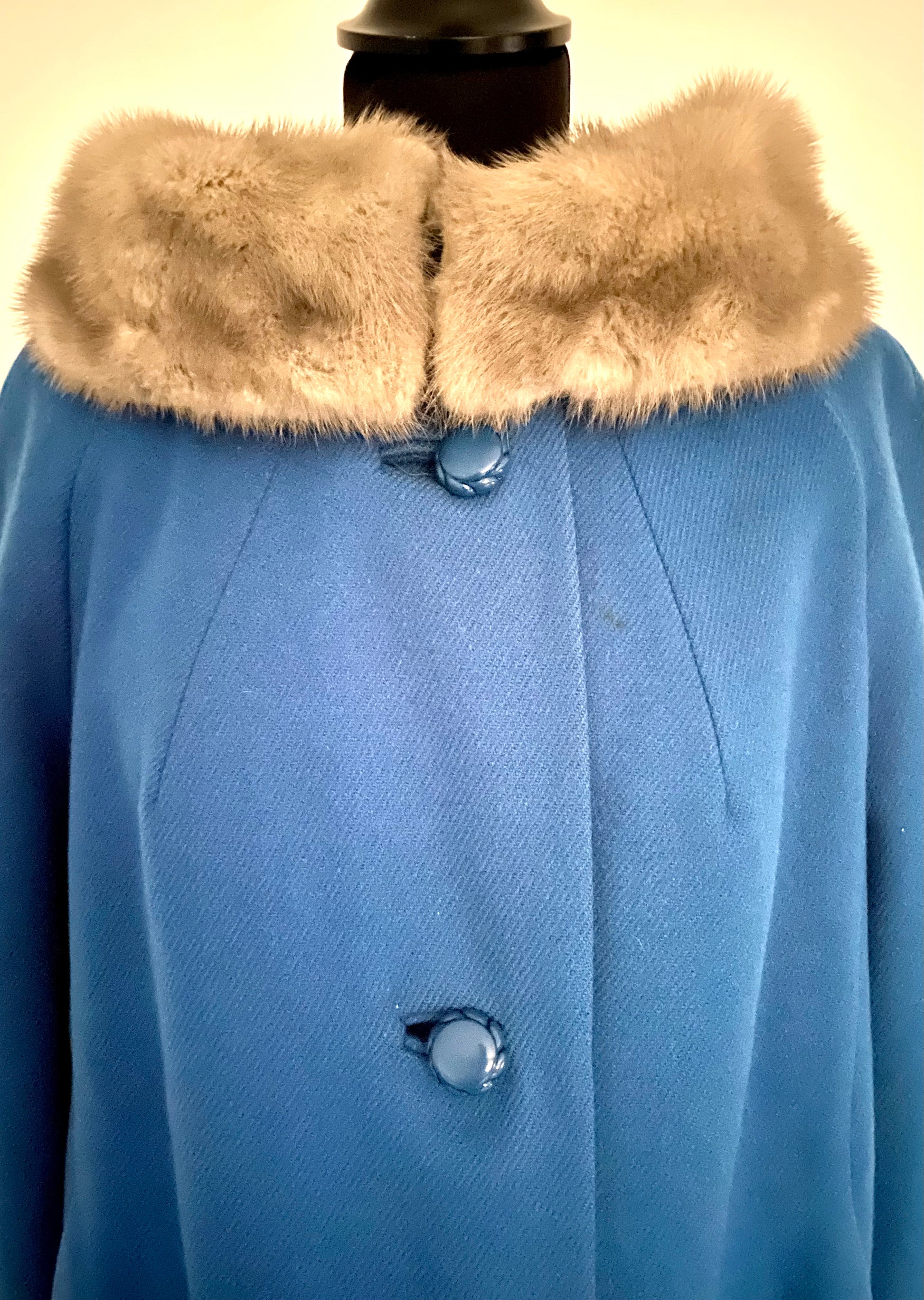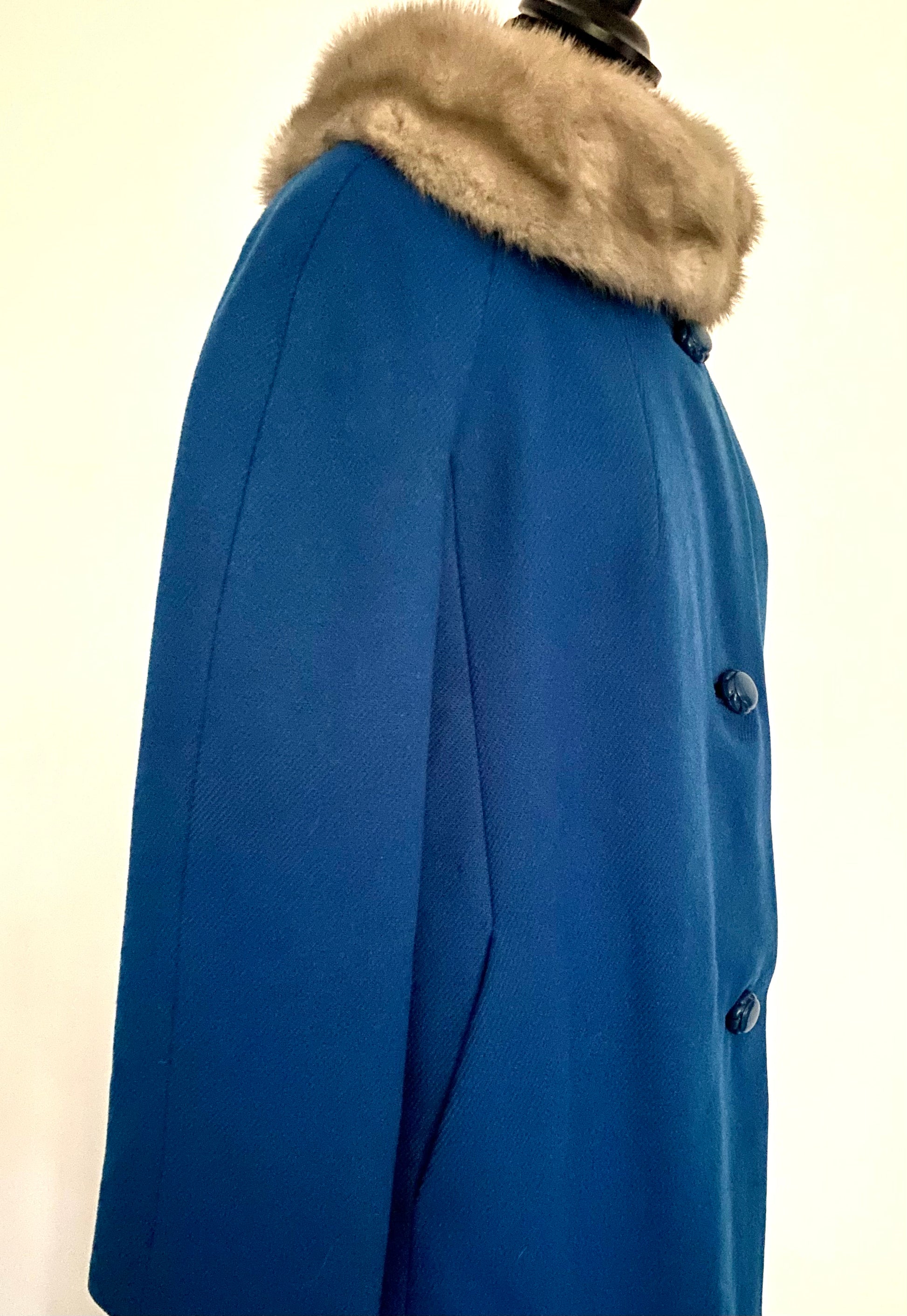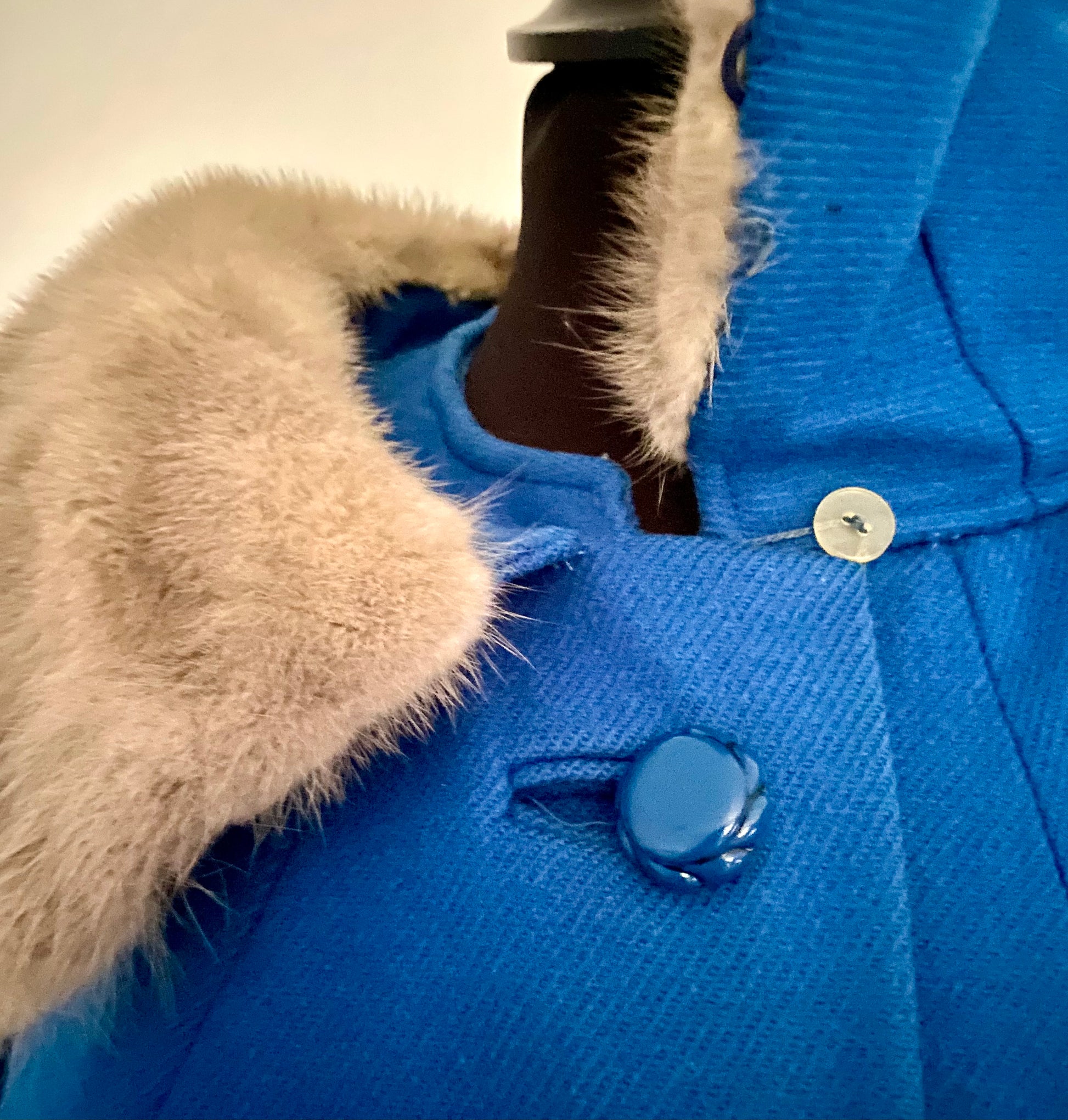 Style: This fur collared coat has dolman sleeves and a center front button entry. The buttons close with bound button holes. The sleeves are bracelet length & full at the opening. The front also has two pockets hidden in the seams. The collar can be worn flat and open or can be puffed up by closing the large hook and eye at the end of the collar. The coat is fully lined.