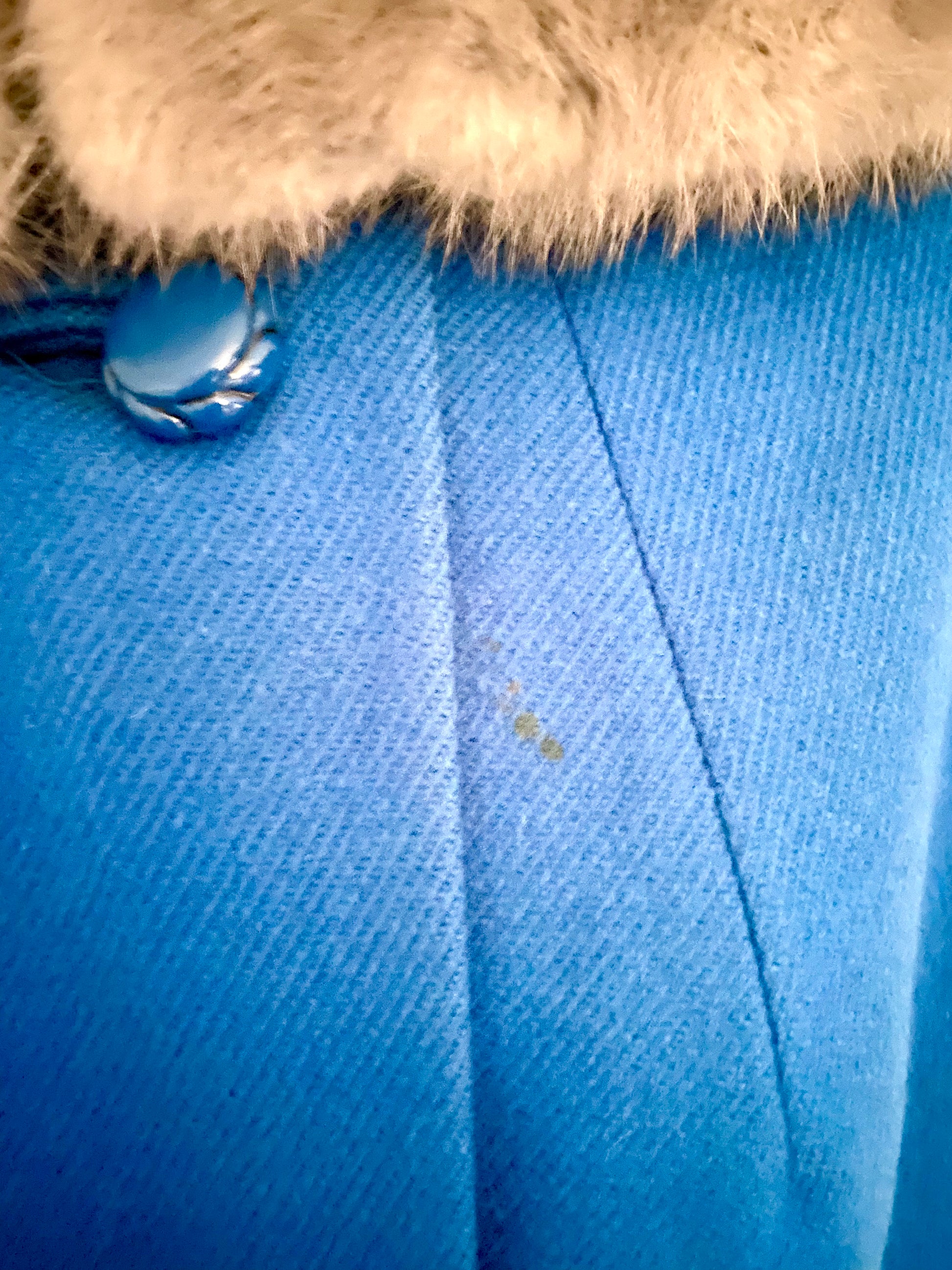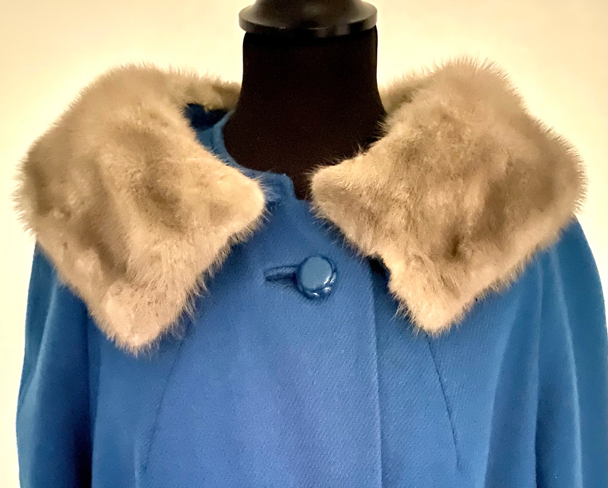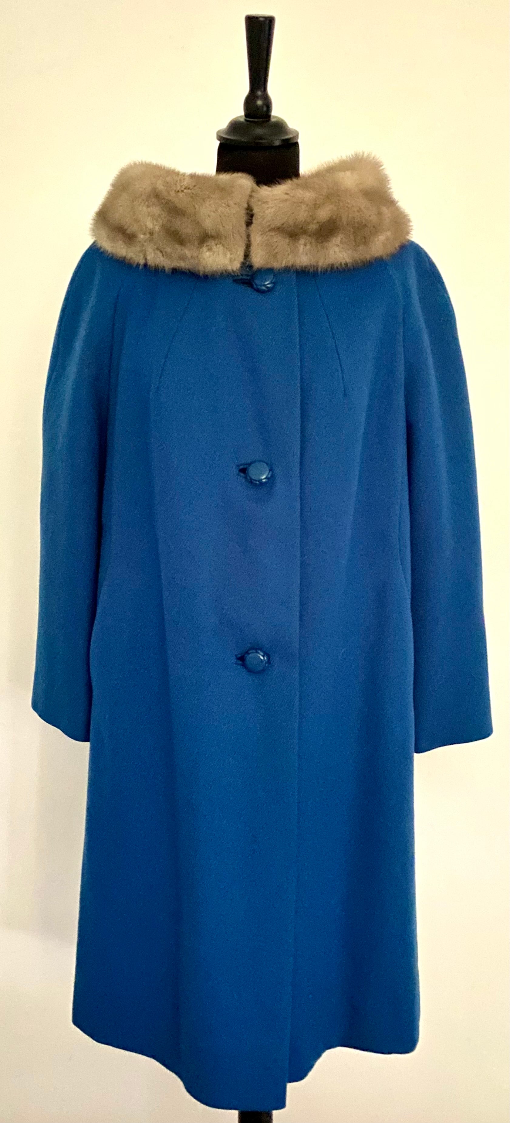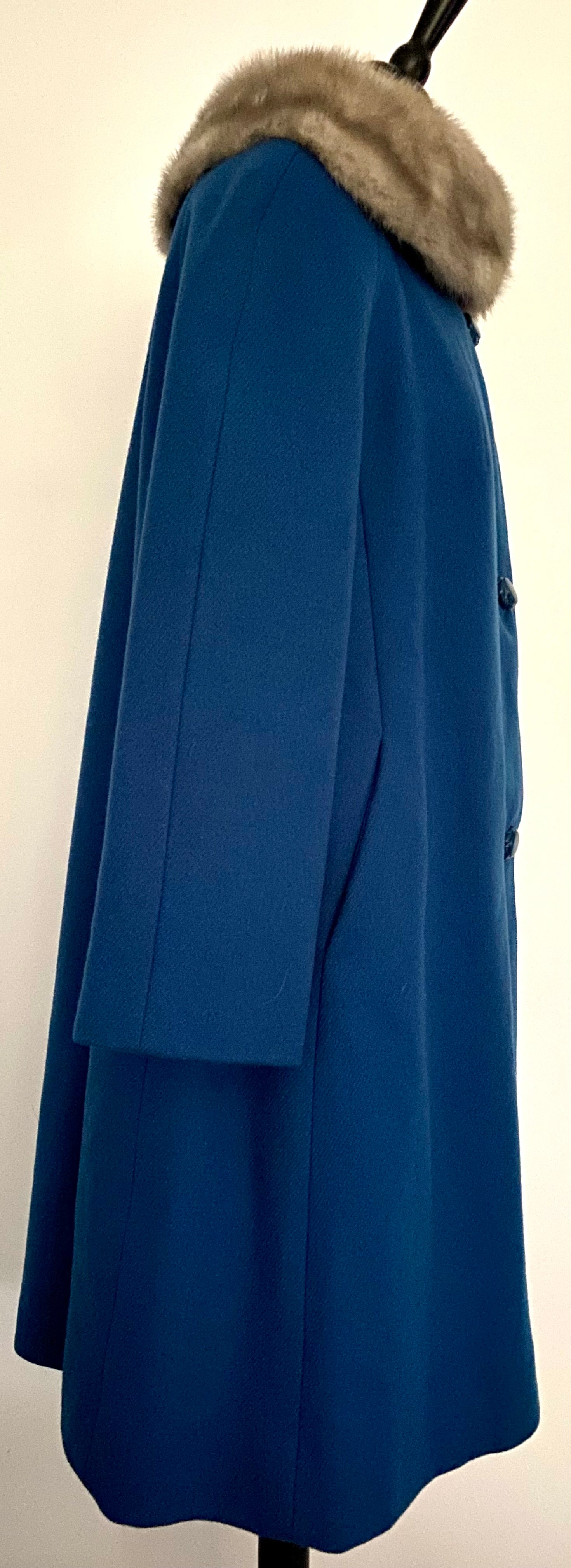 Style: This fur collared coat has dolman sleeves and a center front button entry. The buttons close with bound button holes. The sleeves are bracelet length & full at the opening. The front also has two pockets hidden in the seams. The collar can be worn flat and open or can be puffed up by closing the large hook and eye at the end of the collar. The coat is fully lined.