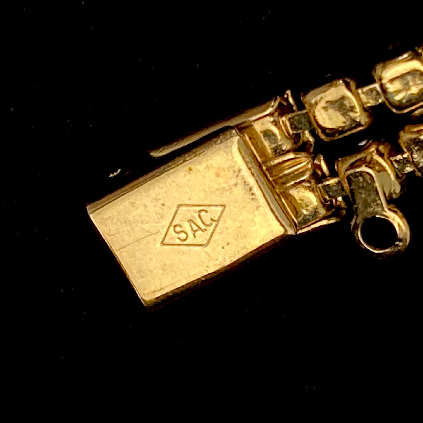 This beautiful Sarah Coventry bracelet is a piece of the Celestial Fire jewelry line. It begins with a large, clear, round rhinestone in the center of a base strand of smaller, round rhinestones. Six graduated gold-tone circles accent the prong set rhinestones. The bracelet band features a double row of the alternating pattern of small gold bars and rhinestones that match the necklace chain. The bracelet measures approximately 7” and closes with a hidden box clasp.The bracelet also has a safety chain for loss prevention. Although the original Sarah Coventry Celestial Fire line was unsigned, this bracelet is signed SAC in a diamond shape. It is in excellent vintage condition.
