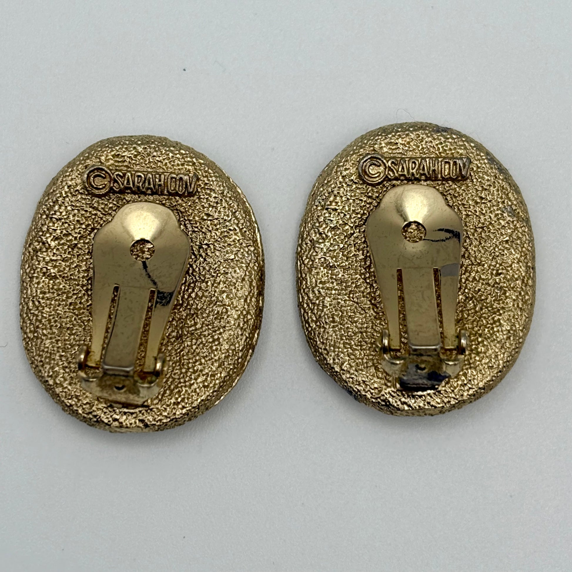 This fantastic pair of Sarah Coventry earrings are from the 1959 Sultana collection. The earrings are large, slightly domed, gold-tone oval shapes. They feature raised polished gold rectangle, triangle, square, diamond and circle shapes on the textured gold-tone ovals. Random round, sparkling, colored rhinestones accent the earrings. The earrings measure approximately 1¼” H x 1” W and close with paddle back clips. They are signed SARAHCOV on the back of the earrings. These earrings are in excellent vintage condition.