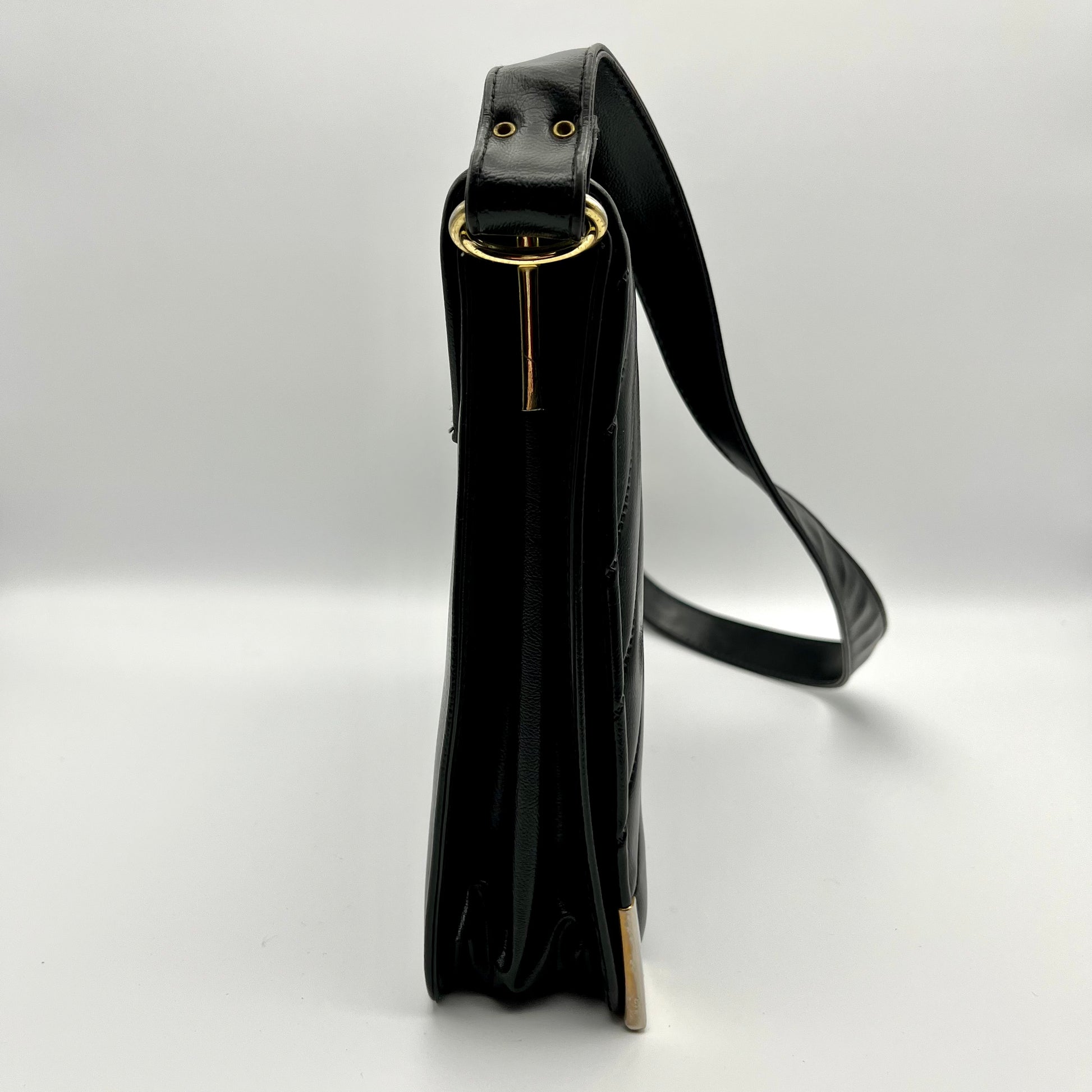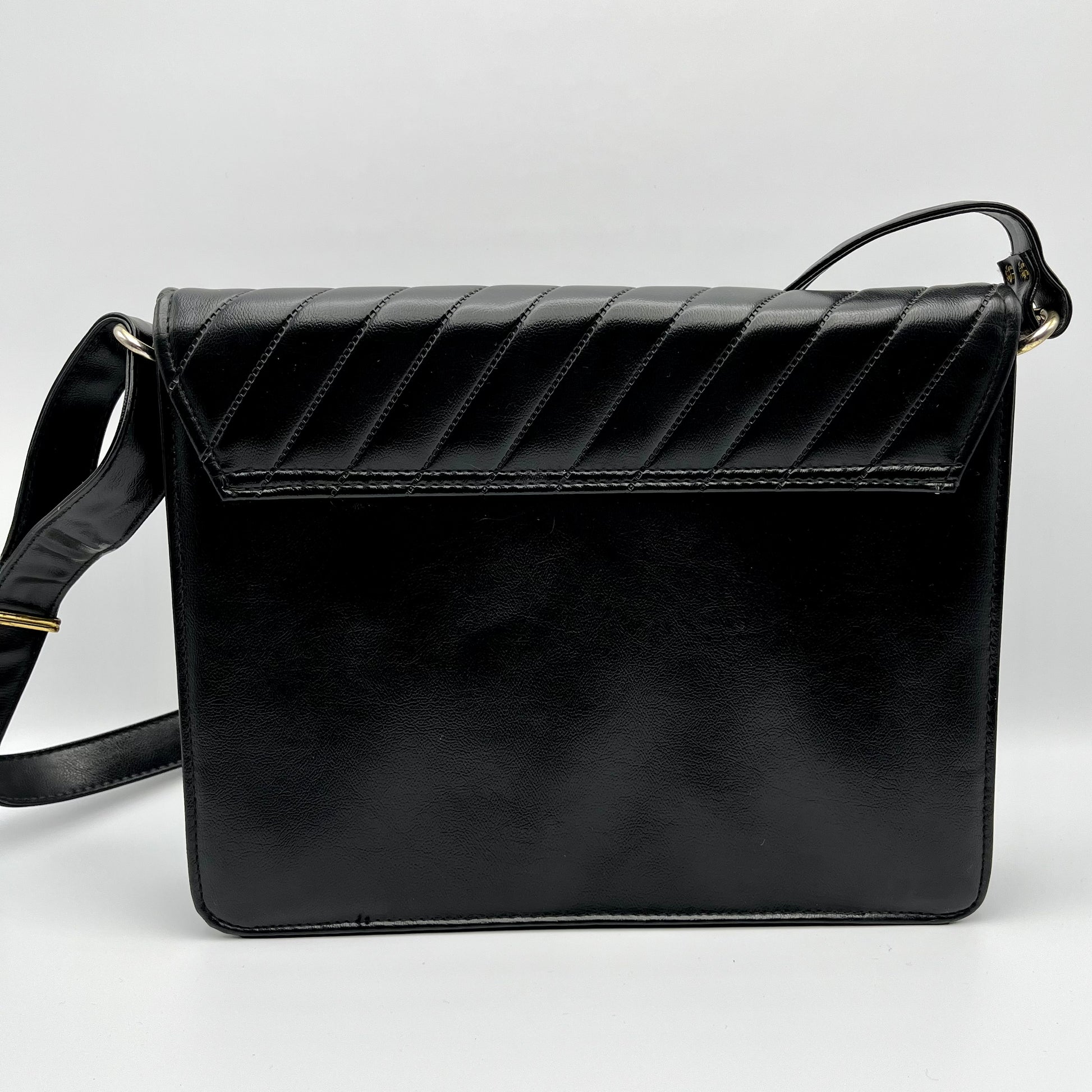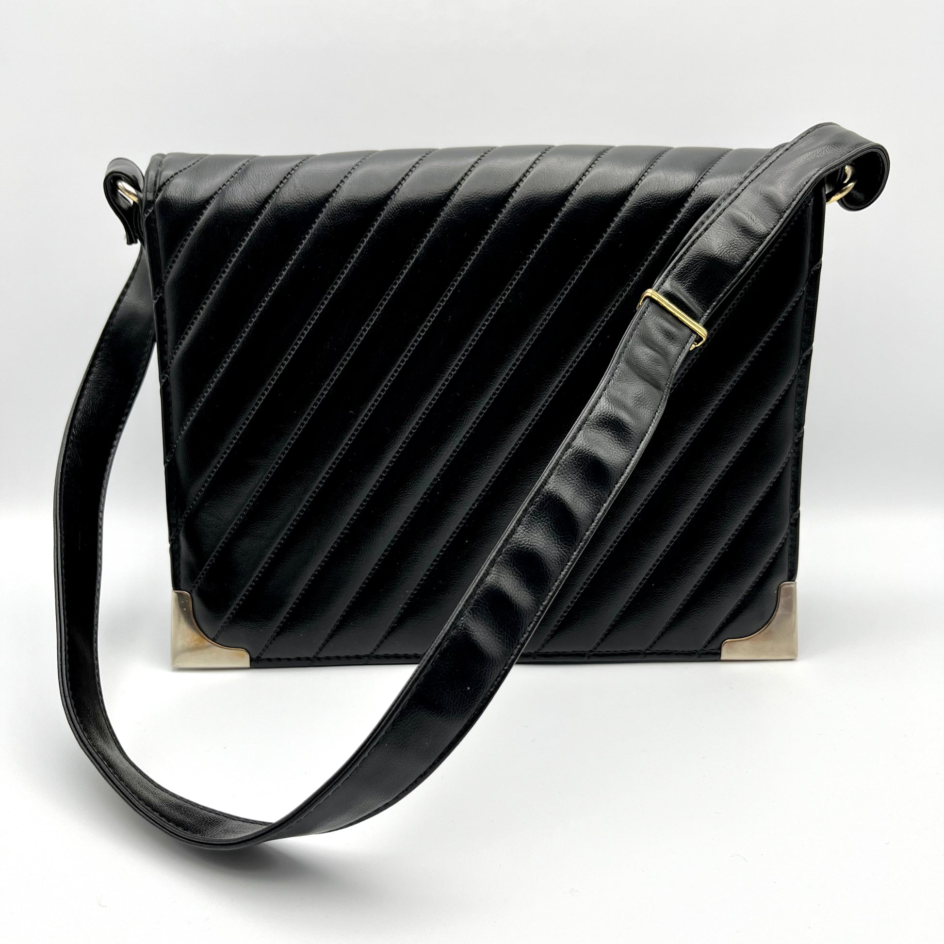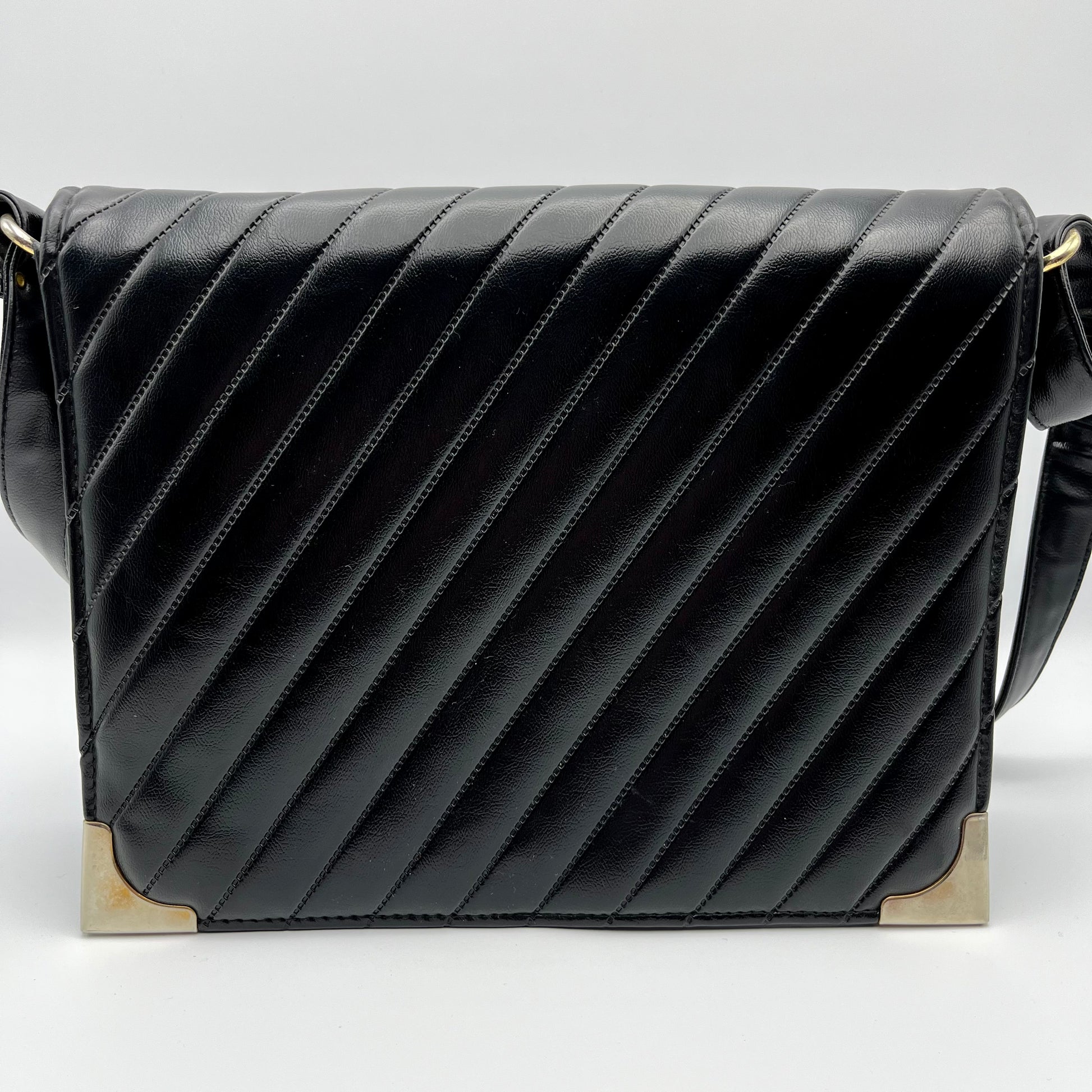 Style: This black faux leather shoulder bag has a large flap with diagonal topstitching details and closes with a metal snap. Inside there are three compartments. The center one closes with a metal zipper. Another compartment also has an interior wall pocket that closes with a metal zipper. The shoulder strap length can be adjusted on one side.