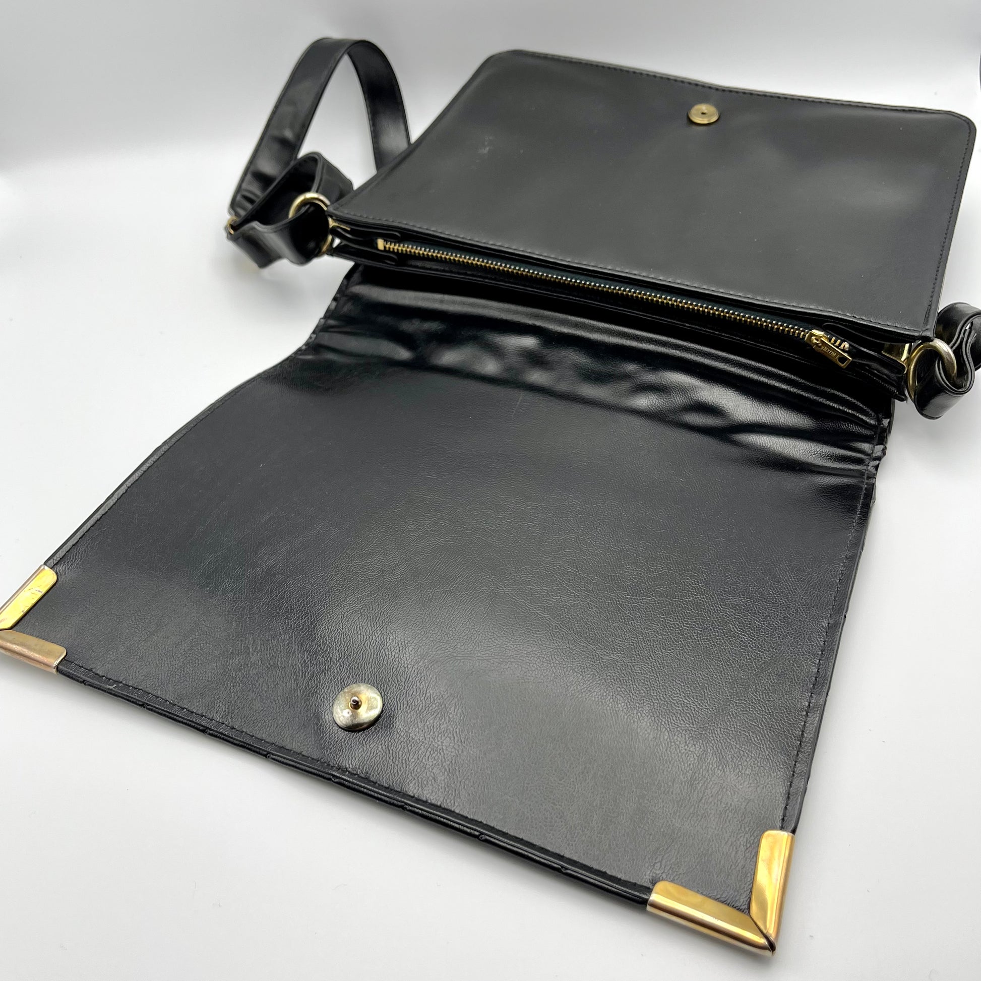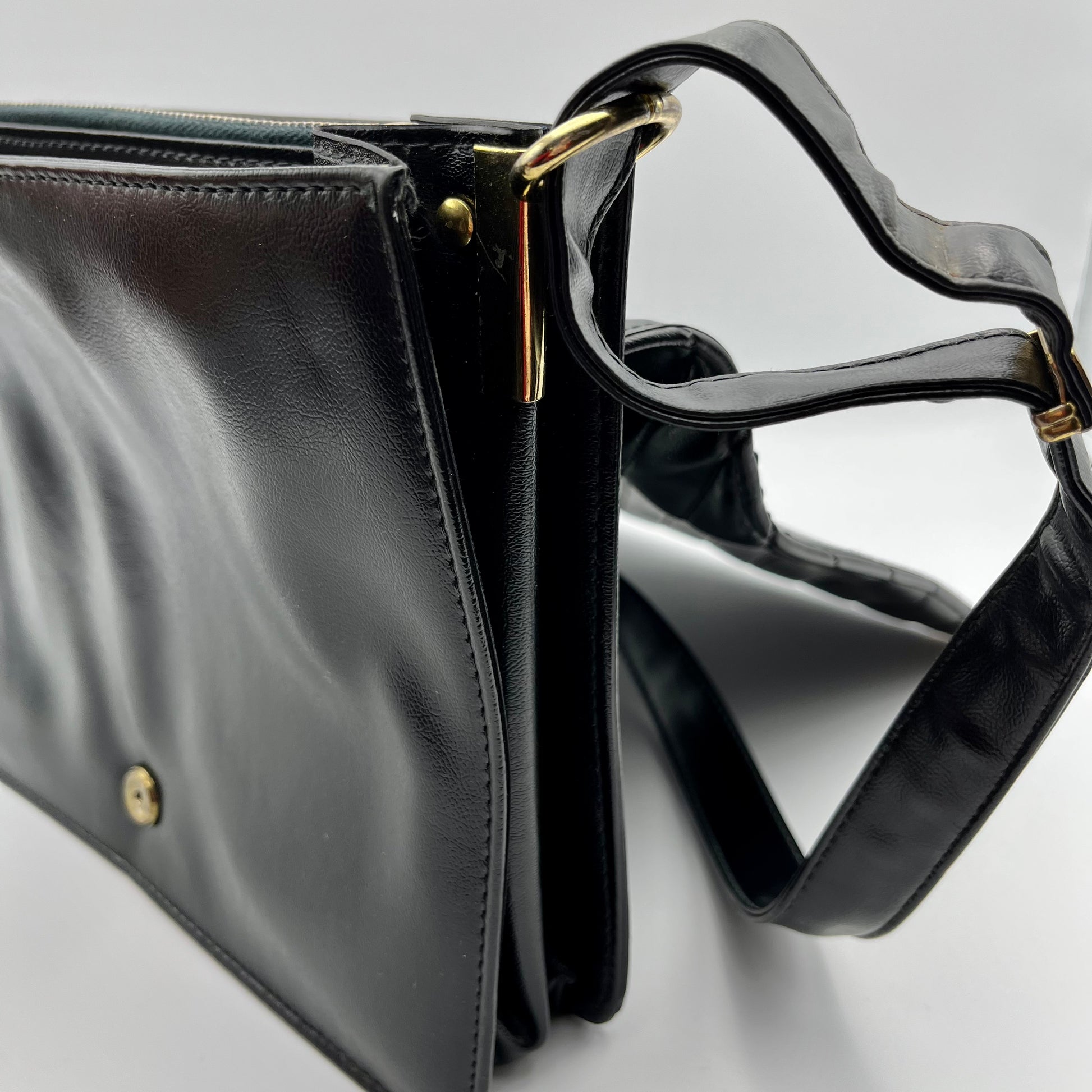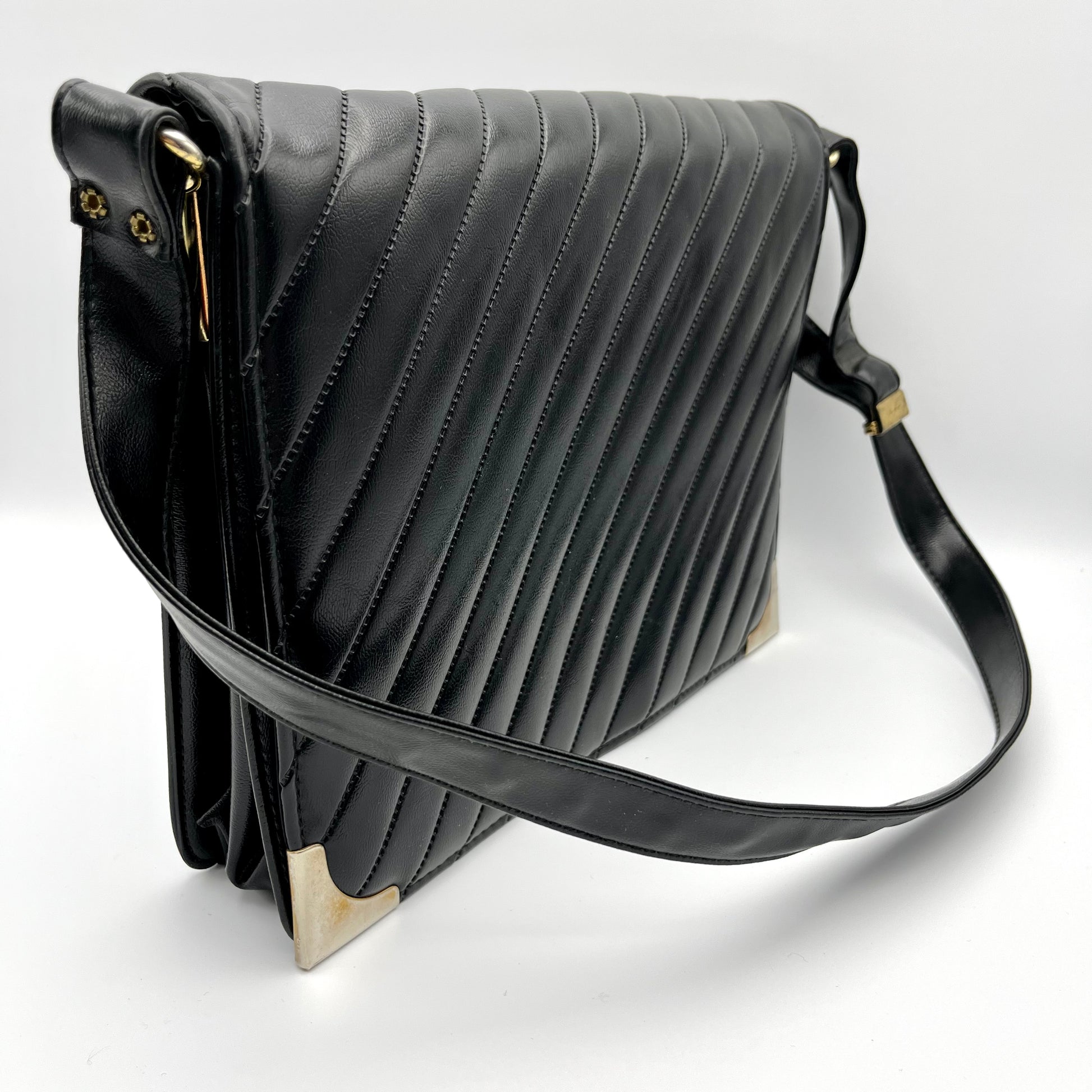 Style: This black faux leather shoulder bag has a large flap with diagonal topstitching details and closes with a metal snap. Inside there are three compartments. The center one closes with a metal zipper. Another compartment also has an interior wall pocket that closes with a metal zipper. The shoulder strap length can be adjusted on one side.