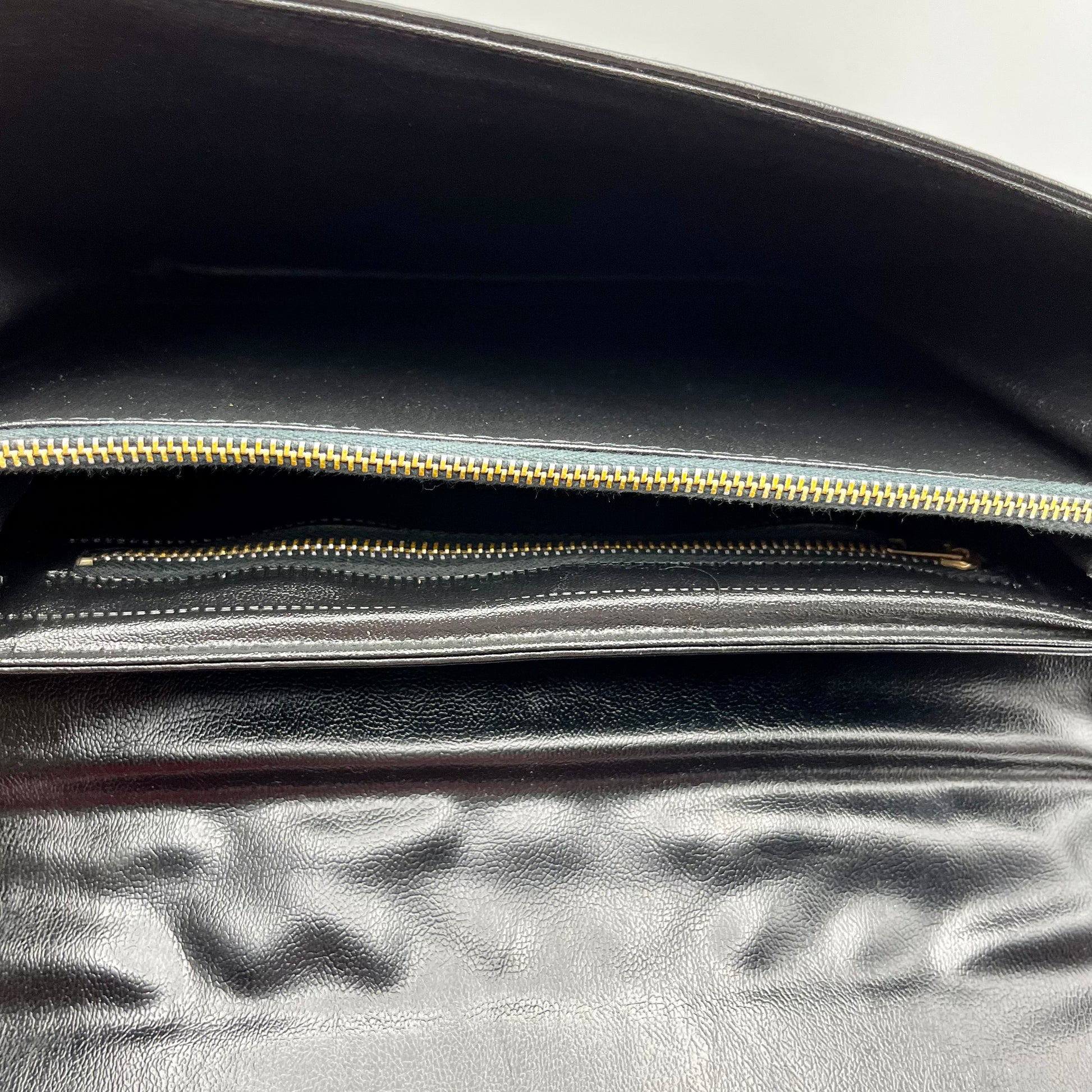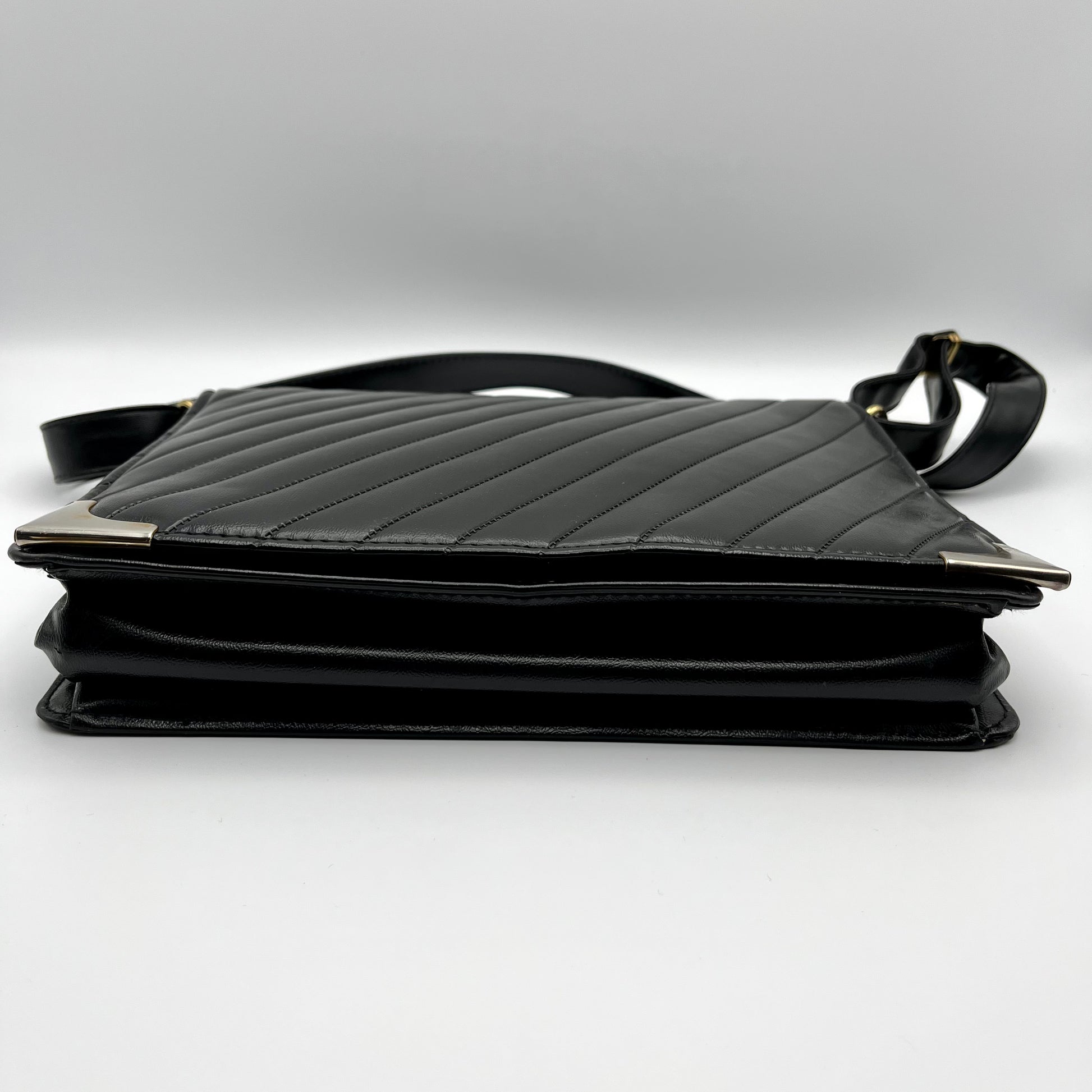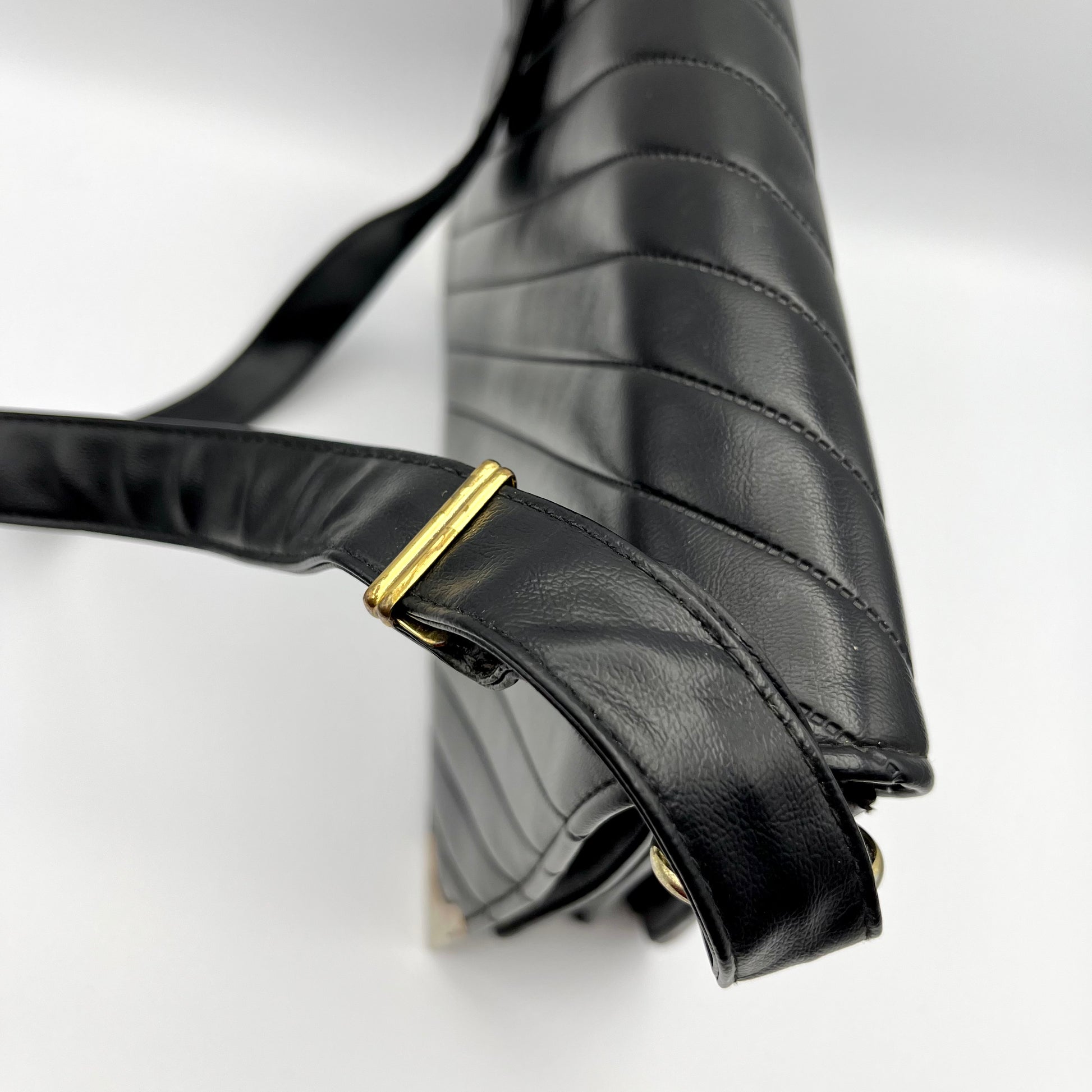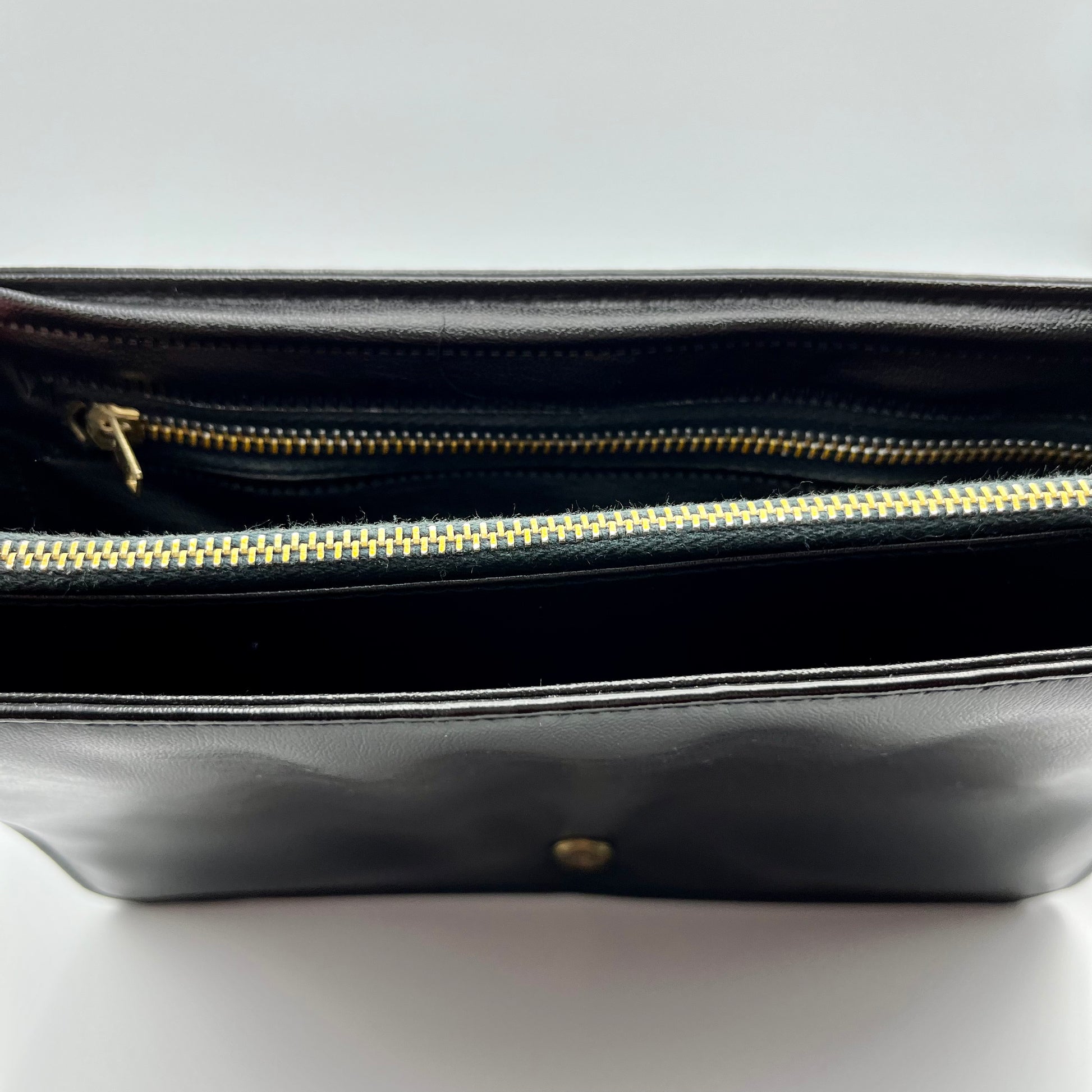 Style: This black faux leather shoulder bag has a large flap with diagonal topstitching details and closes with a metal snap. Inside there are three compartments. The center one closes with a metal zipper. Another compartment also has an interior wall pocket that closes with a metal zipper. The shoulder strap length can be adjusted on one side.