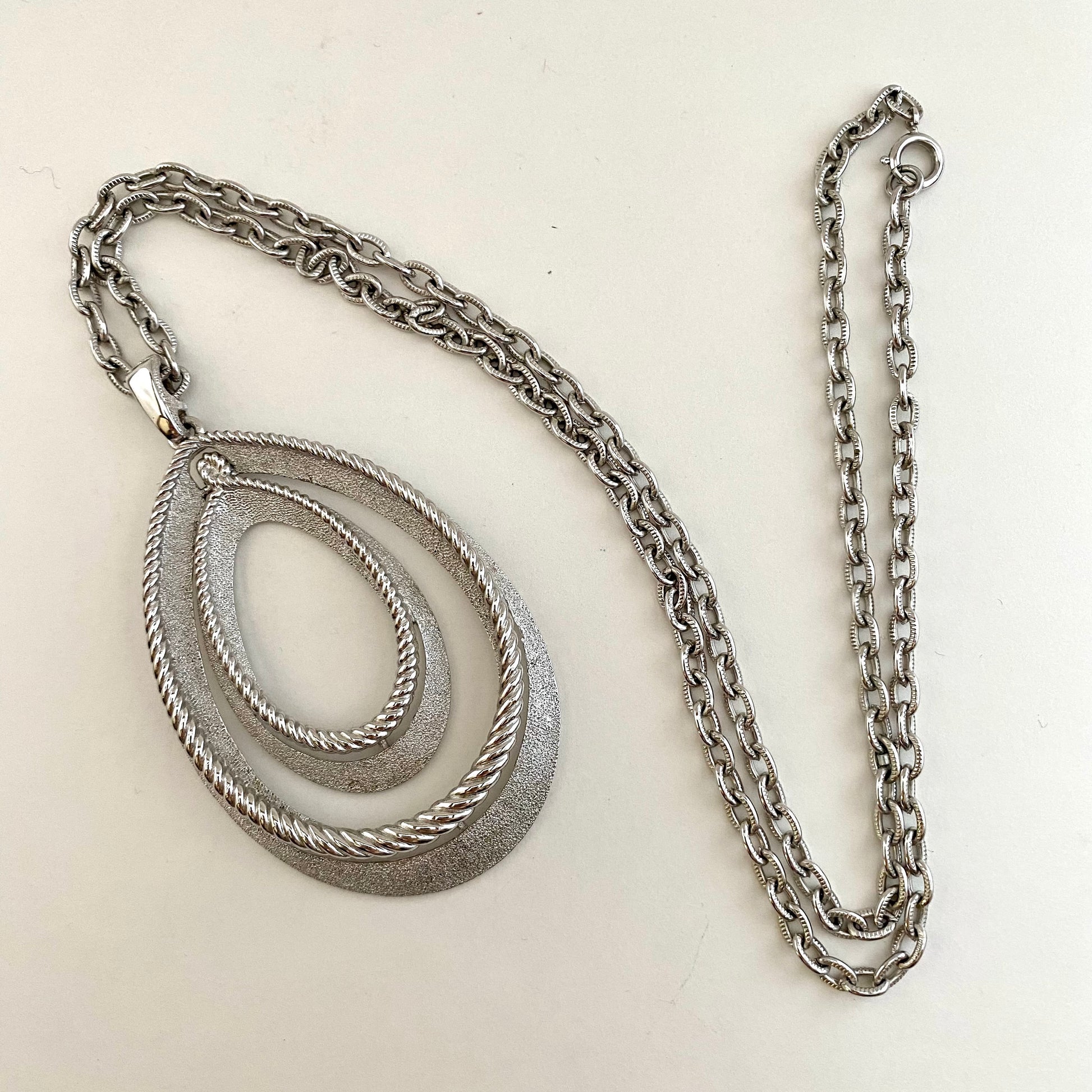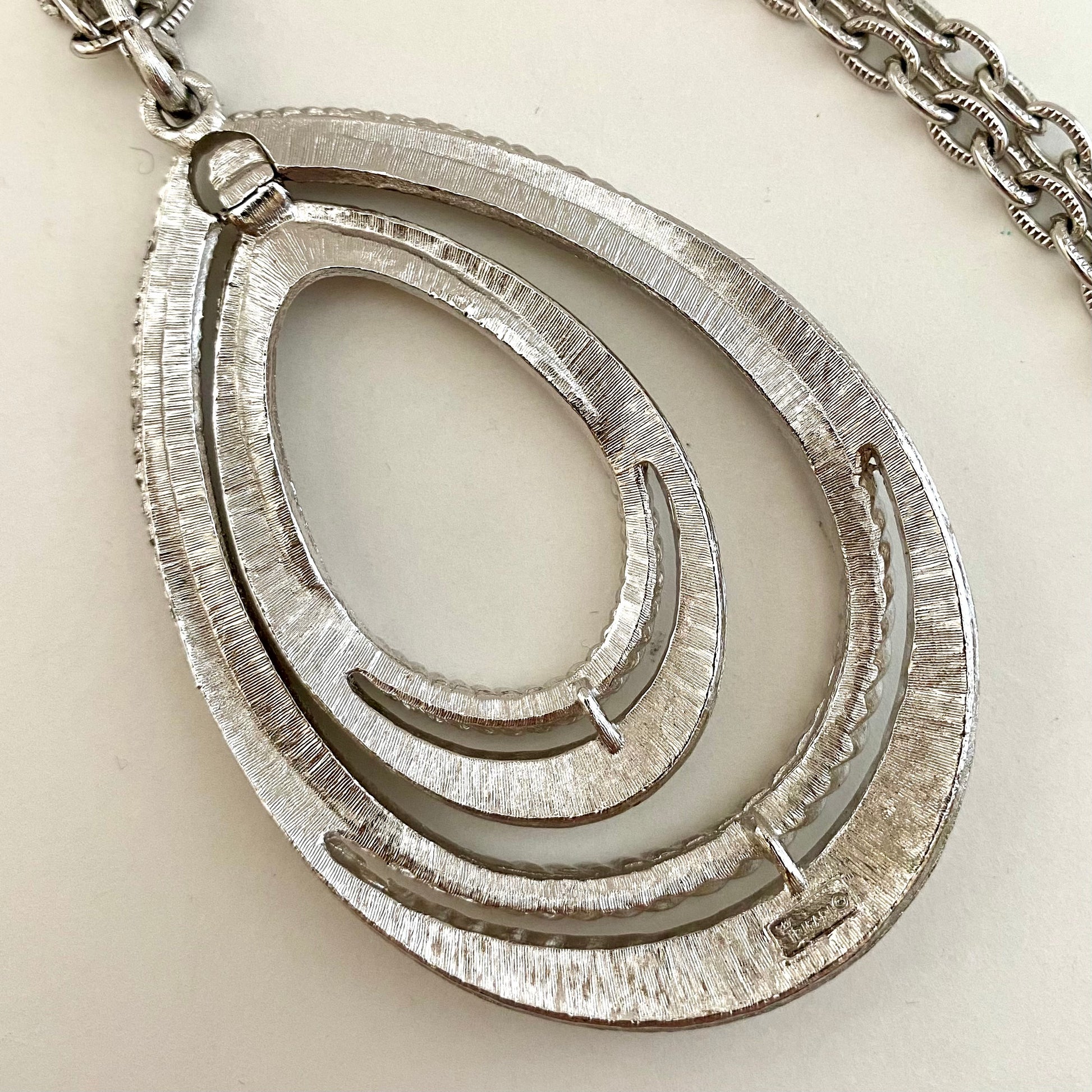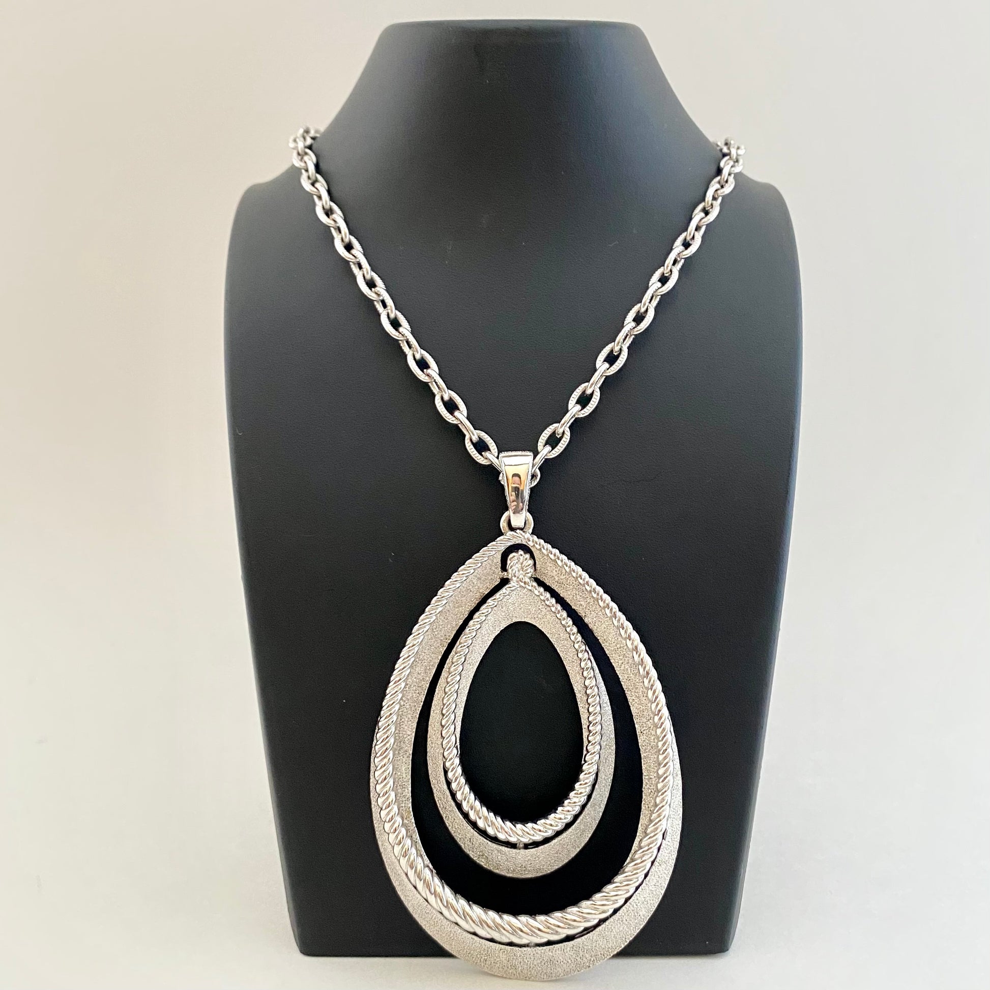 This big and bold pendant necklace is a Crown Trifari design. The necklace features a large, 3½” silver-tone pendant that consists of 2 sizes of open work teardrop shapes. The larger teardrop is brushed silver-tone. A polished, silver-tone rope outlines the top of the teardrop. The smaller teardrop is exactly the same and fits right inside the large one. The pendant is suspended from a textured cable chain. The chain measures approximately 29” and closes with a spring ring clasp. The necklace is signed Crown TRIFARI ©. It is in excellent vintage condition.