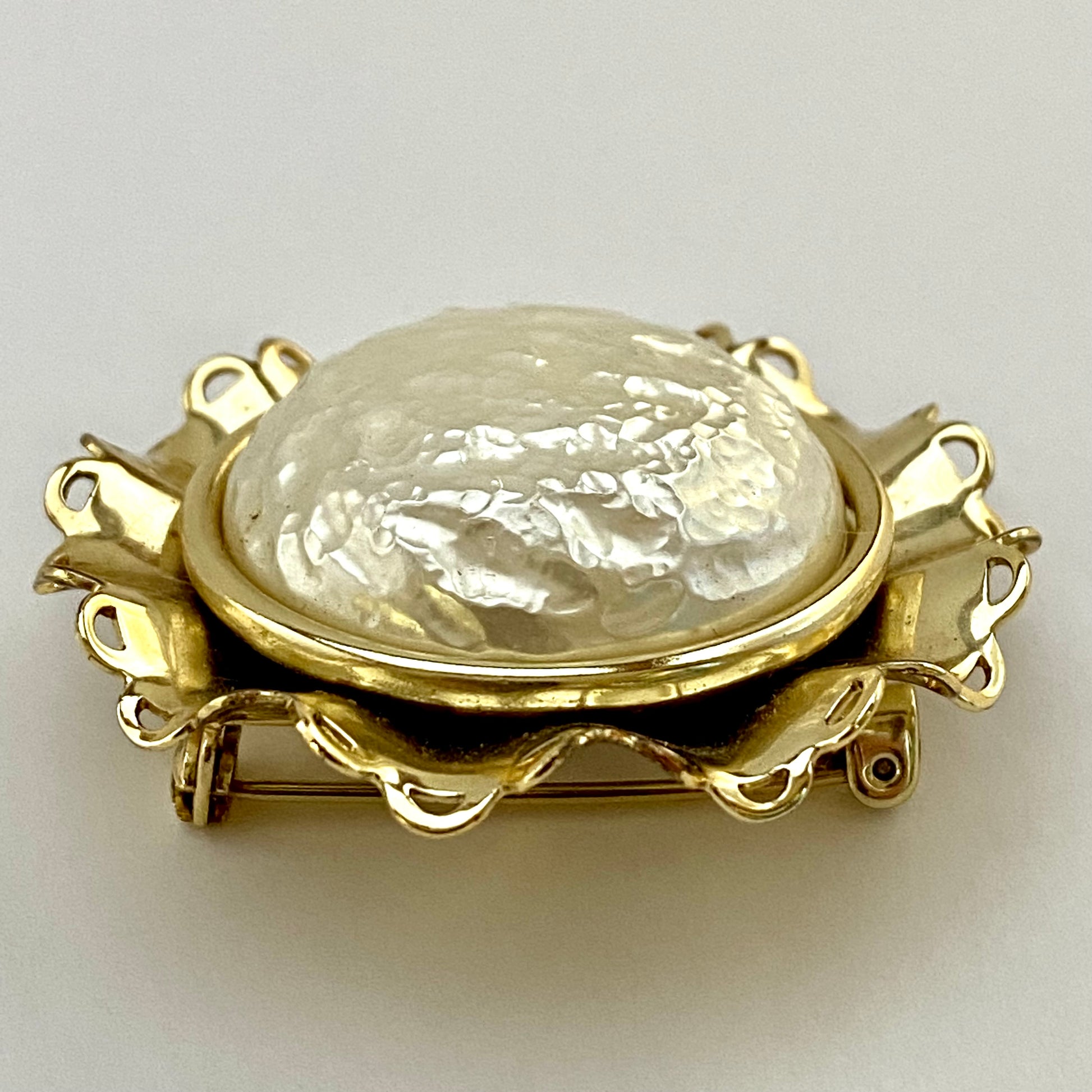 This beautiful, bold, flower brooch is an unsigned beauty. The brooch features a huge, lustrous, faux baroque pearl button that measures approximately 1¼” in diameter. The pearl sits on a gold-tone circle and is the center of the unusual brooch. The flower center is surrounded by a gold-tone ruffle that serves as the open work petals. The brooch measures approximately 1¾” in diameter and closes with a locking C clasp. This brooch is in excellent vintage condition.