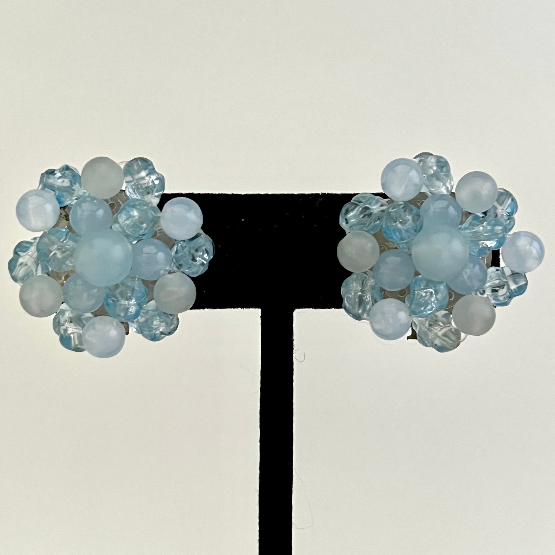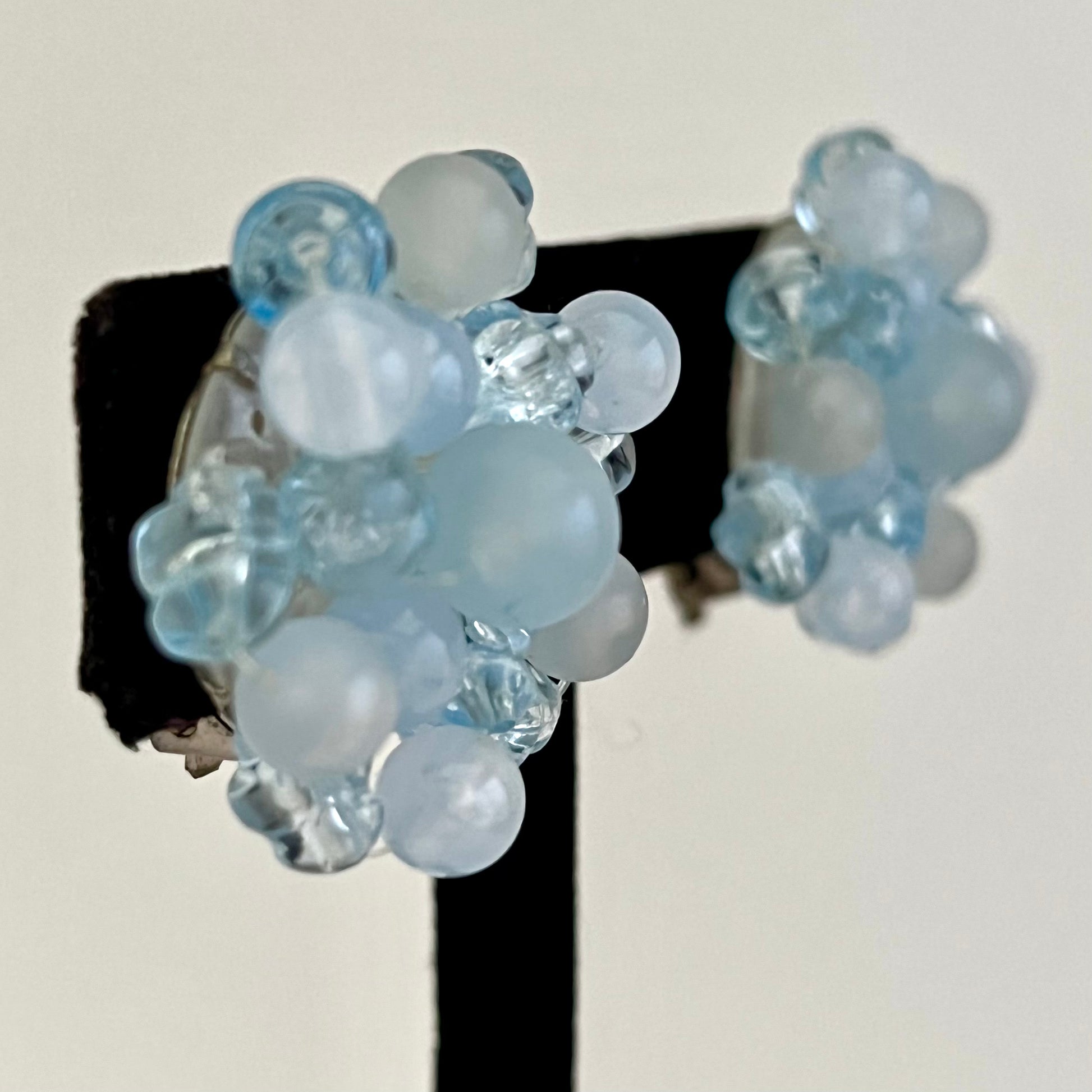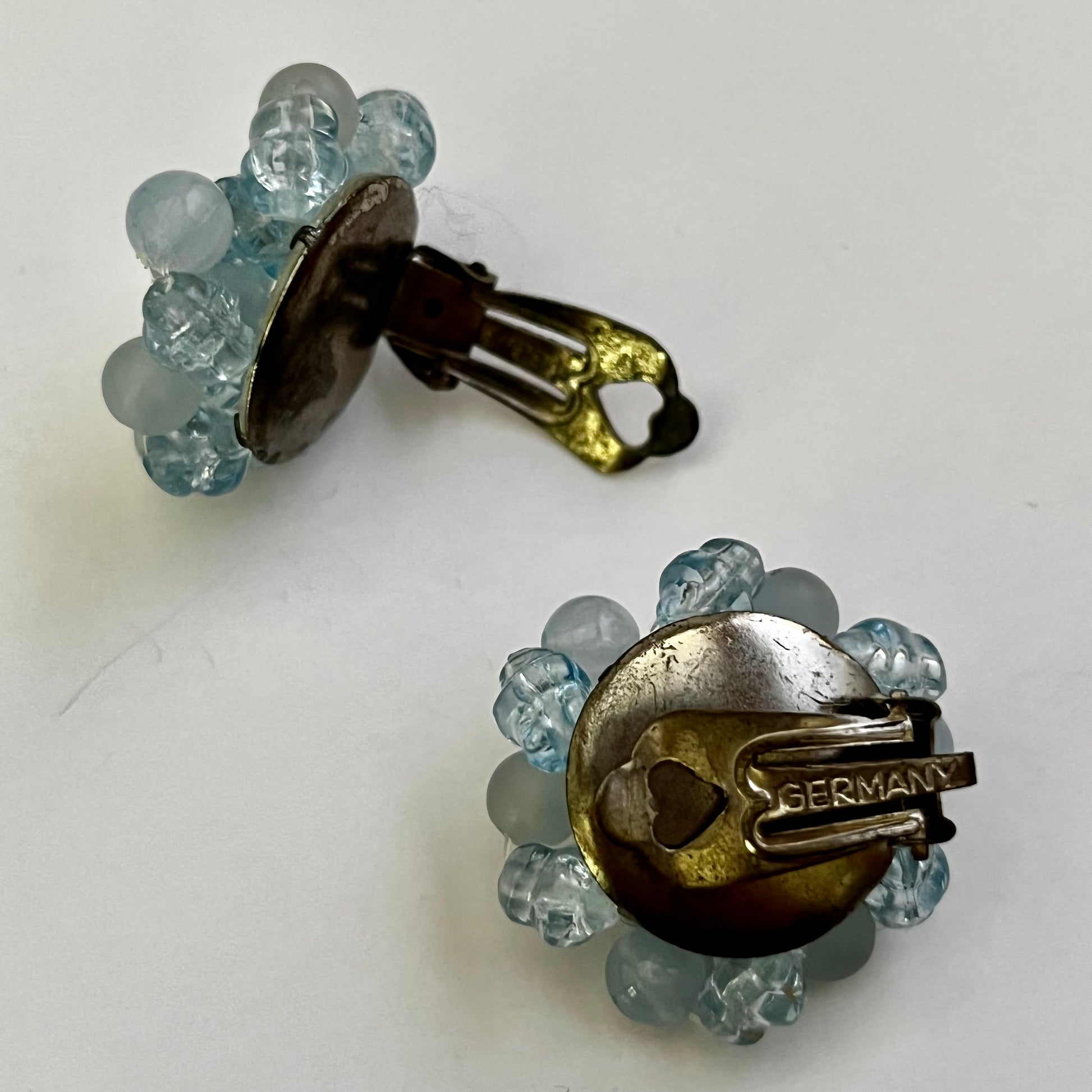 These clip-on German earrings feature a cluster of small round beads that resemble a cloud of bubbles. The small pale translucent blue and pale transparent blue beads wind around the center bead, a larger translucent blue bead. The earrings measure approximately 1” in diameter. They are signed GERMANY on the silver-tone paddle back clips. These earrings are in excellent vintage condition.*