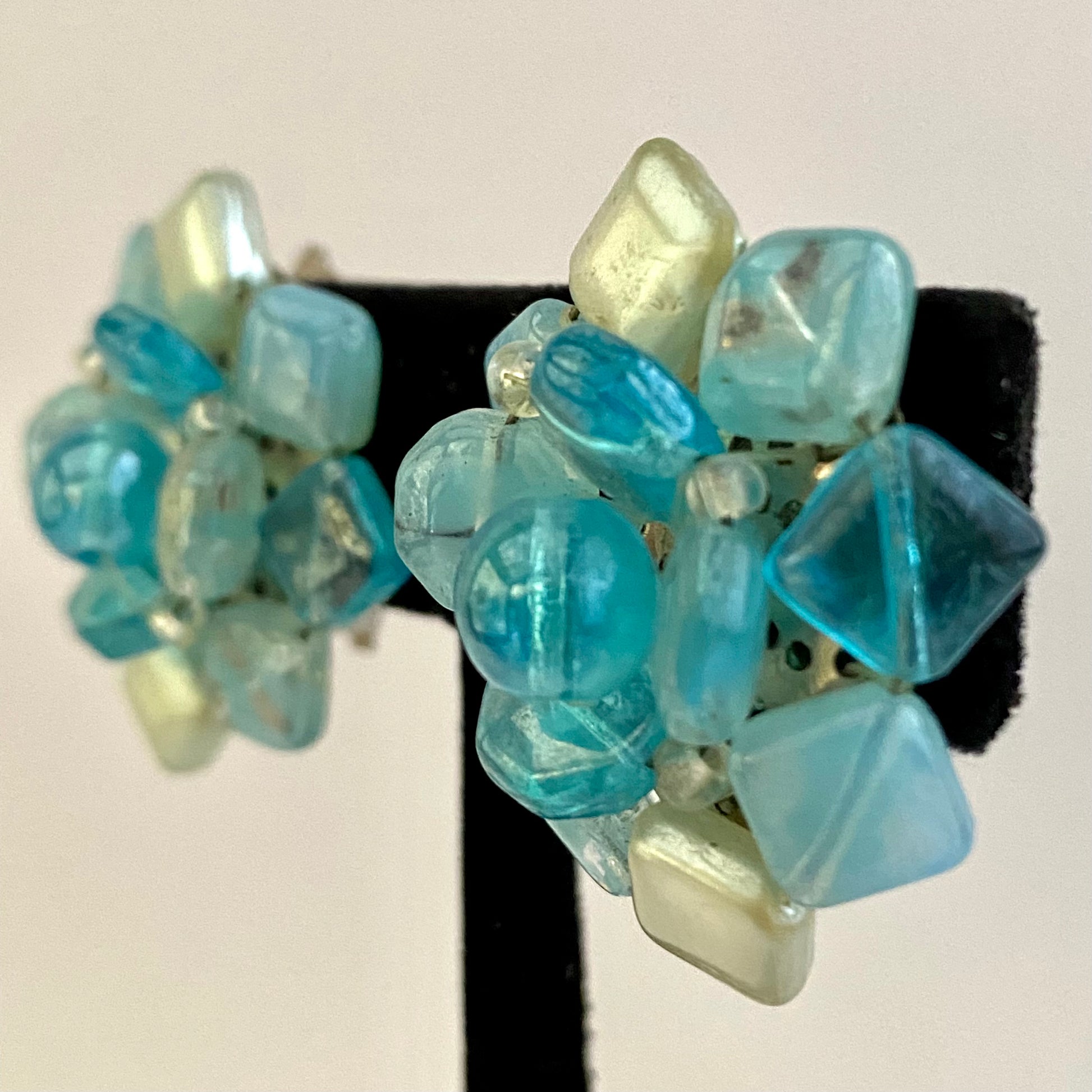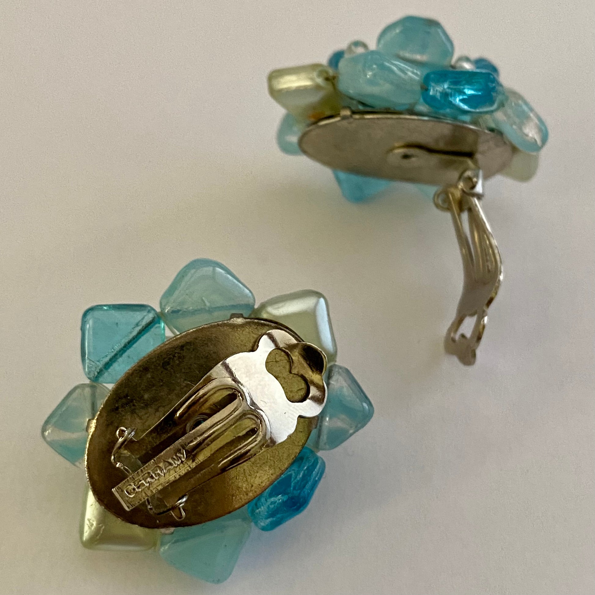 Shades of aqua are featured in this pair of German earrings. Square, hexagon, and round beads combine to form this interesting and unusual design. The earrings measure approximately 1 3/8” H x 1¼” W. They are signed GERMANY on the silver-tone paddle back clips. These earrings are in excellent vintage condition.