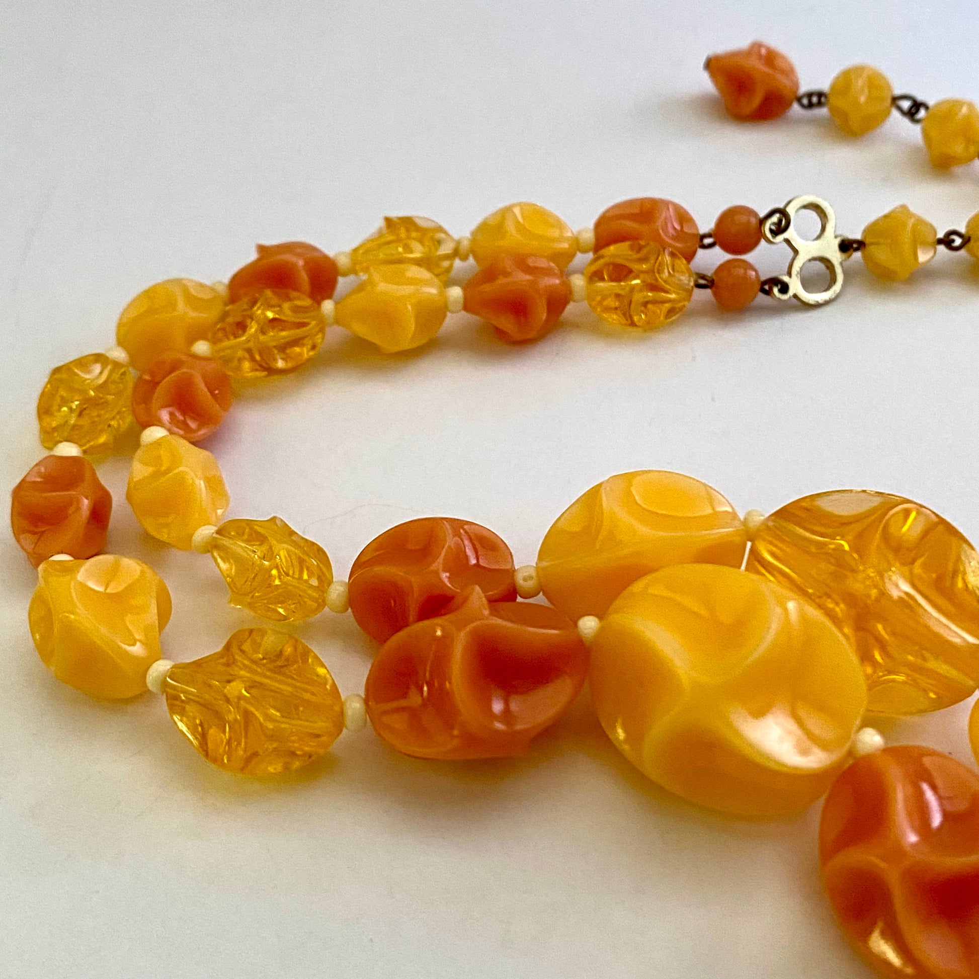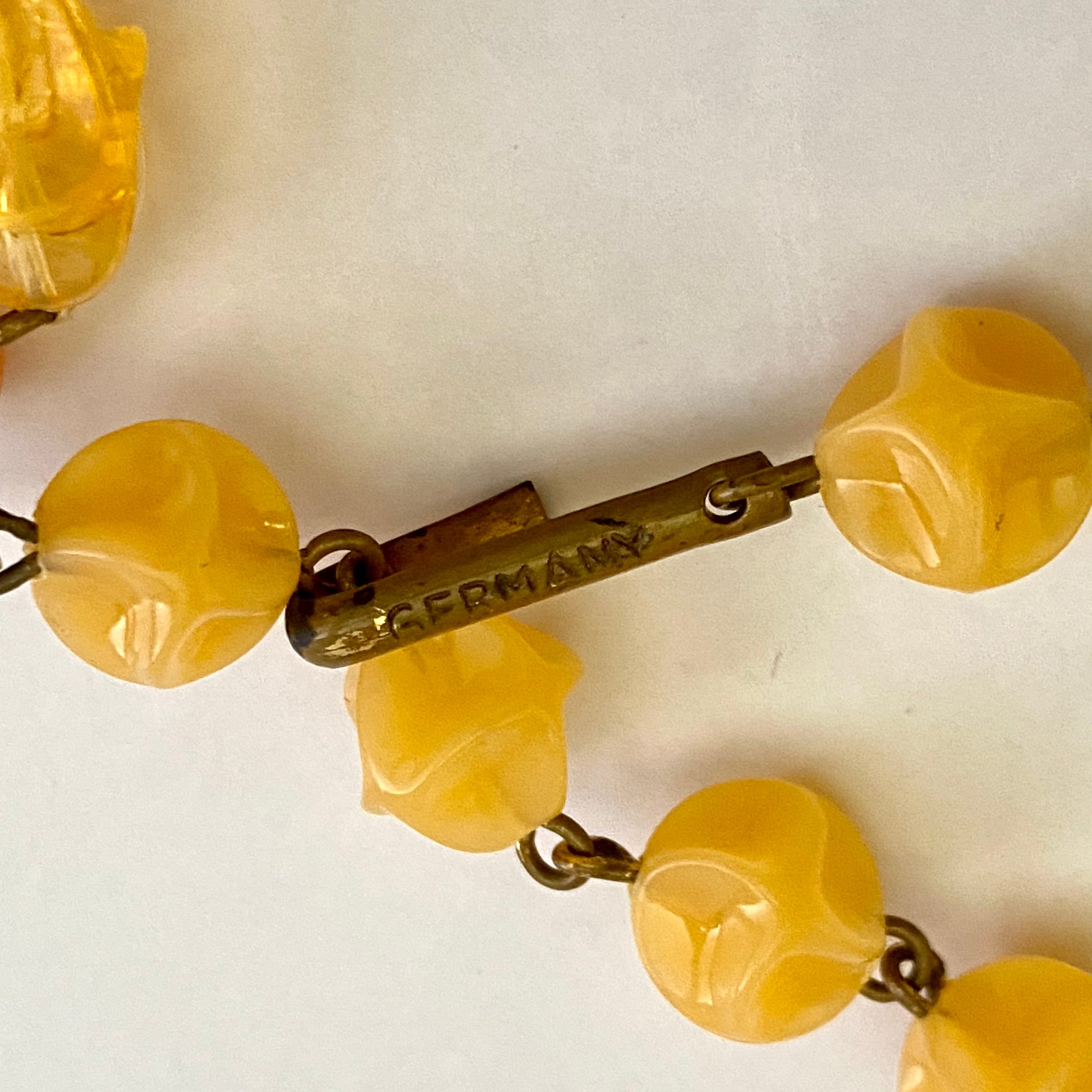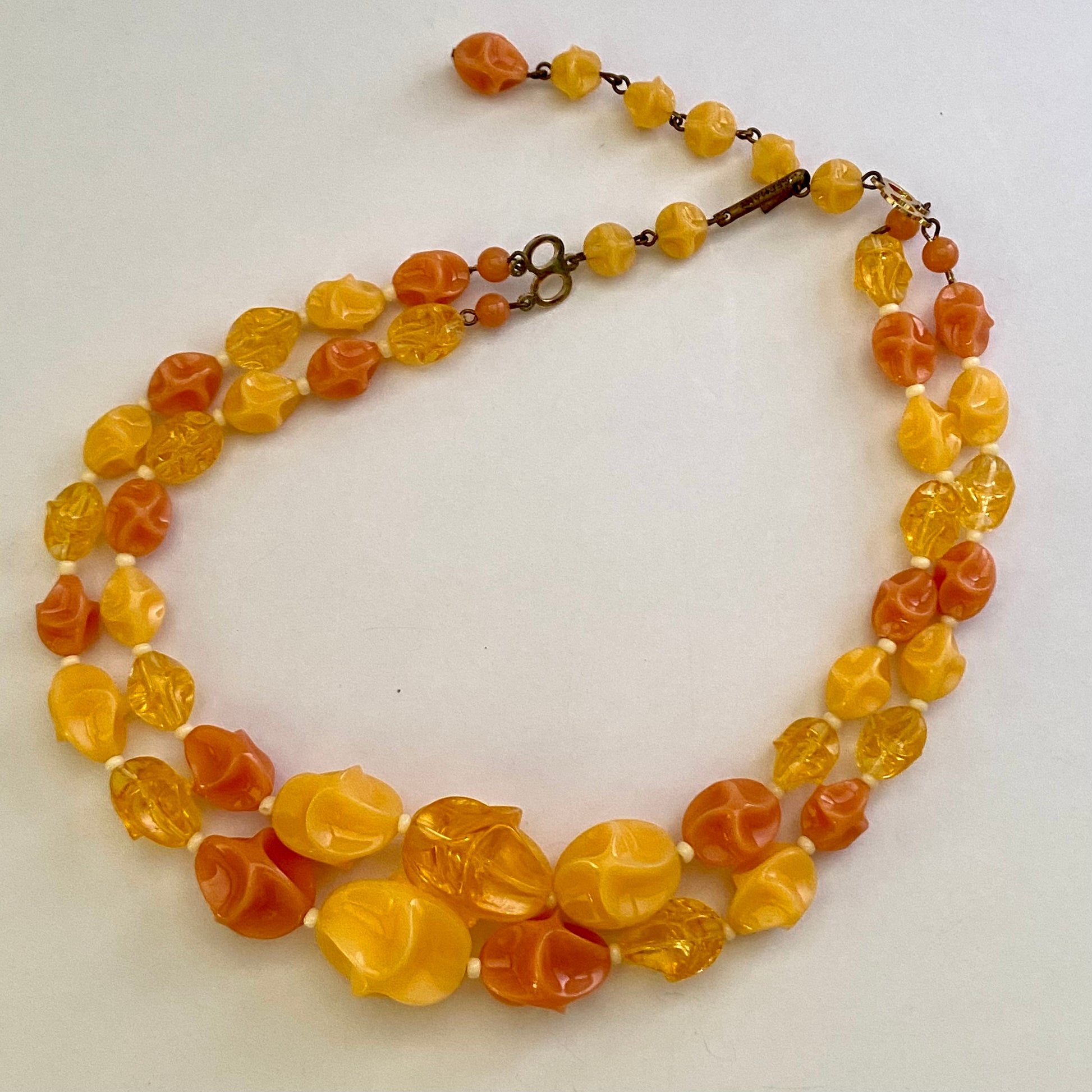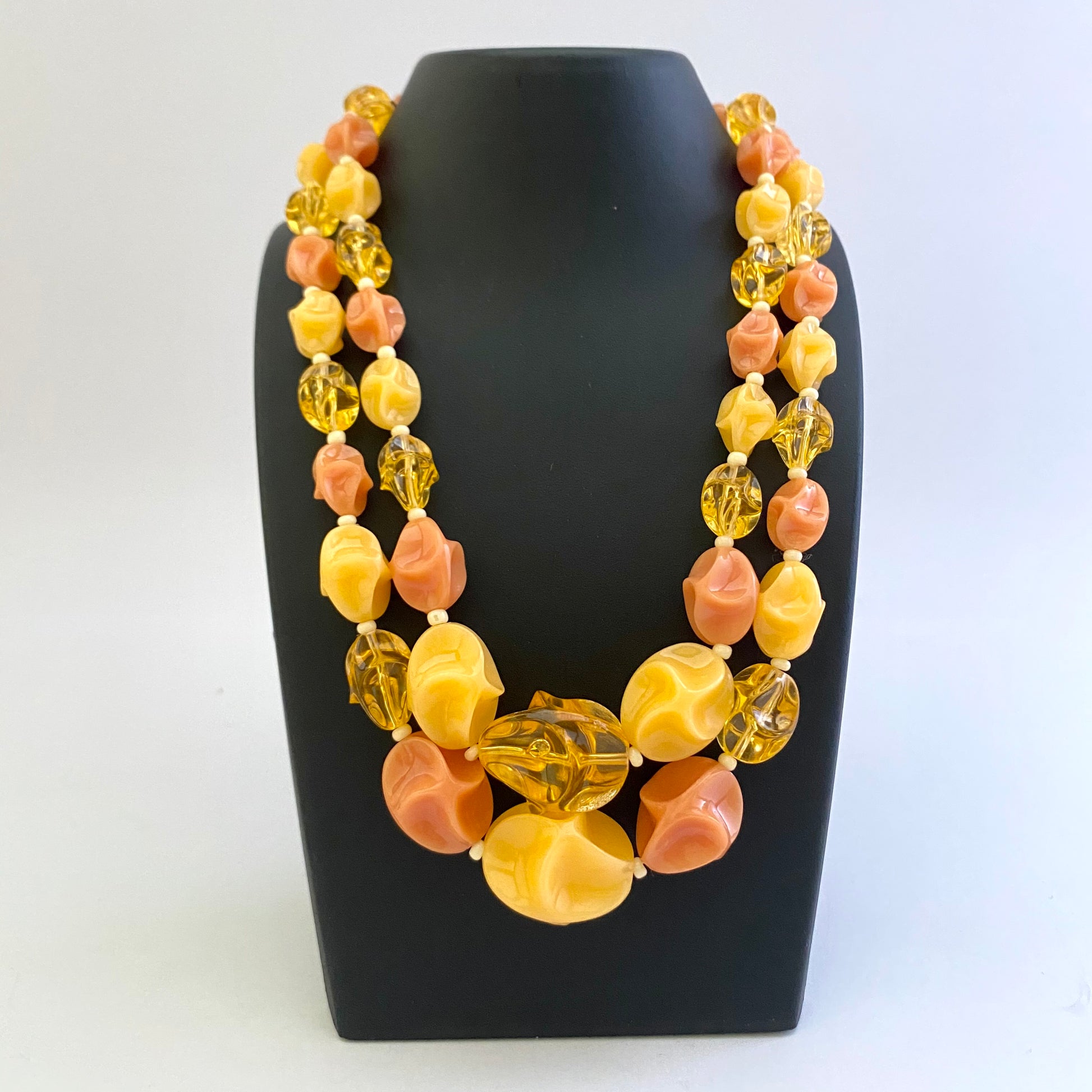This 2 strand necklace from Germany features an attractive mix of unusual bead colors and shapes. The necklace strands feature graduated, unusual polygon shapes. Some are a pretty peach color and others are yellow and transparent yellow beads. The strands measure approximately 13” and 22½”. The necklace closes with a J hook and has a 3” extender. The J hook clasp is signed GERMANY. This necklace is in excellent vintage condition.*