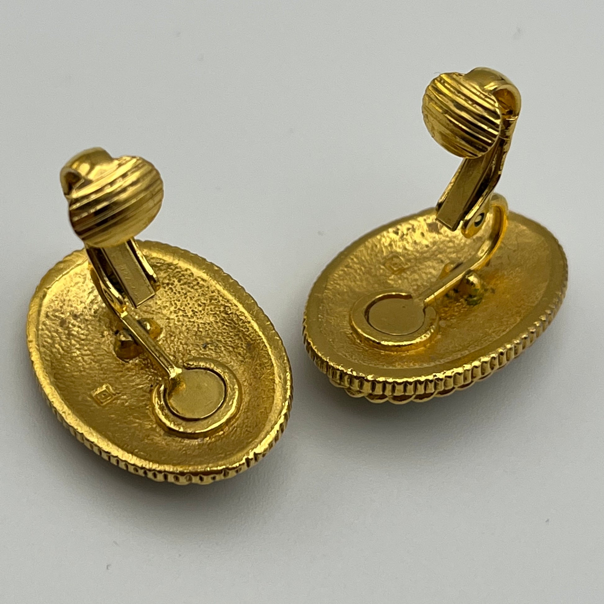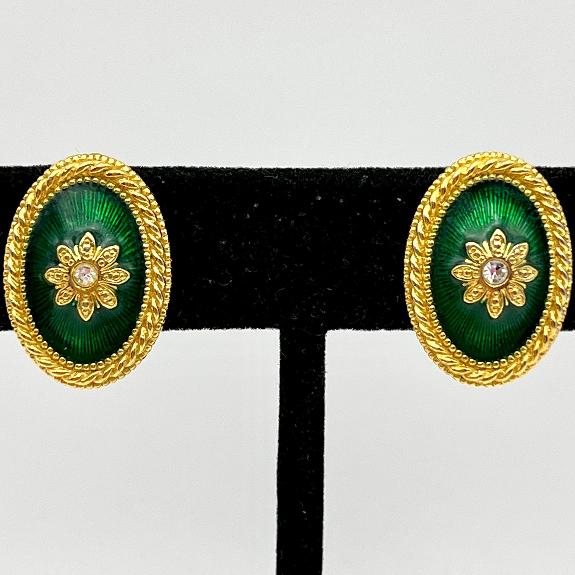 These pretty classic earrings are an unsigned design. The clip on earrings feature a green oval enamel in an ornate gold-tone setting. The oval is accented by a textured, gold-tone flower with a clear rhinestone center. The earrings measure approximately 1” H x 5/8” W. They close with hinged back clips and are in excellent vintage condition.