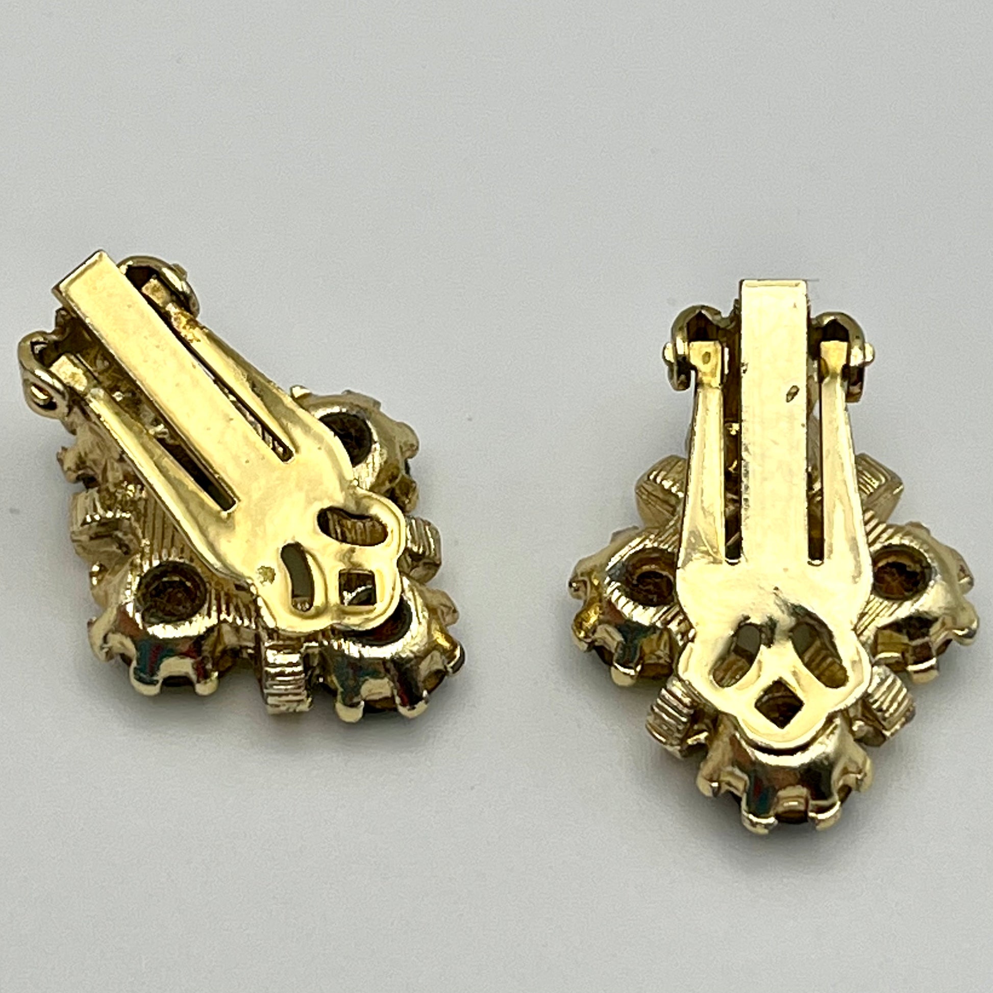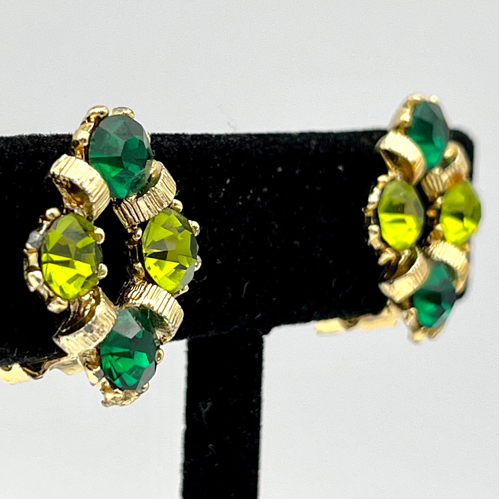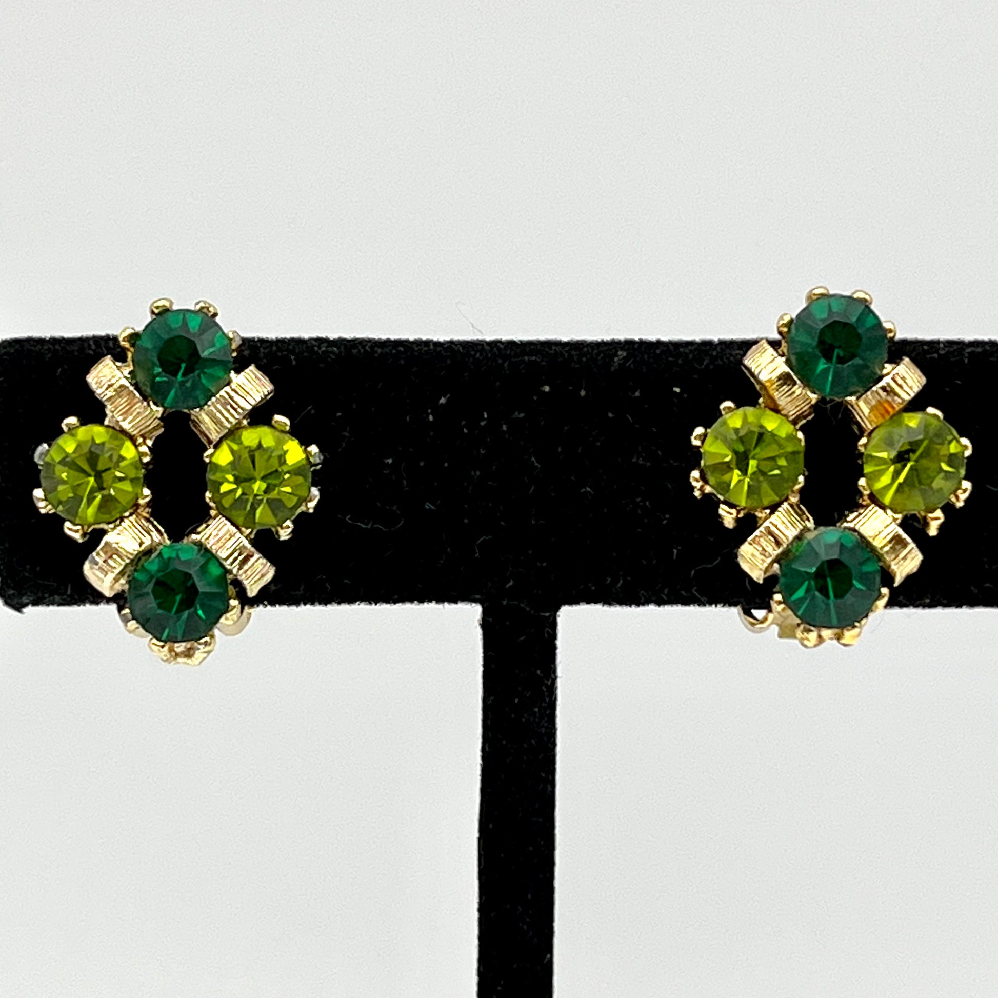 These beautiful, unsigned, clip-on earrings feature a classic diamond shape formed by 2 emerald green and 2 light green rhinestones in a gold-tone setting. The alternating rhinestones are separated by small, textured, gold-tone rings. These earrings measure approximately 7/8” H x 5/8” W and close with gold-tone, paddle back clips. They are in excellent vintage condition.