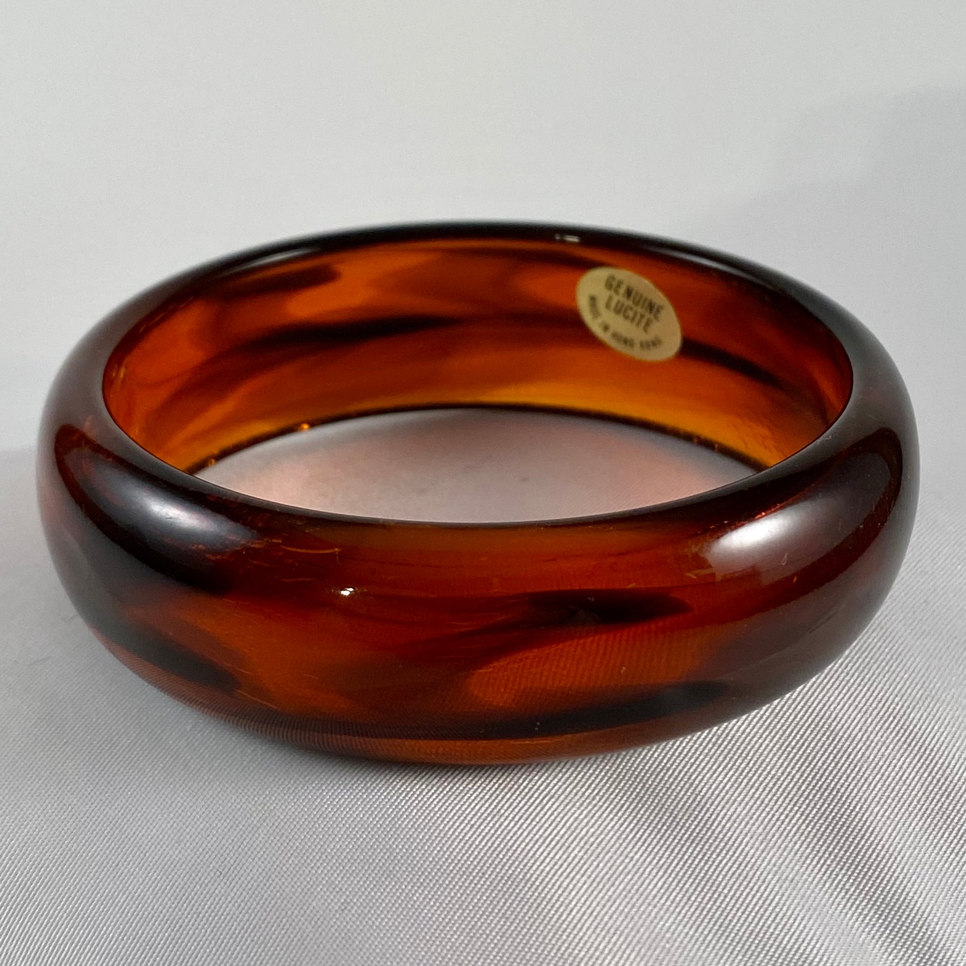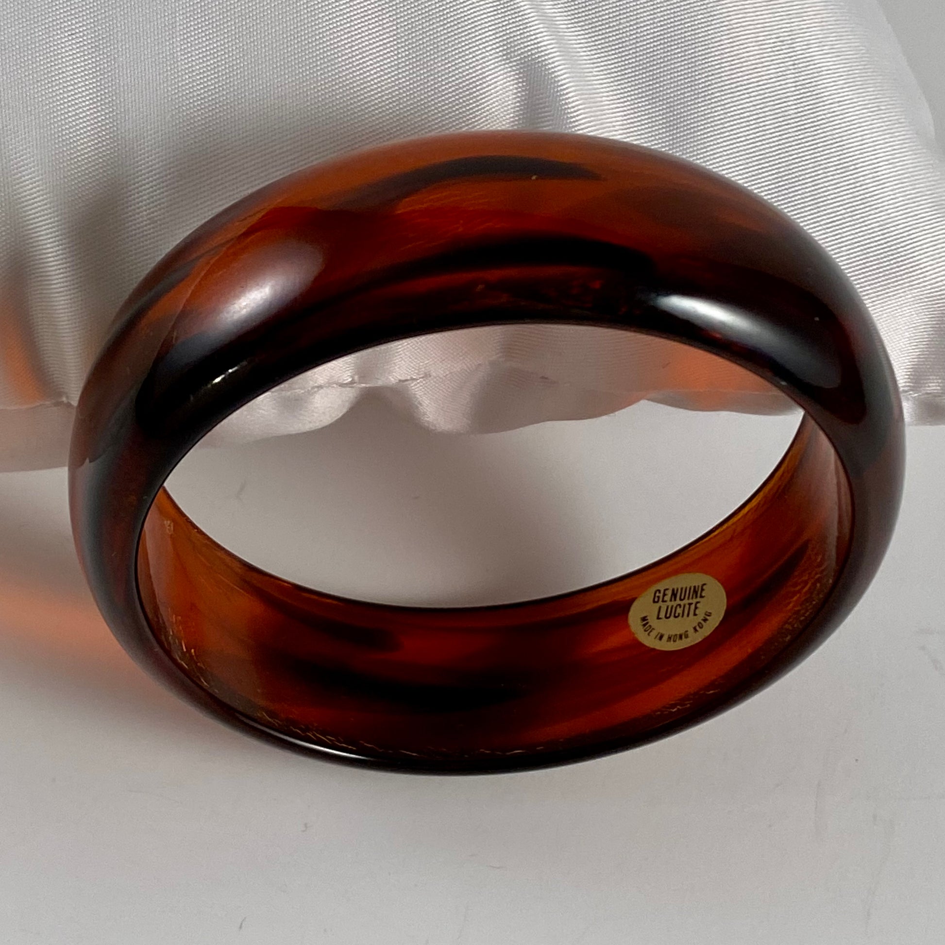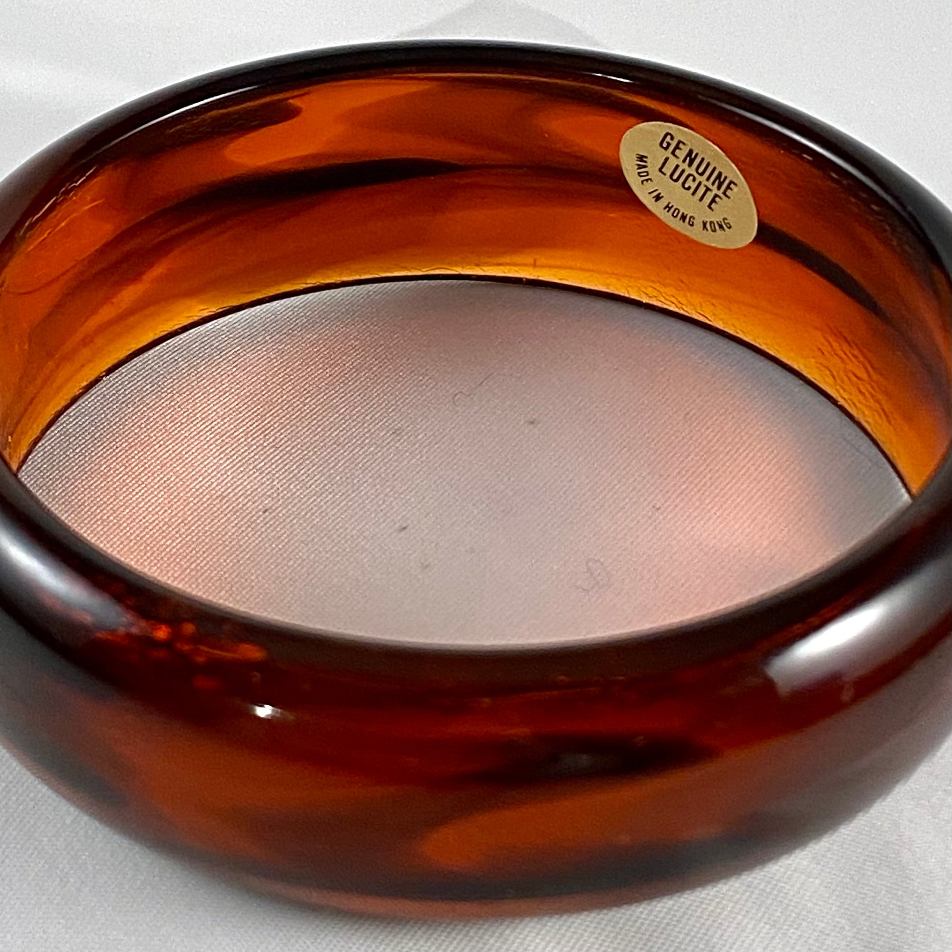 This fabulous lucite bangle bracelet is from Hong Kong. The semi-translucent bracelet features a gorgeous combination of brown and amber. The swirled effects vary all the way around the bracelet giving it a sensational look. The inner diameter of the bracelet is approximately 2 5/8”. The bracelet is approximately ¾” H and is polished and domed. There is a sticker inside the bracelet that is signed GENUINE LUCITE, MADE IN HONG KONG. The bracelet is in excellent vintage condition.