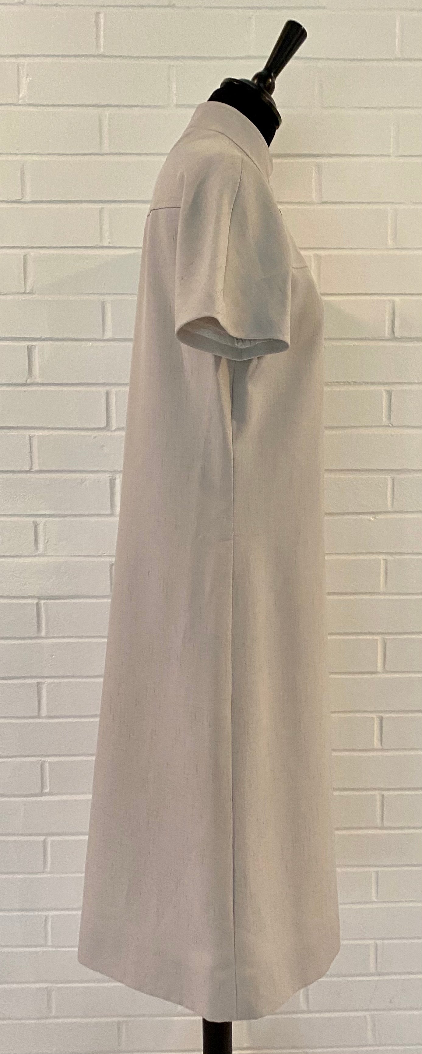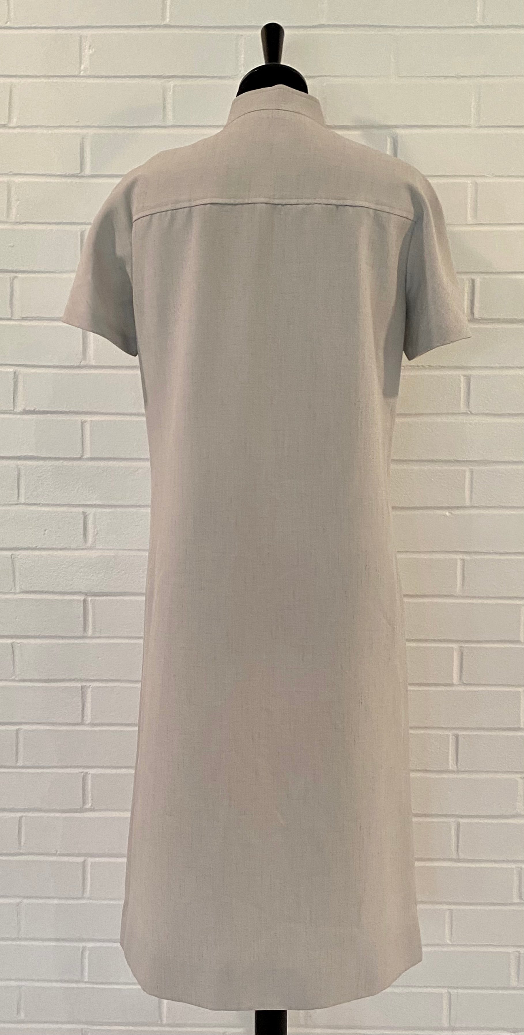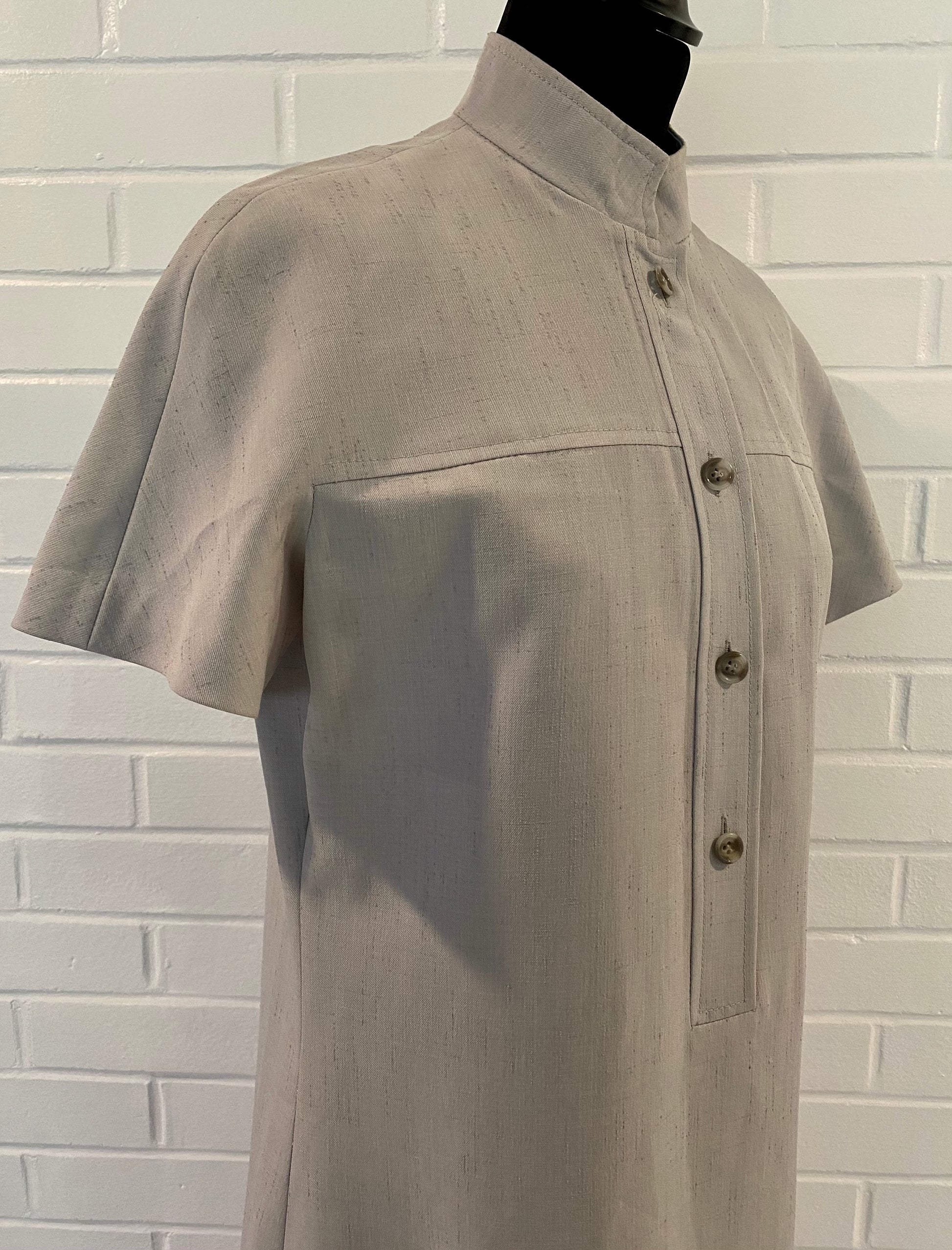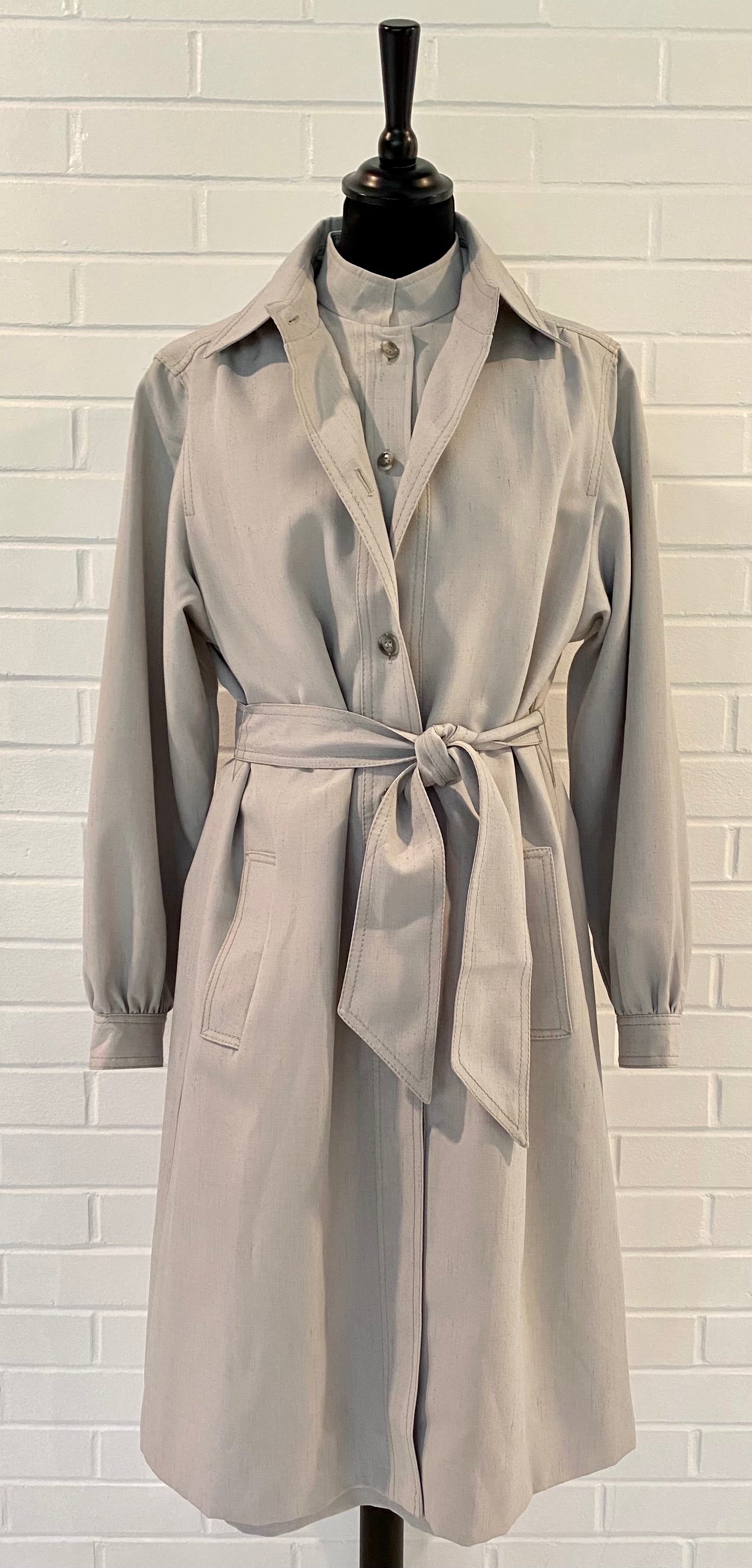 Style: A short sleeve dress with a stand collar and center front 3/4 length button placket. The dress is not lined. The jacket is a long collared jacket with long sleeves and cuffs with buttons. There is a center front button placket opening. There is also a center back vent and inverted box pleat. The jacket has double needle top stitching detail on it and is fully lined. There is also a self fabric belt.