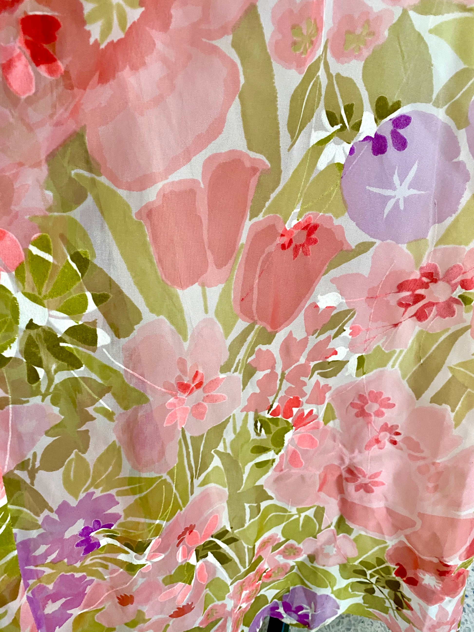 Style: This maxi is sleeveless with a V neckline and 2 layers of pink organza ruffles around the top. The bodice is also solid pink organza over a solid pink satin lining and waist is a stylized empire. The bottom skirt is constructed from flowered. flocked organza over a solid white satin lining. There is a center back metal zipper entry with a hook & eye at the top.