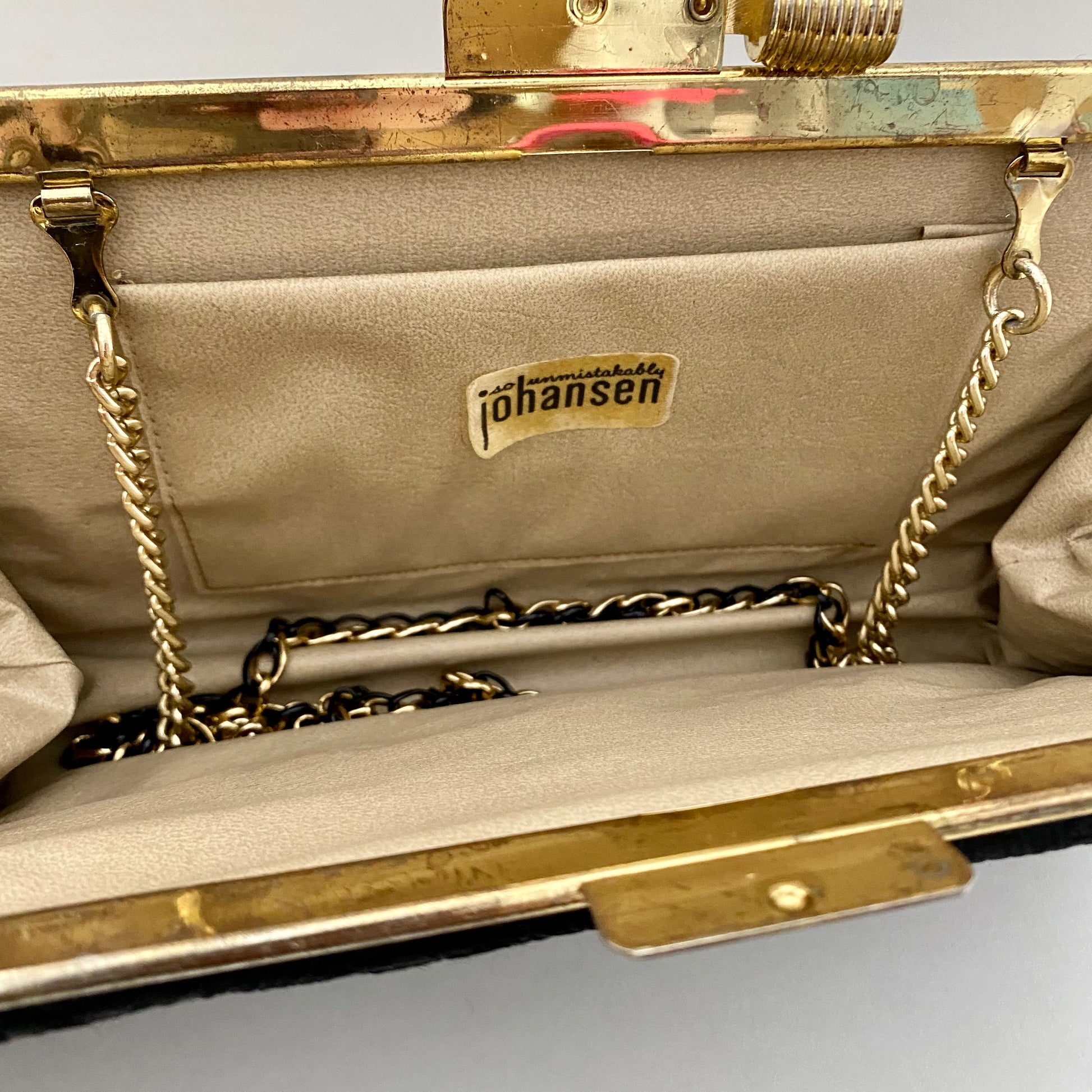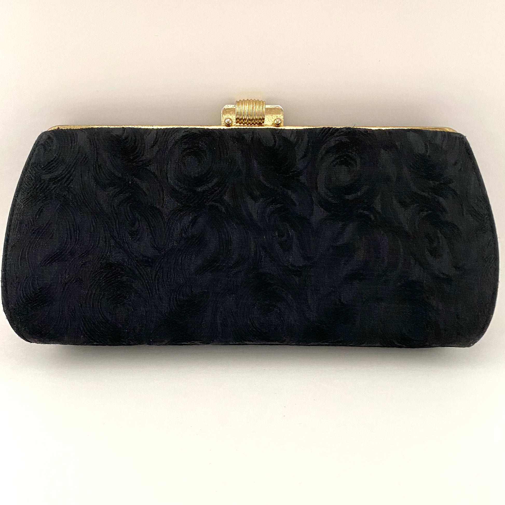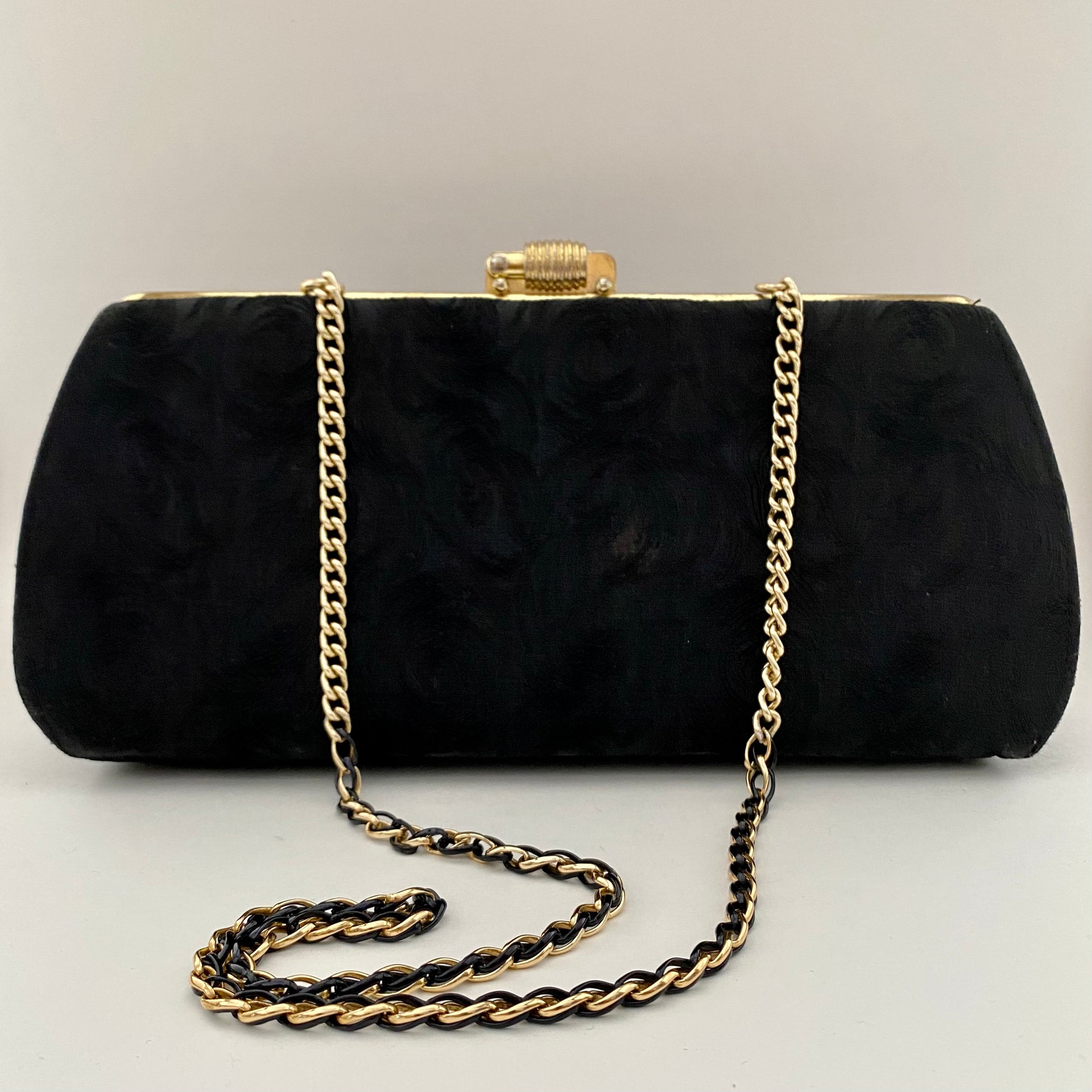 Style: A textured, fabric clutch handbag with a rectangular metal frame, a hinged lift closure and optional shoulder length chain.