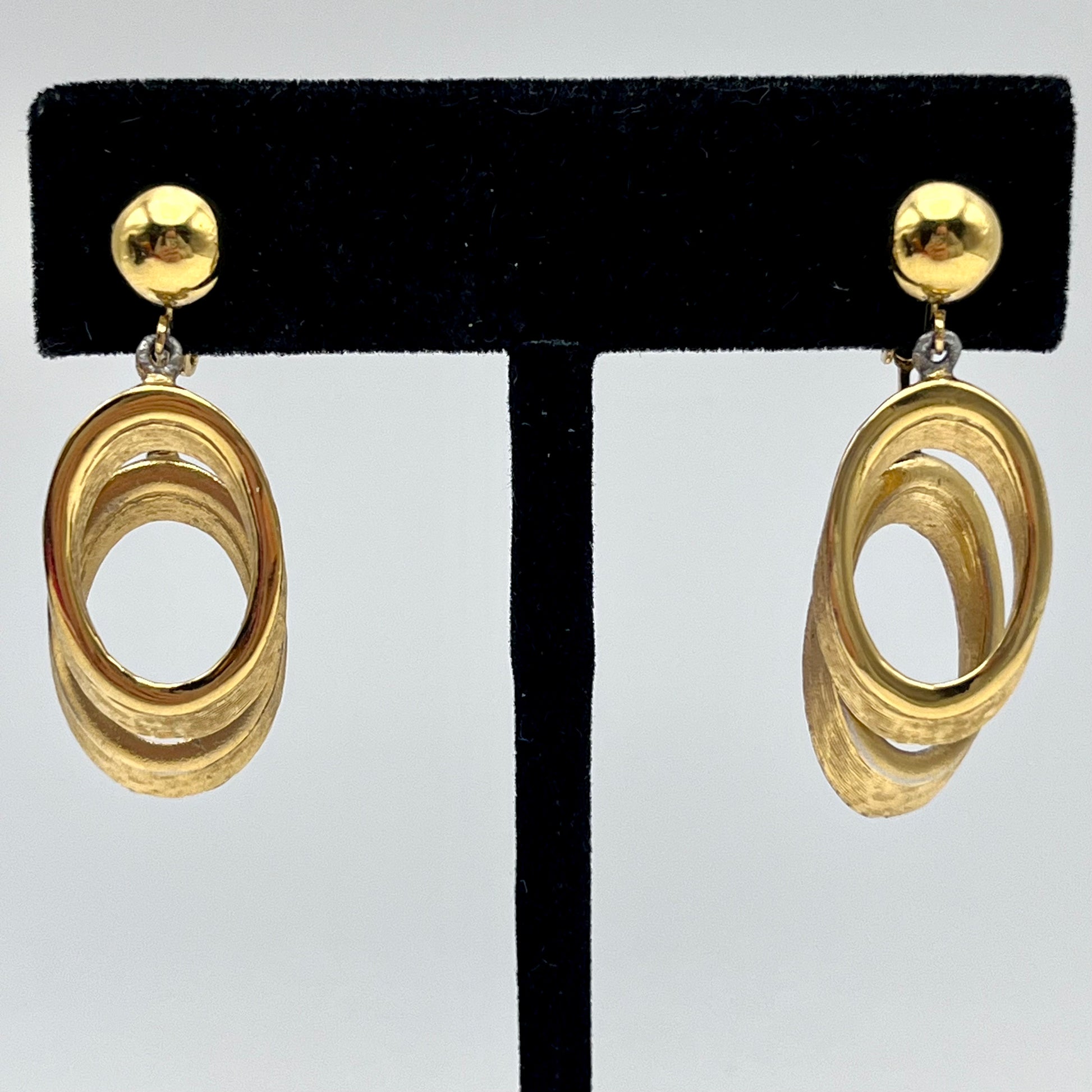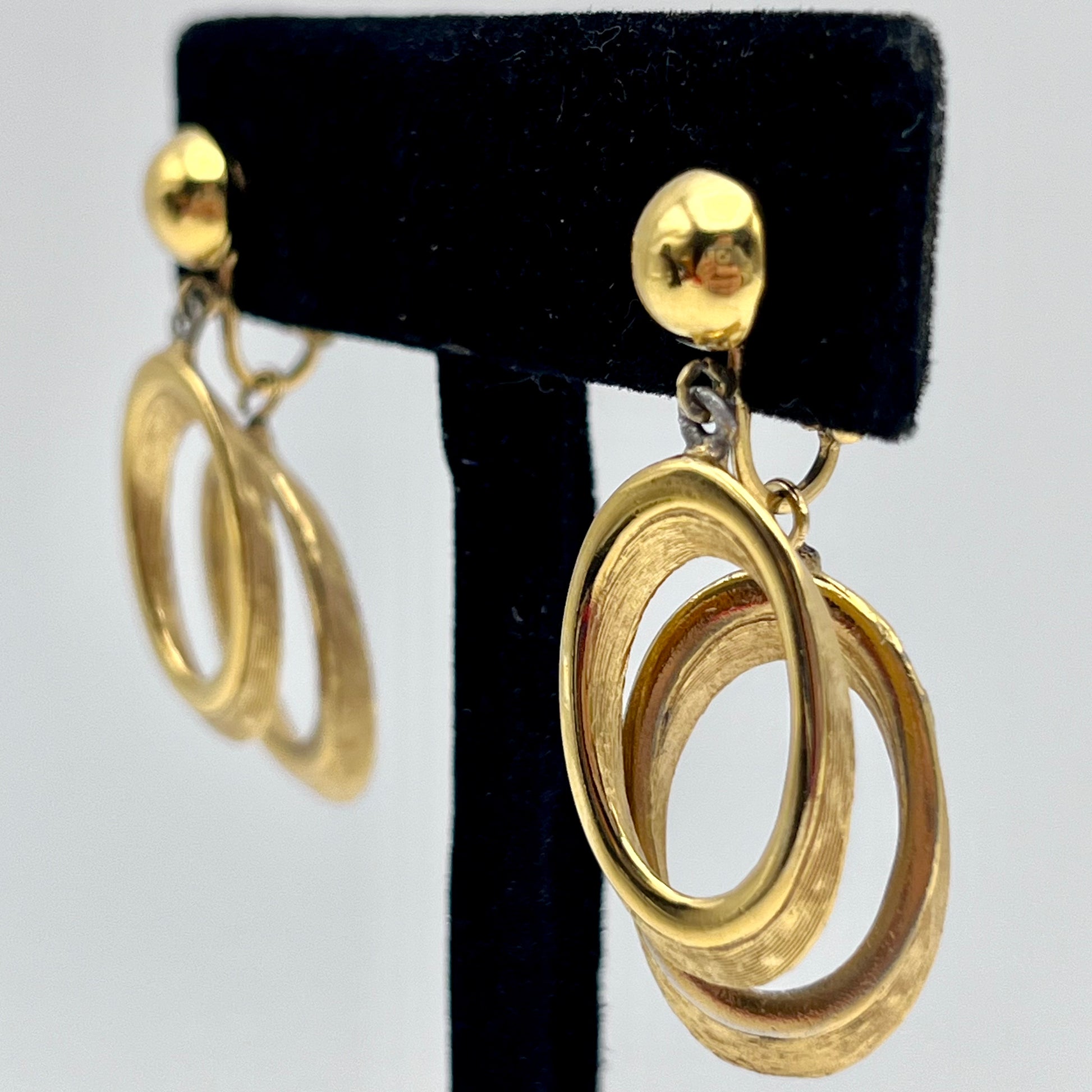 These pretty gold-tone dangle earrings were made by Trifari. The earrings feature gold-tone half domes on the earlobe. The dangles consist of 2 oval gold-tone hoops that are cut on a diagonal. They are polished gold-tone on top and brushed gold-tone on the back and the inner and outer edges. The hoops measure approximately 1” H x 5/8” wide. The entire earrings measure approximately 1¾” in length. They close with half-hinged clasps and are signed TRIFARI ©. These earrings are in excellent vintage condition.