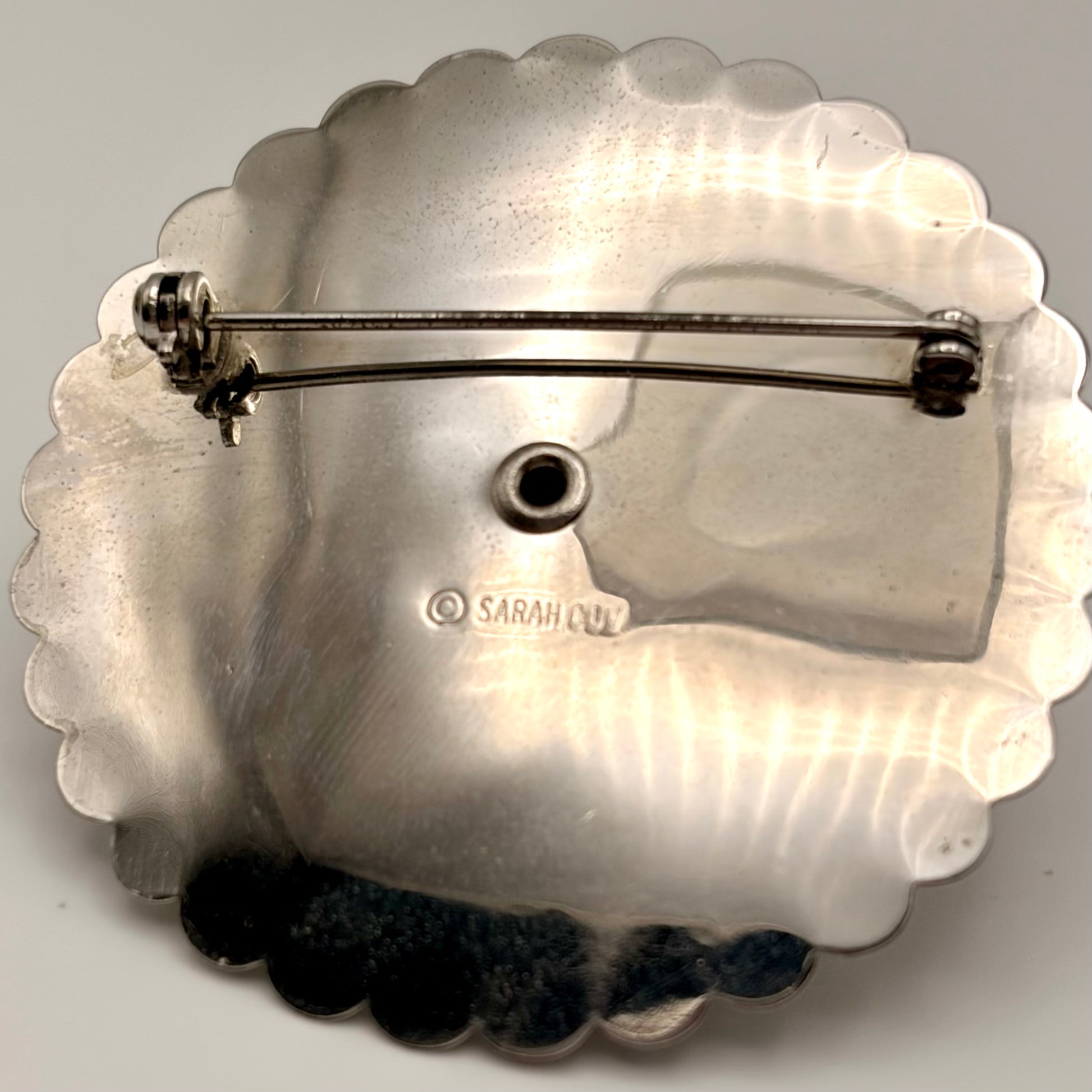 The Black Beauty collection was introduced by Sarah Coventry in 1962. This Black Beauty brooch features a large black cabochon in a silver-tone dog tooth setting. The cabochon sits in the center of a raised, polished silver-tone sunburst. The sunburst is supported on a round, concave disc. The silver-toned disc is textured with lines and tiny dots to complete the look. The brooch measures approximately 2" in diameter and closes with a locking clasp. It is signed ©SARAH COV on the back. This beautiful brooch is in excellent vintage condition.