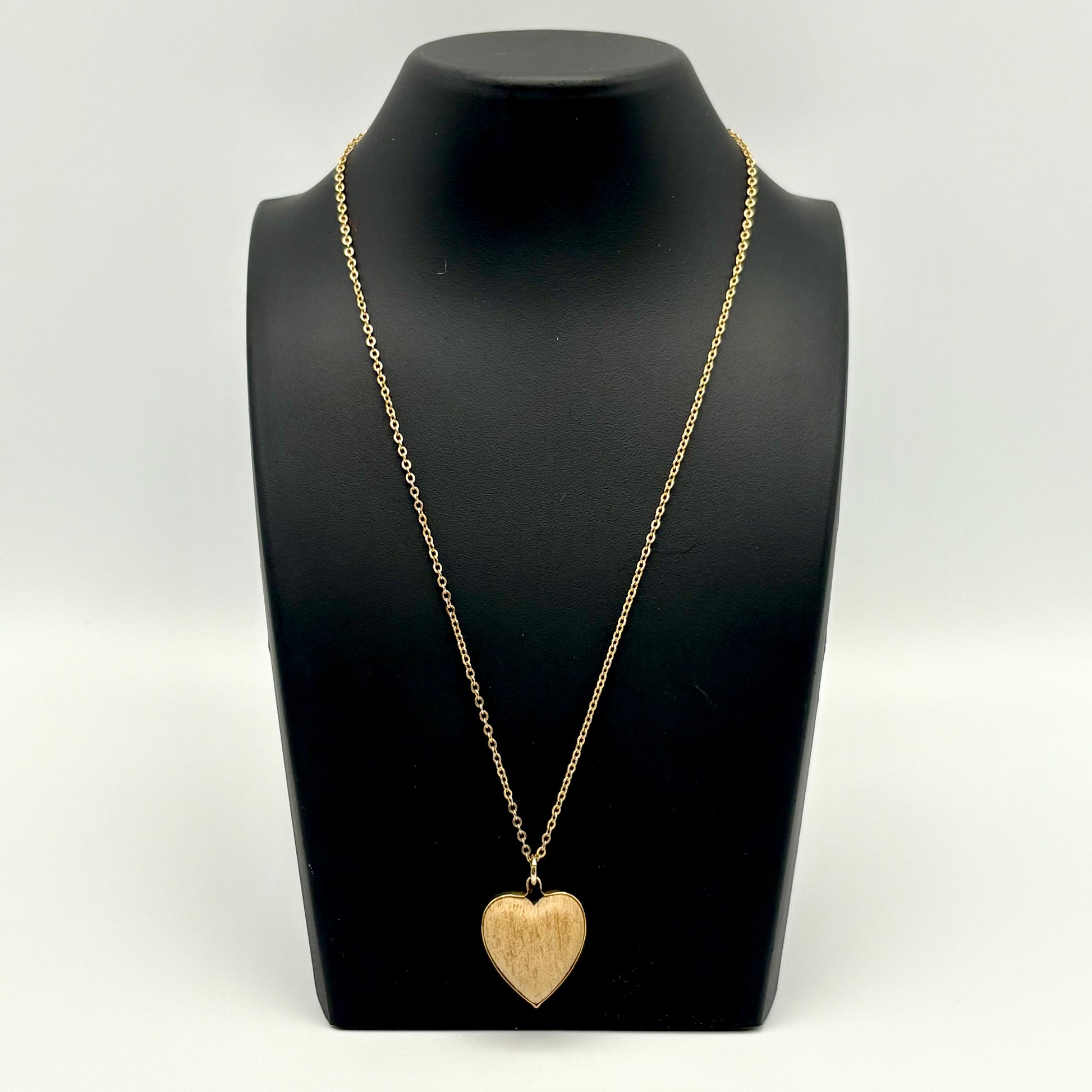 The Goin’ Steady necklace was introduced by Sarah Coventry in 1962. The necklace features a small heart-shaped pendant made of faux wood in a gold-tone frame. The necklace is reversible, with one side being brown and the other side a lighter brown. The heart measures approximately 7/8” H x ¾” W. It hangs on a delicate gold-tone 17” cable chain that closes with a spring ring clasp. The necklace is signed ©SARAHCOV on the gold-tone diamond hang tag. The heart is not signed. This necklace is in excellent vintage condition.
