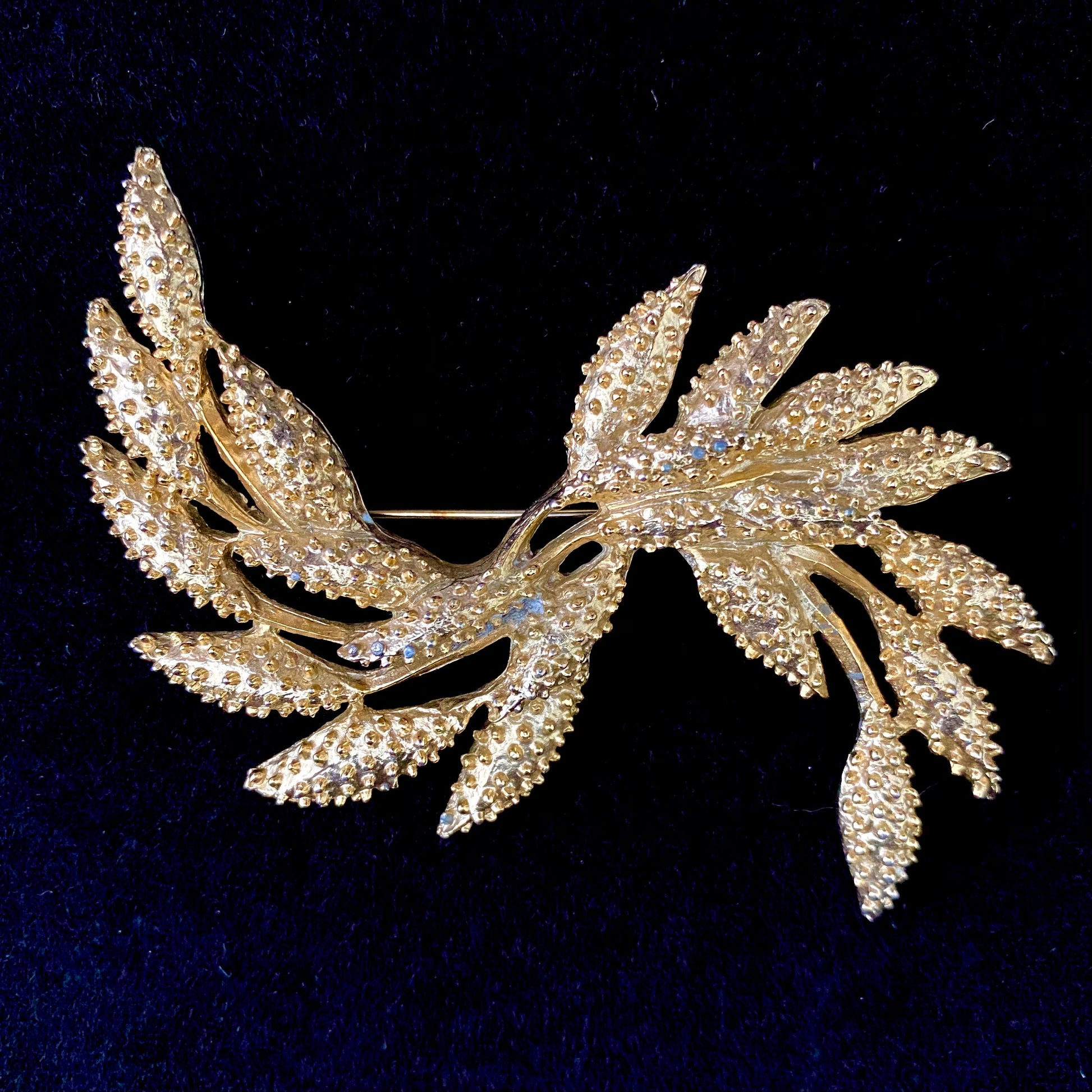 The Wind Flower brooch was introduced by Sarah Coventry in 1963. This brooch is a very large and dramatic design. It features a grouping of gold-tone spiked stalks of plant pods that resemble wheat or milk weed etc. The brooch is signed ©SARAHCOV. It measures approximately 3 1/8” x 2¾” and is in very good vintage condition*.