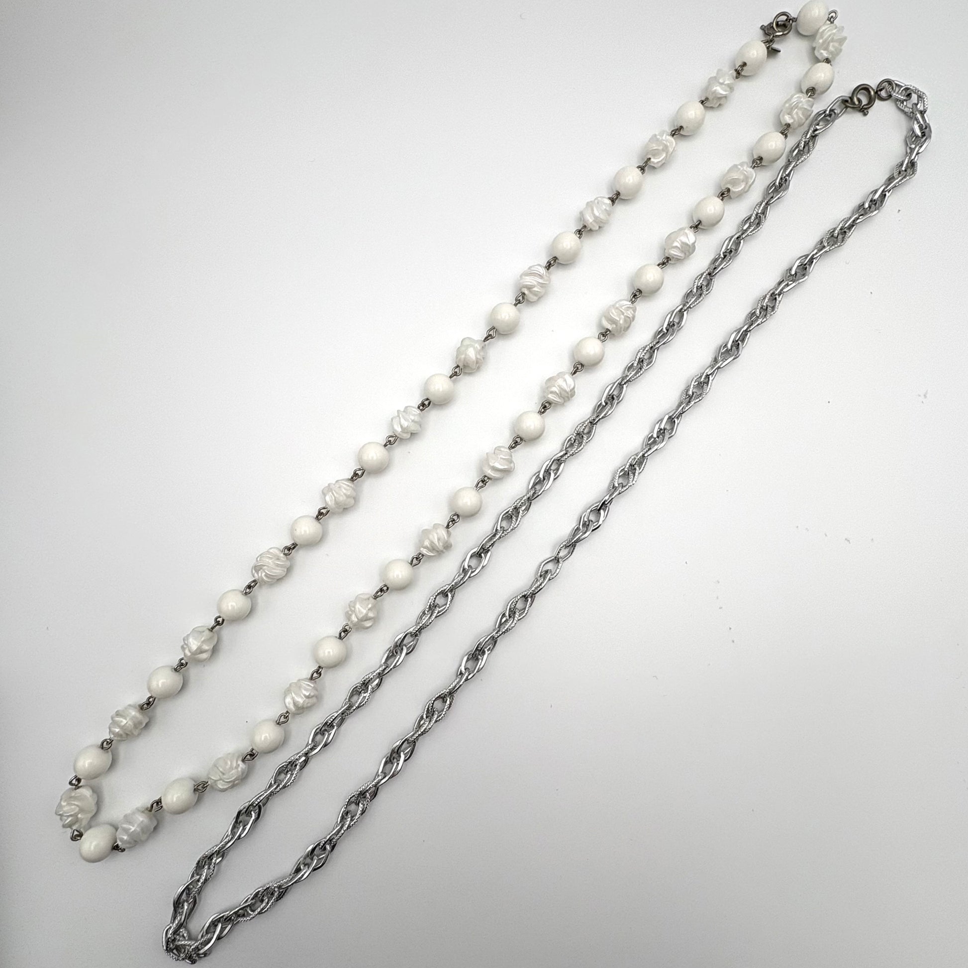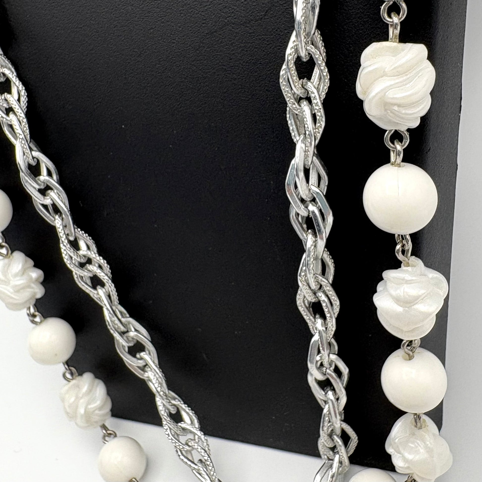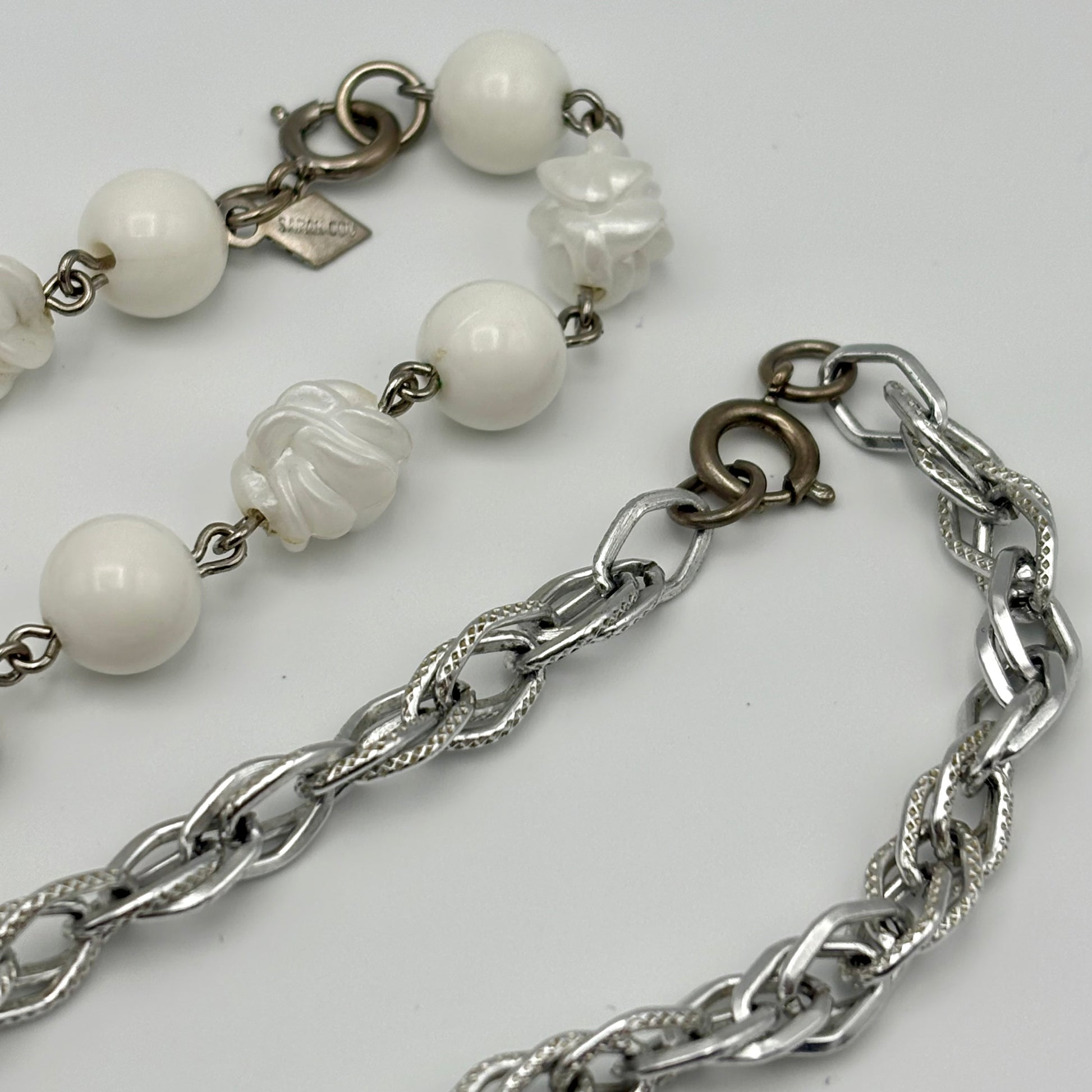 The Sarah Coventry Summer Magic necklace was introduced in 1964. This necklace features smooth, round, white beads that alternate with abstract, twisted, matte white beads. The beads are connected by delicate silver-tone links. The necklace is accented by a matching, silver-tone chain. The necklace and chain both measure approximately 30” L. The necklace is signed SARAH COV on the diamond shaped hang tag and closes with a spring ring clasp. It is in excellent vintage condition.