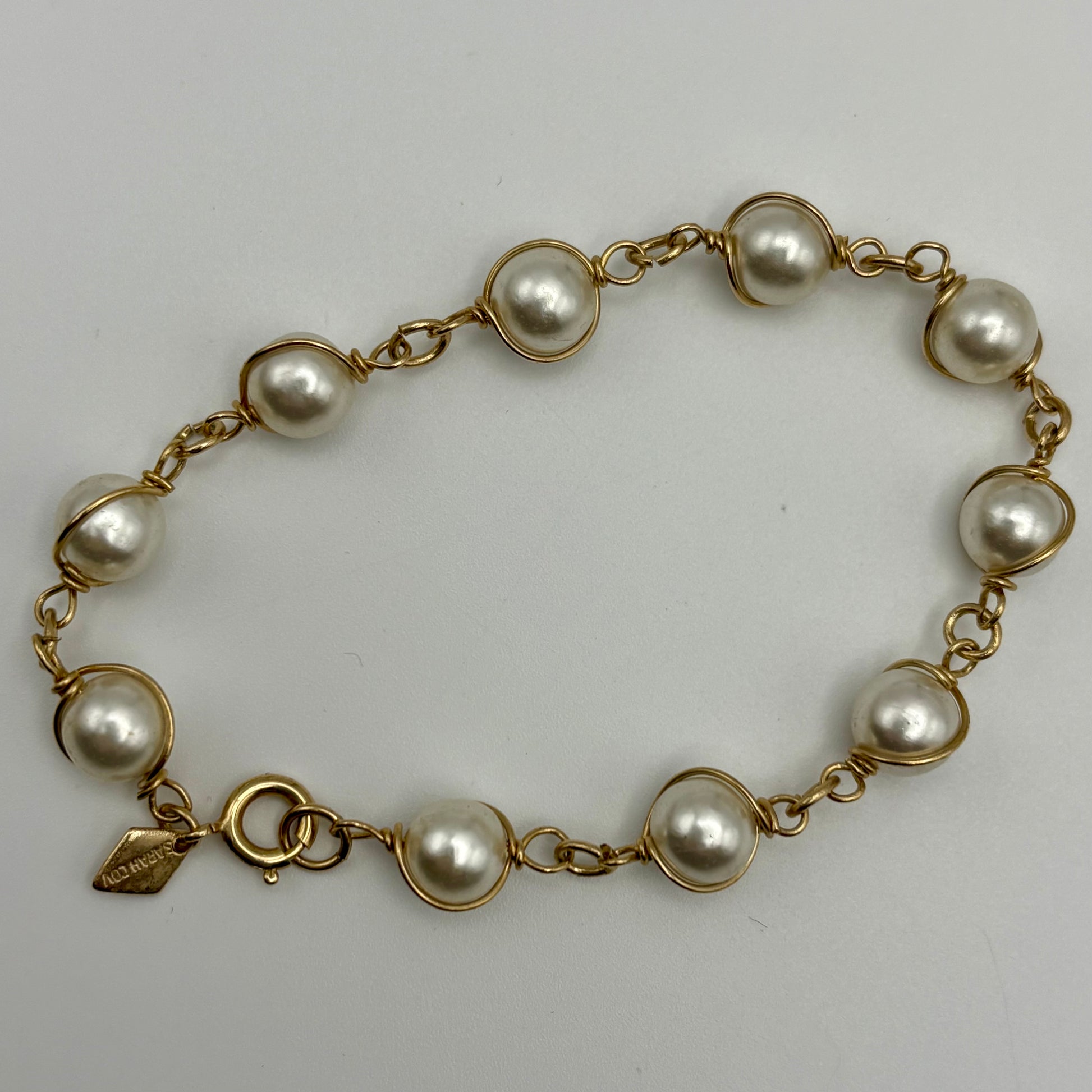 The Sarah Coventry Pearl Swirl Collection was introduced in 1966. The bracelet from this collection features lustrous faux pearls wrapped in a delicate gold-tone wire. It measures approximately 7½” and closes with a spring ring clasp with the SC diamond hang tag. The earrings are petite dangles. They feature a gold-tone bead on the lobe and one wrapped pearl dangle. The earrings measure approximately 1” long and close with hinged back clips. They are signed SARAH COV on the clips. This demi-parure is in excellent vintage condition.