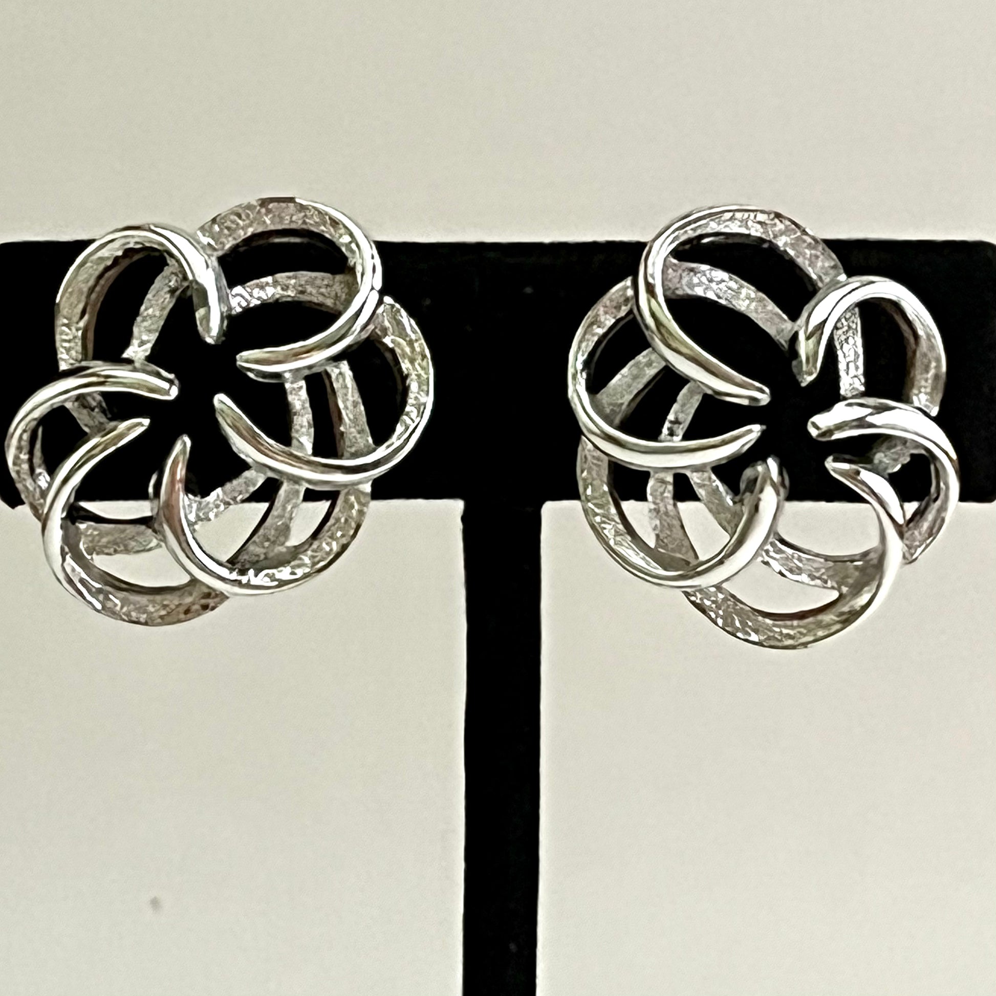 The Tailored Swirl collection was introduced by Sarah Coventry in 1967. The earrings from this collection feature both polished and textured silver-tone swirls curved to form a round shape. Though difficult to see, the earrings are signed SARAH COV on the hinged back clips. They measure approximately 1 1/8” x 1” and are in excellent vintage condition.