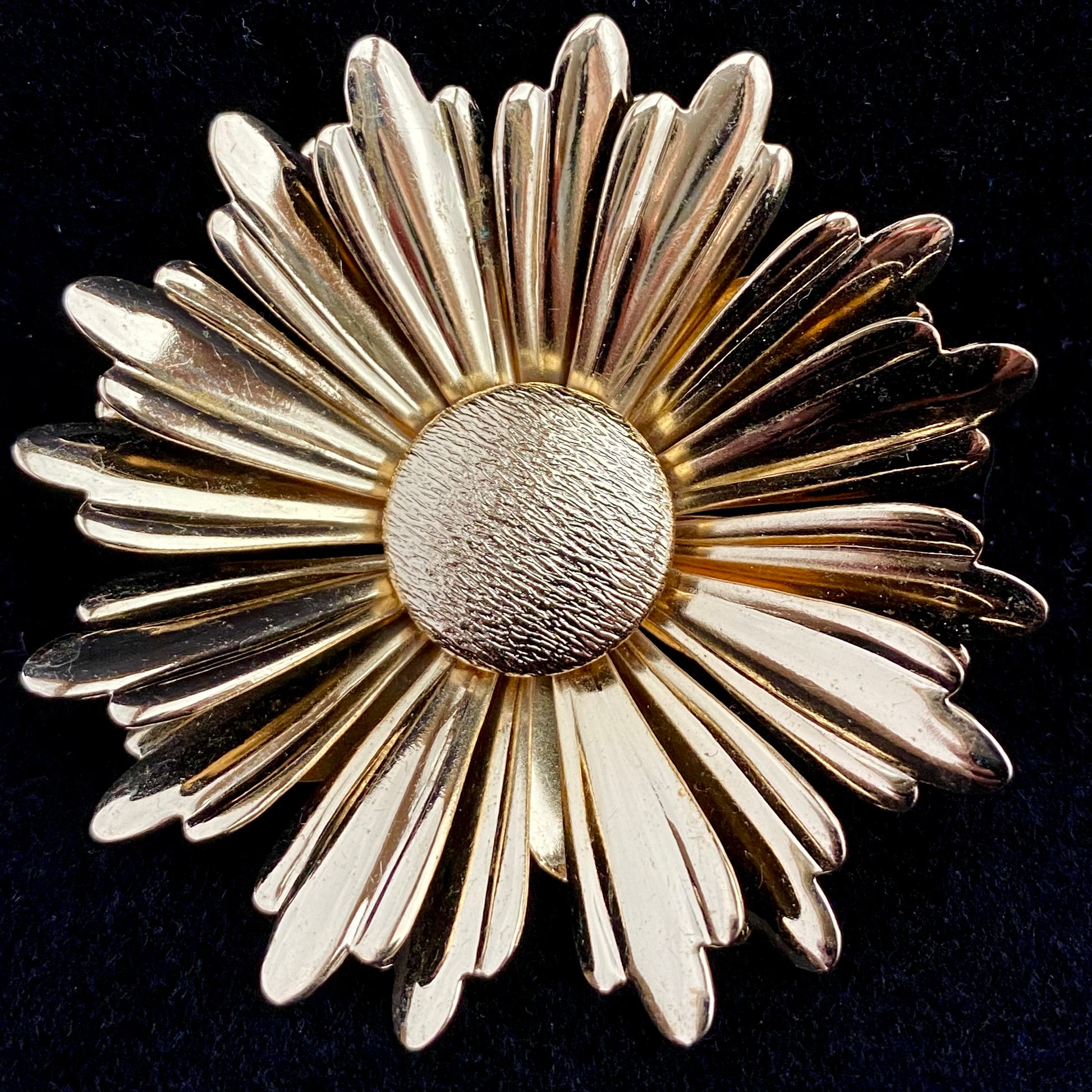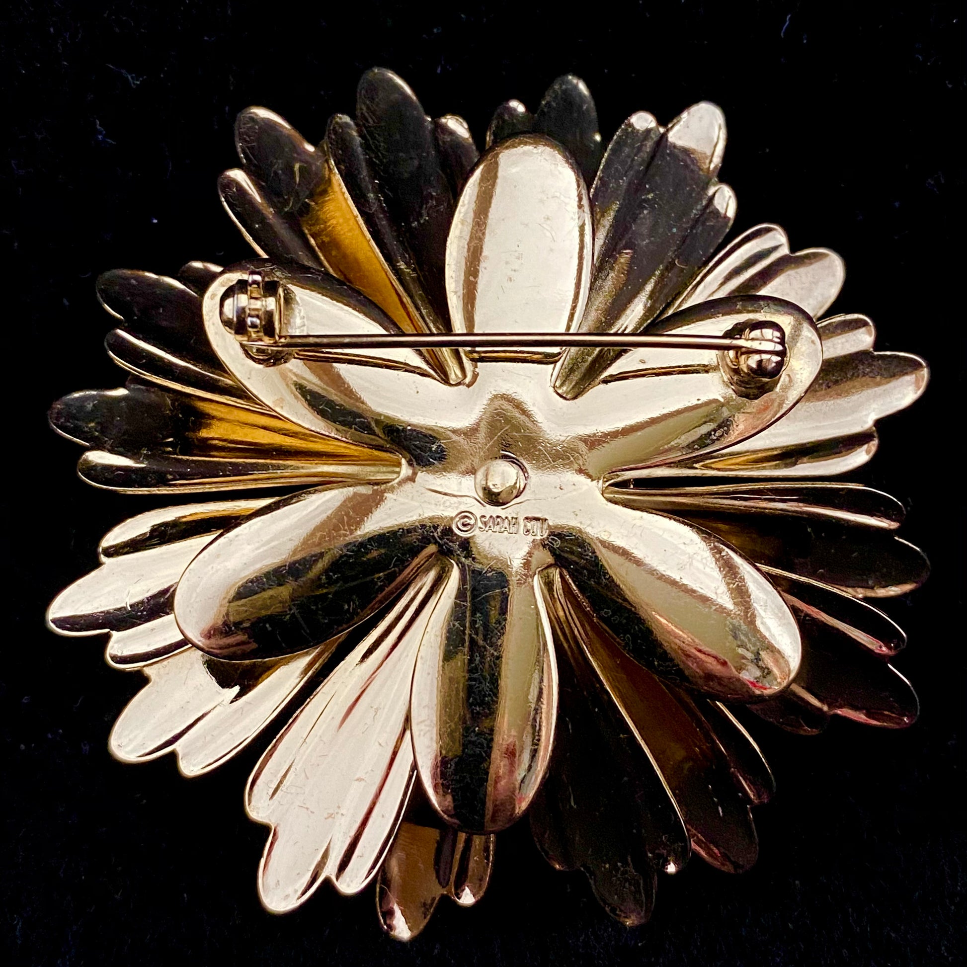 The Sarah Coventry Sunflower brooch was introduced in 1969. This large, but lightweight, brooch features overlapping polished gold-tone petals and a textured disc center. The brooch measures approximately 2½” in diameter. It is signed ©SARAHCOV and is in very good vintage condition*.