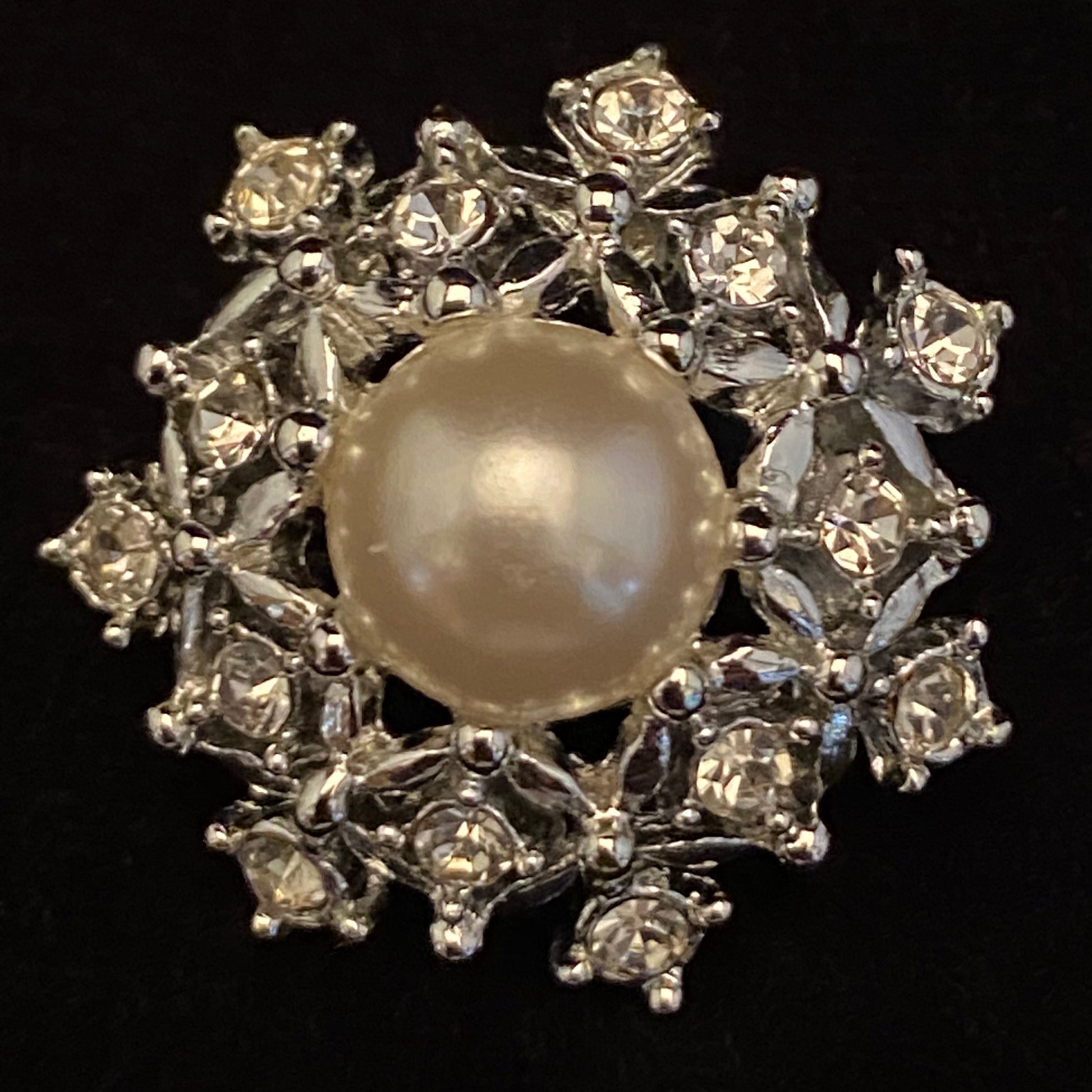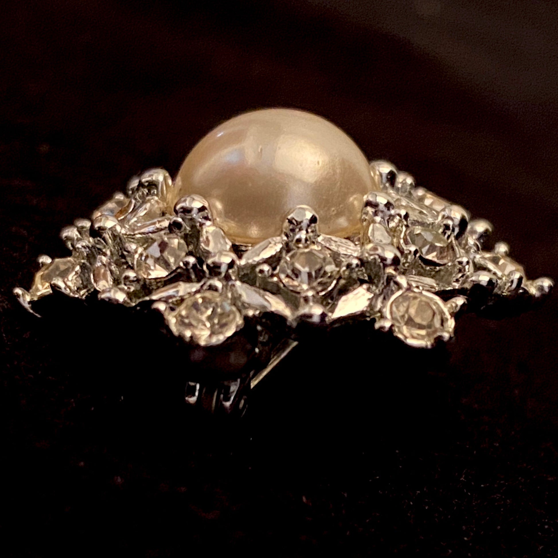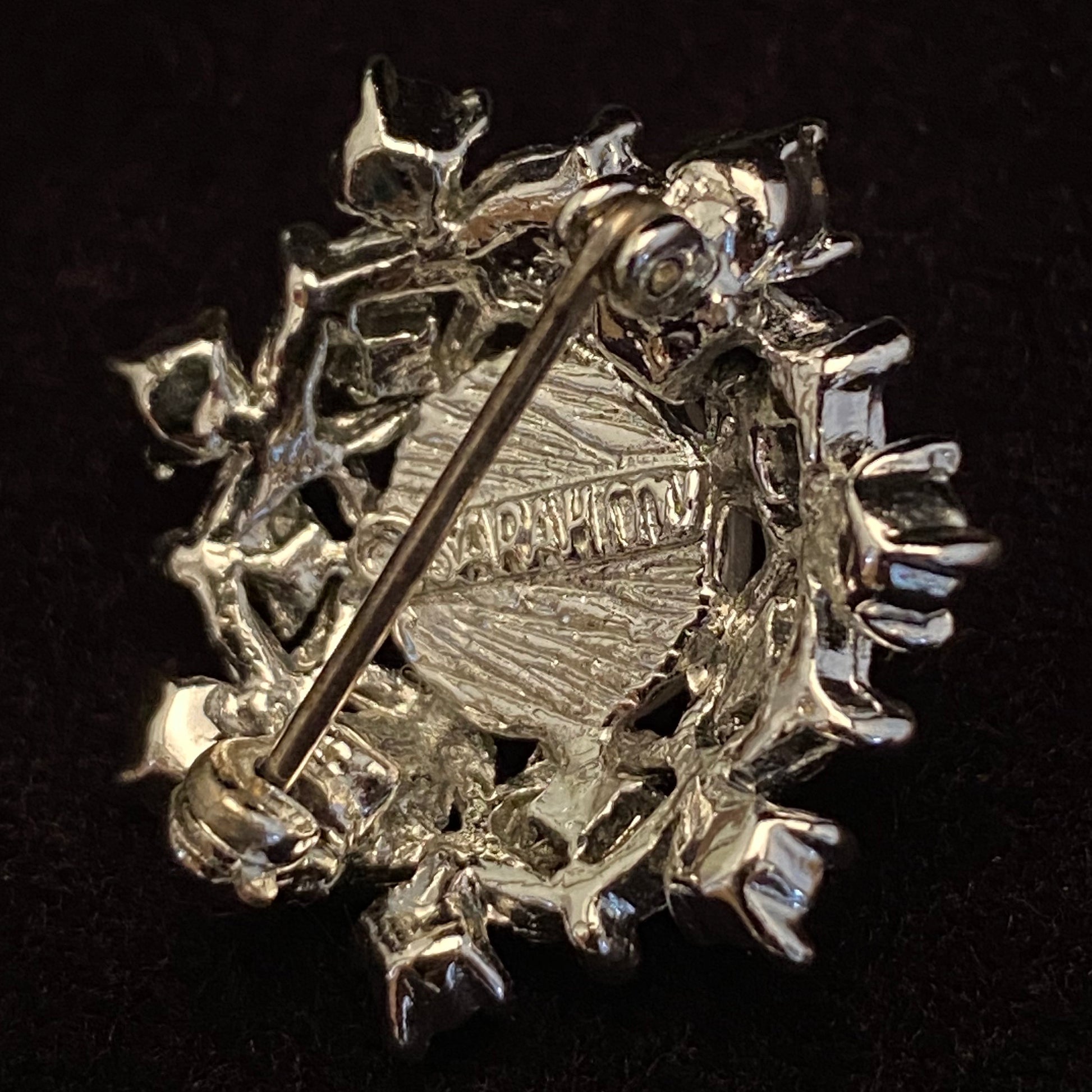 The Sarah Coventry Ultima collection was introduced in 1969. The tiny brooch features a large faux pearl set in a silver-tone snowflake design. Delicate little clear rhinestones accent the brooch. The brooch measures approximately 1” in diameter and is signed ©SARAHCOV. It is in excellent vintage condition.
