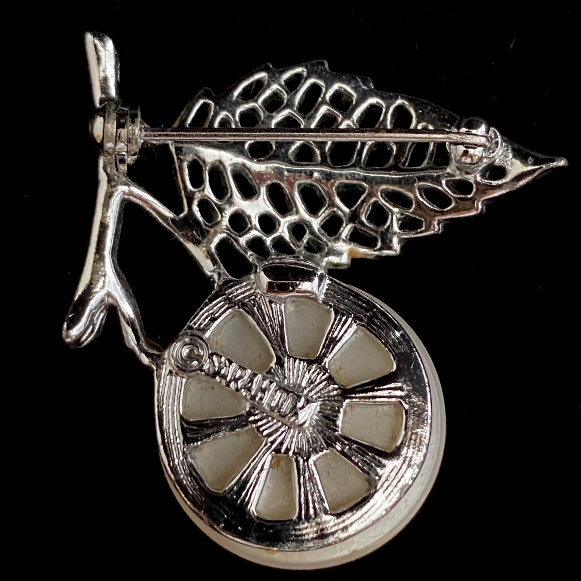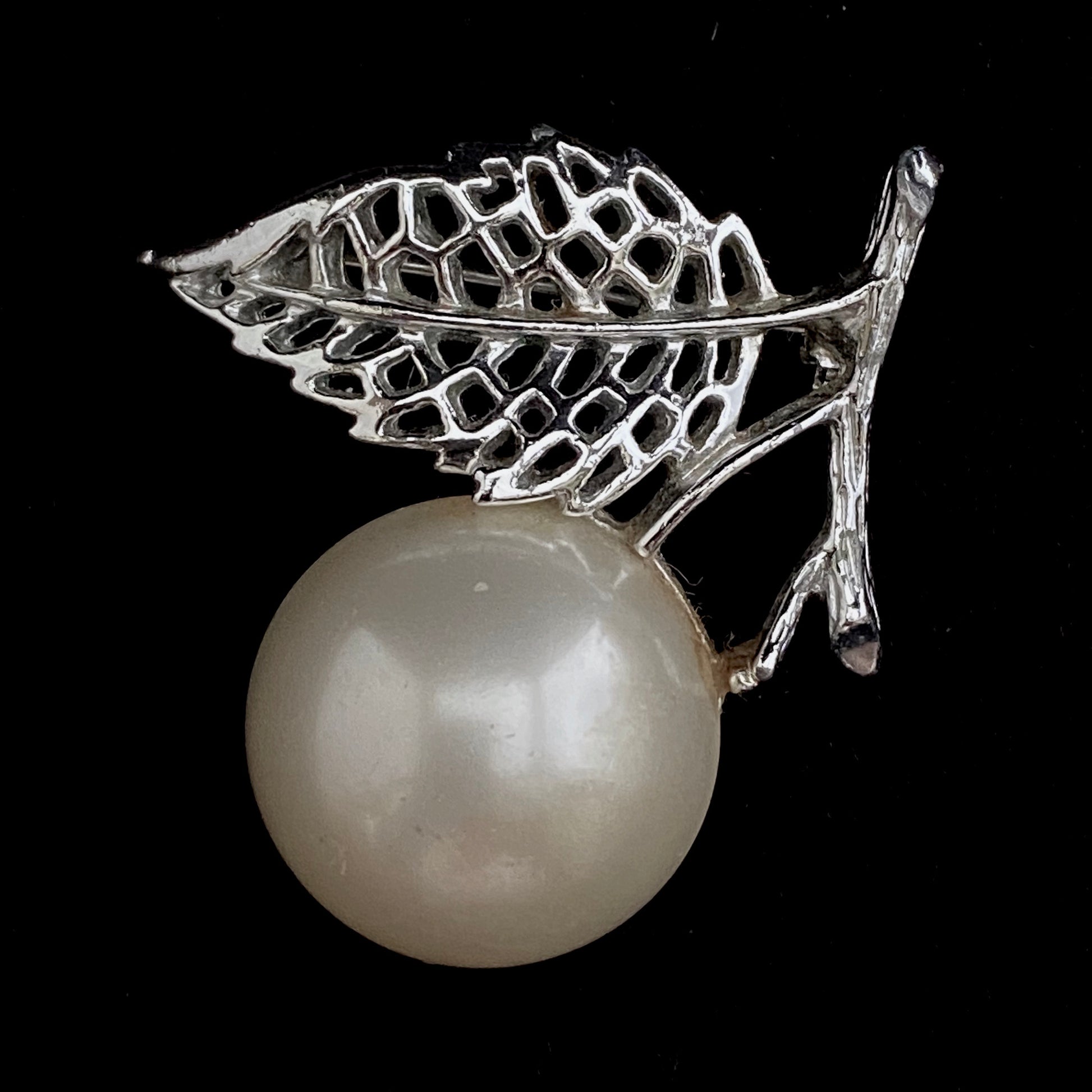 The Sarah Coventry Nature’s Pearl brooch was introduced in 1970. The brooch features a large ¾” domed faux pearl accented by a detailed silver-tone branch and a beautiful polished open work leaf. The brooch is signed ©SARAHCOV. It measures approximately 1½" H x 1½” W and is in excellent vintage condition.