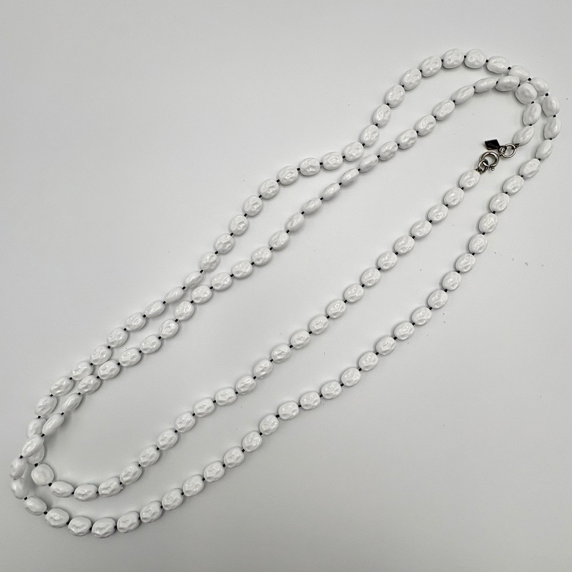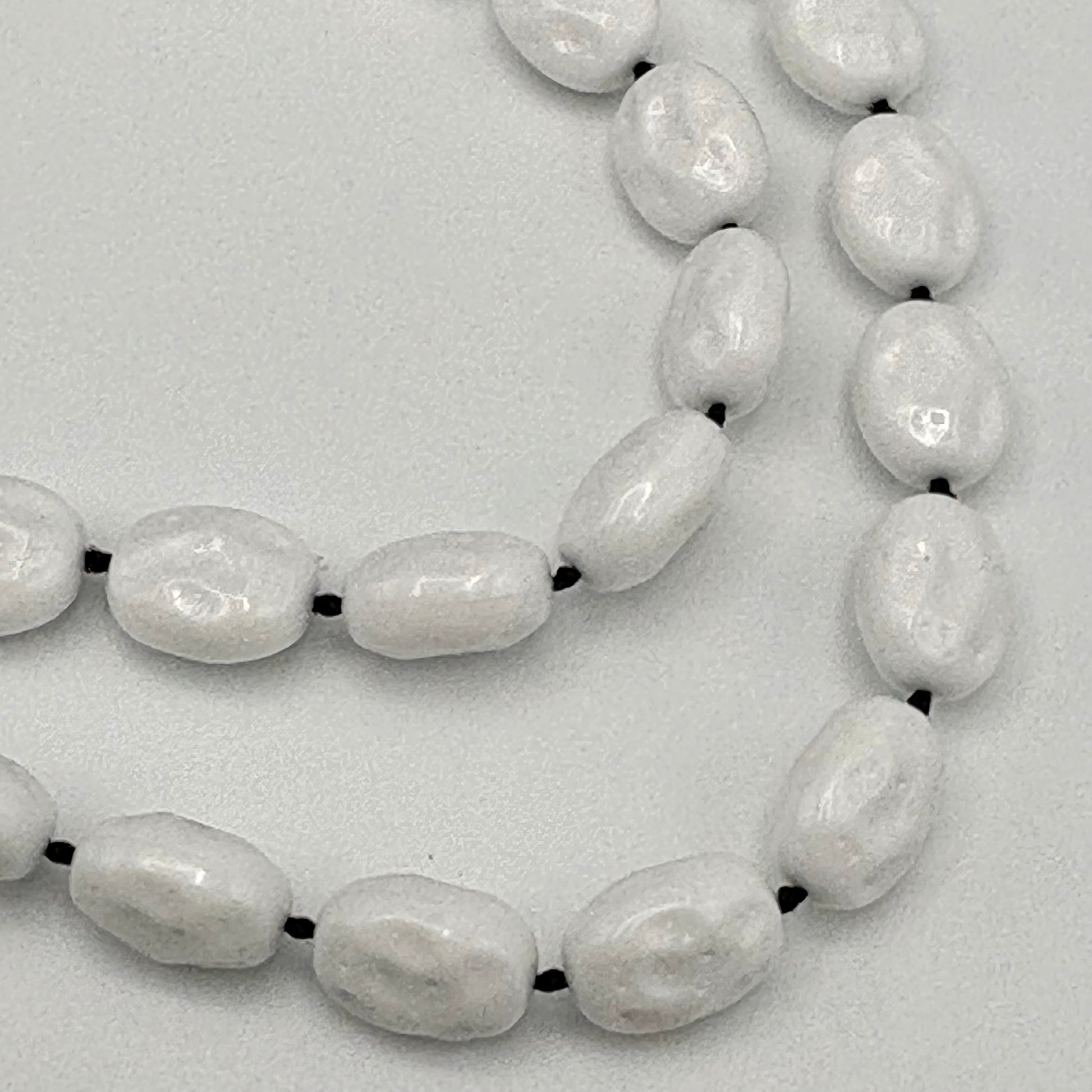 The beautiful Sarah Coventry “New Summer Magic” collection was introduced in 1970. This necklace features 3/8” white, oval molded beads that resemble gold nuggets and measures approximately 36” in length. The necklace is signed SARAH COV on the silver-tone hang tag. This parure is in excellent vintage condition.