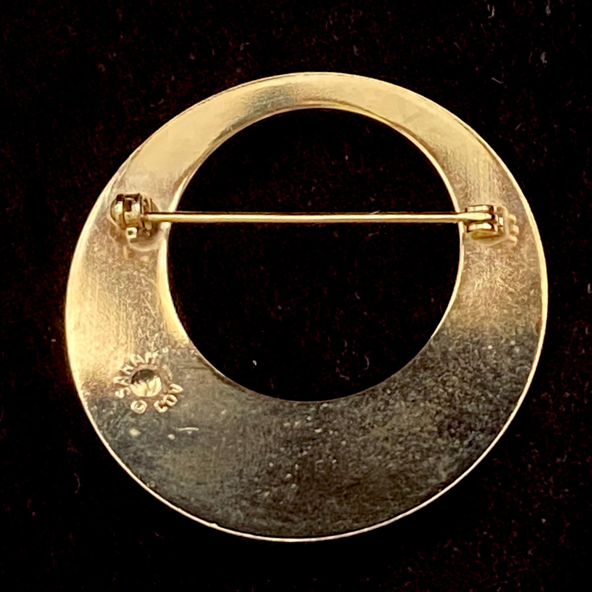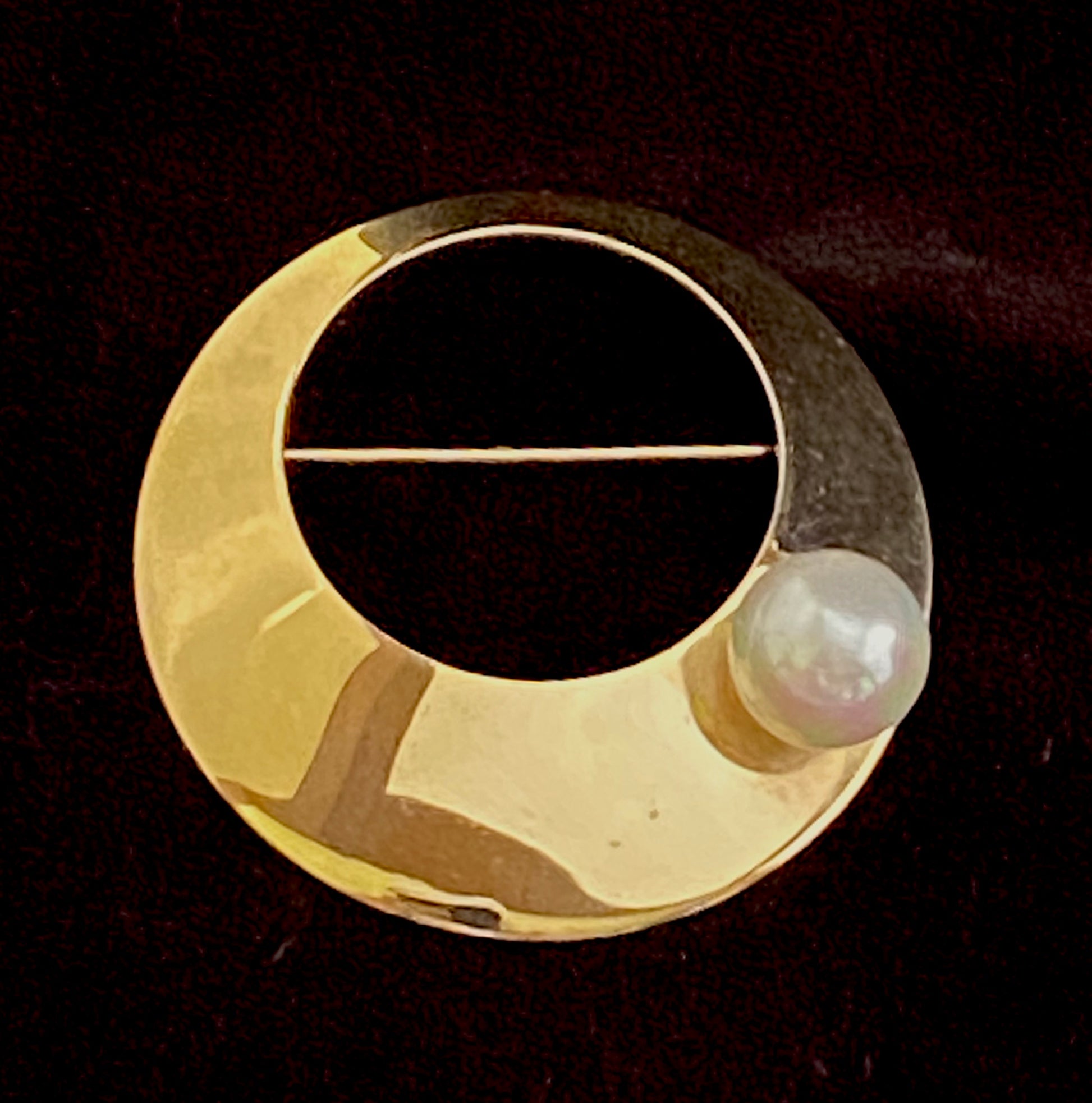 The Sarah Coventry Space Age brooch was introduced in 1970. The gold-tone brooch is a circle pin. The middle of the circle pin sits off center giving it an unusual look. It is accented by a large faux pearl. The brooch is signed ©SARAH COV and measures approximately 1 5/8” in diameter. It is in excellent vintage condition*.