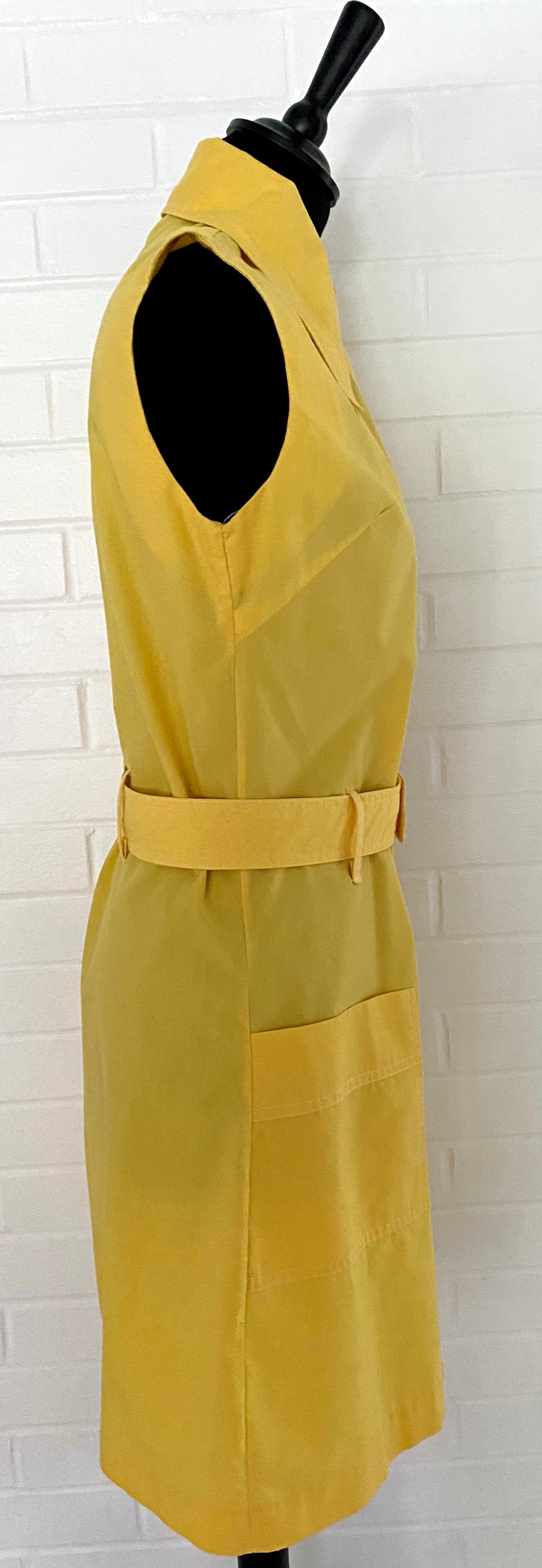 Style: Sleeveless shirt dress with a large collar and a center front button entry. It has two patch pockets on the front and white contrast contrasting top stitching. There is a self fabric belt that closes with 2 buttons