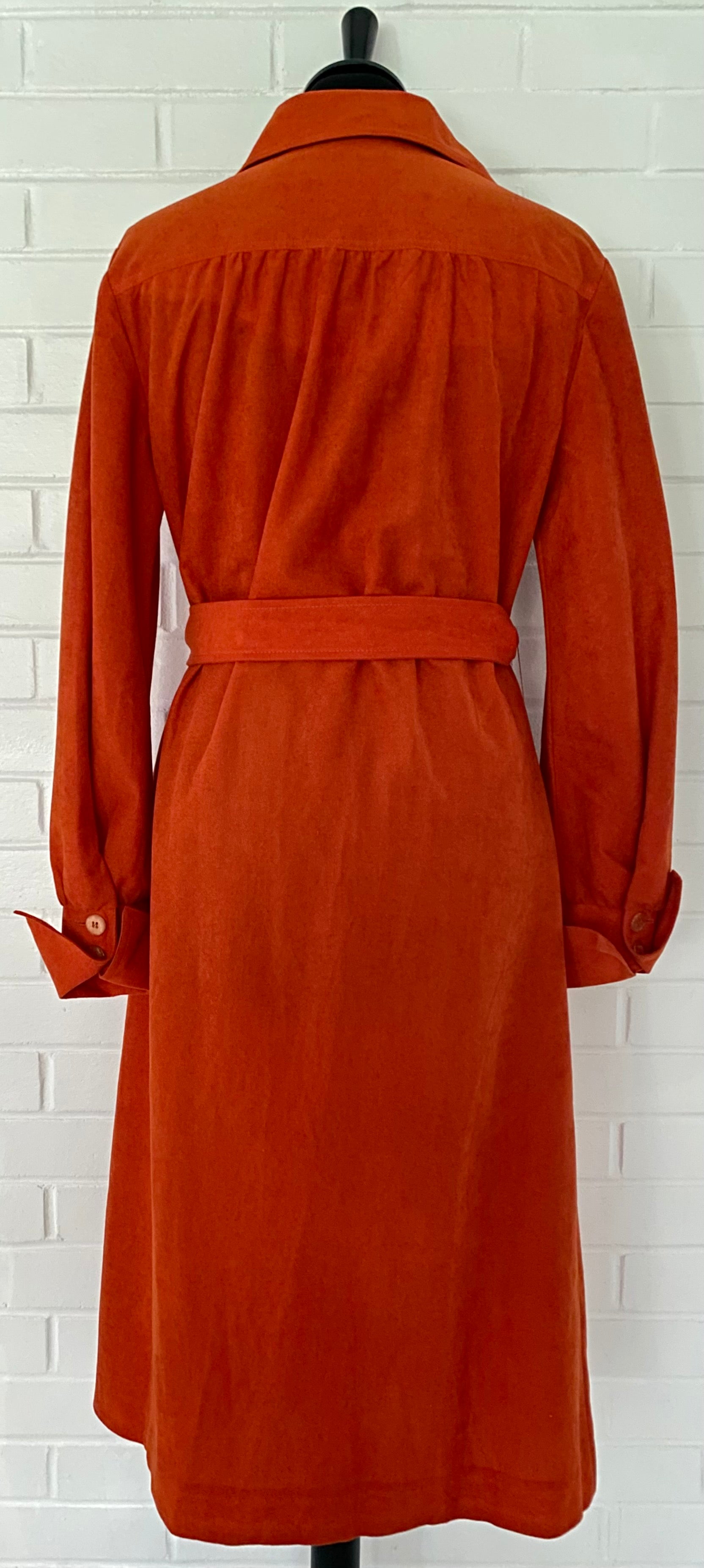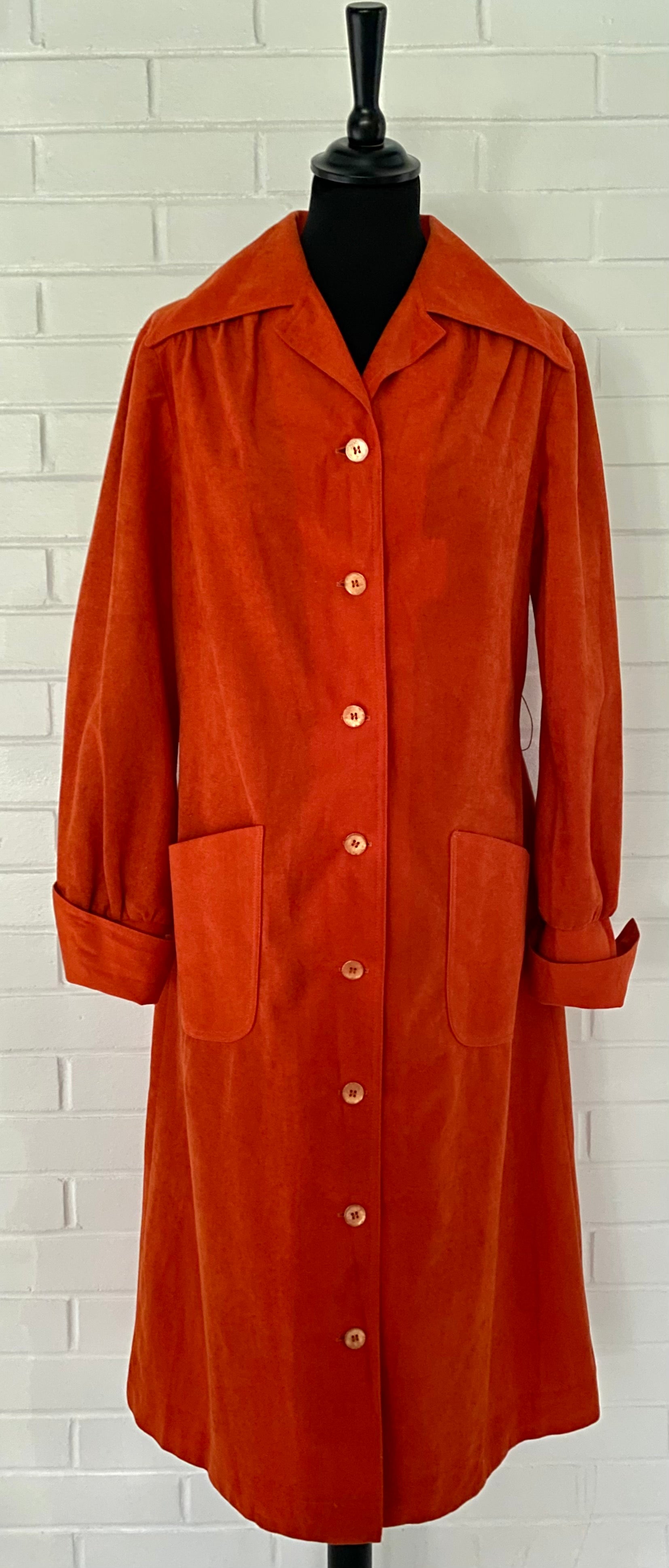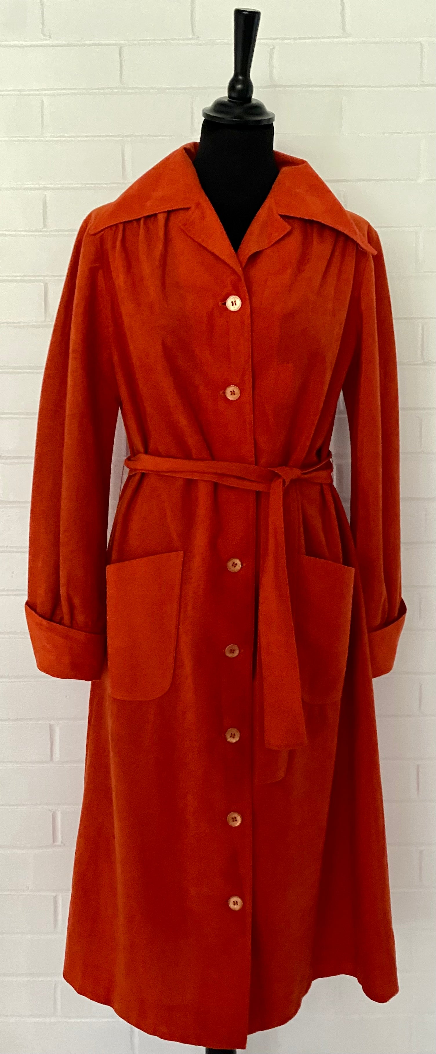 Style: This dress is styled like a trench coat. It has a large collar and buttons up the center front. The sleeves are long and have fold up cuffs that close with two buttons. There are two front patch pockets and is a self fabric belt.