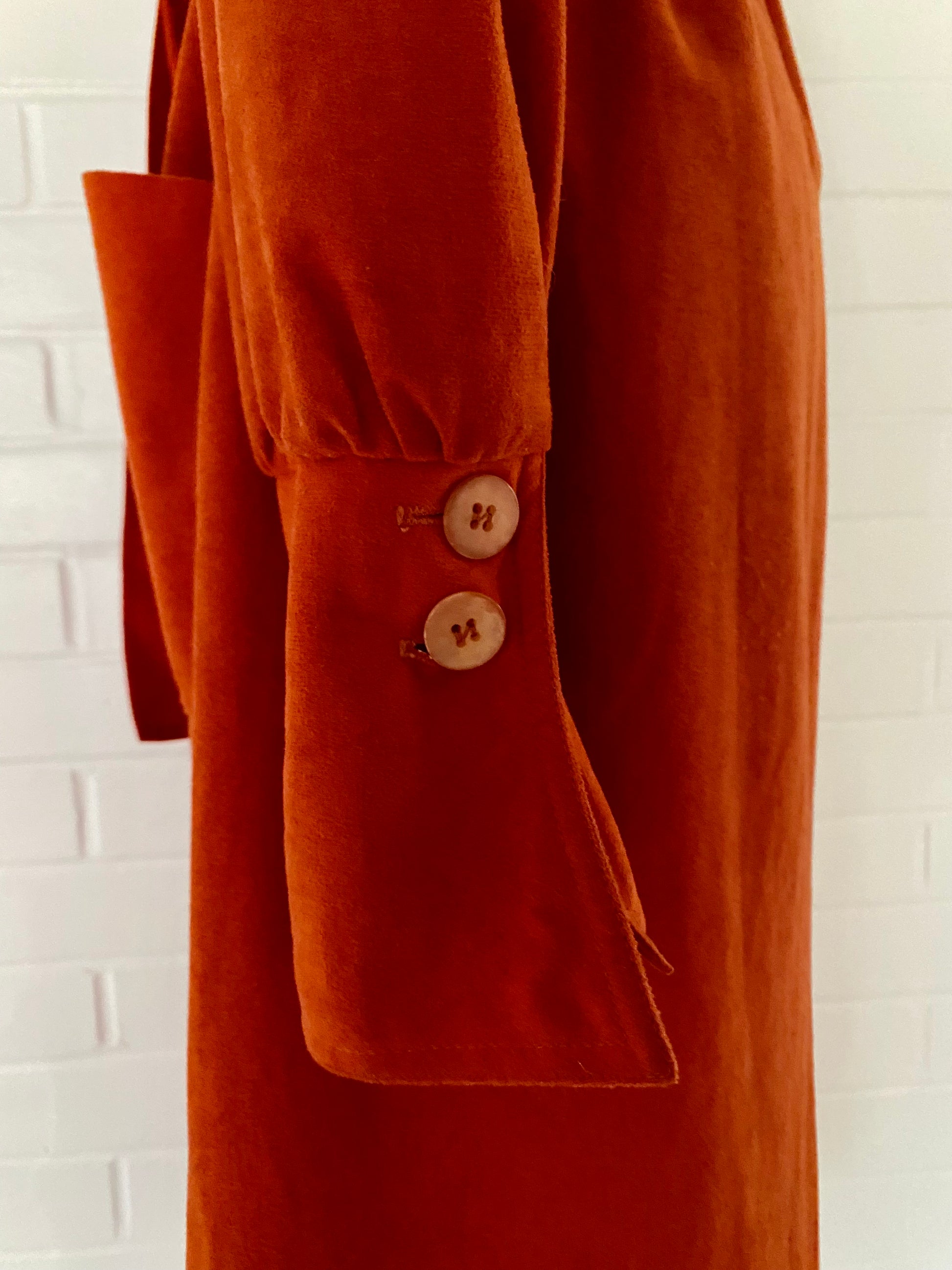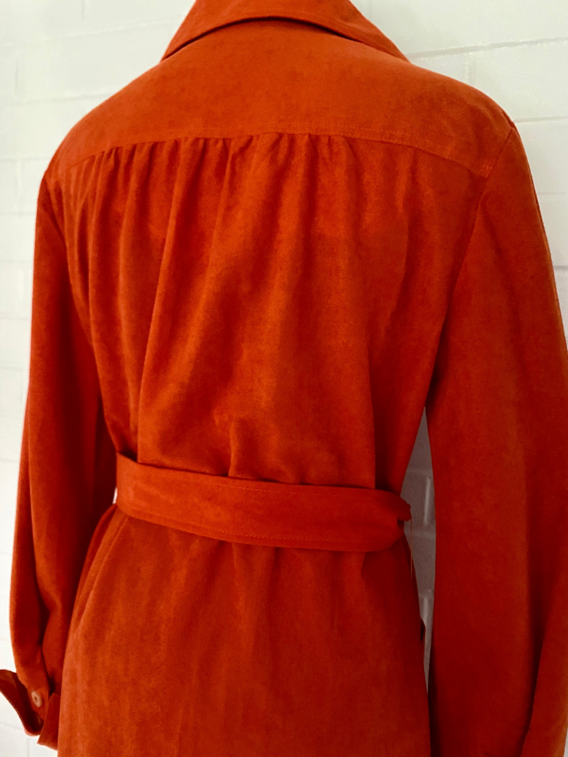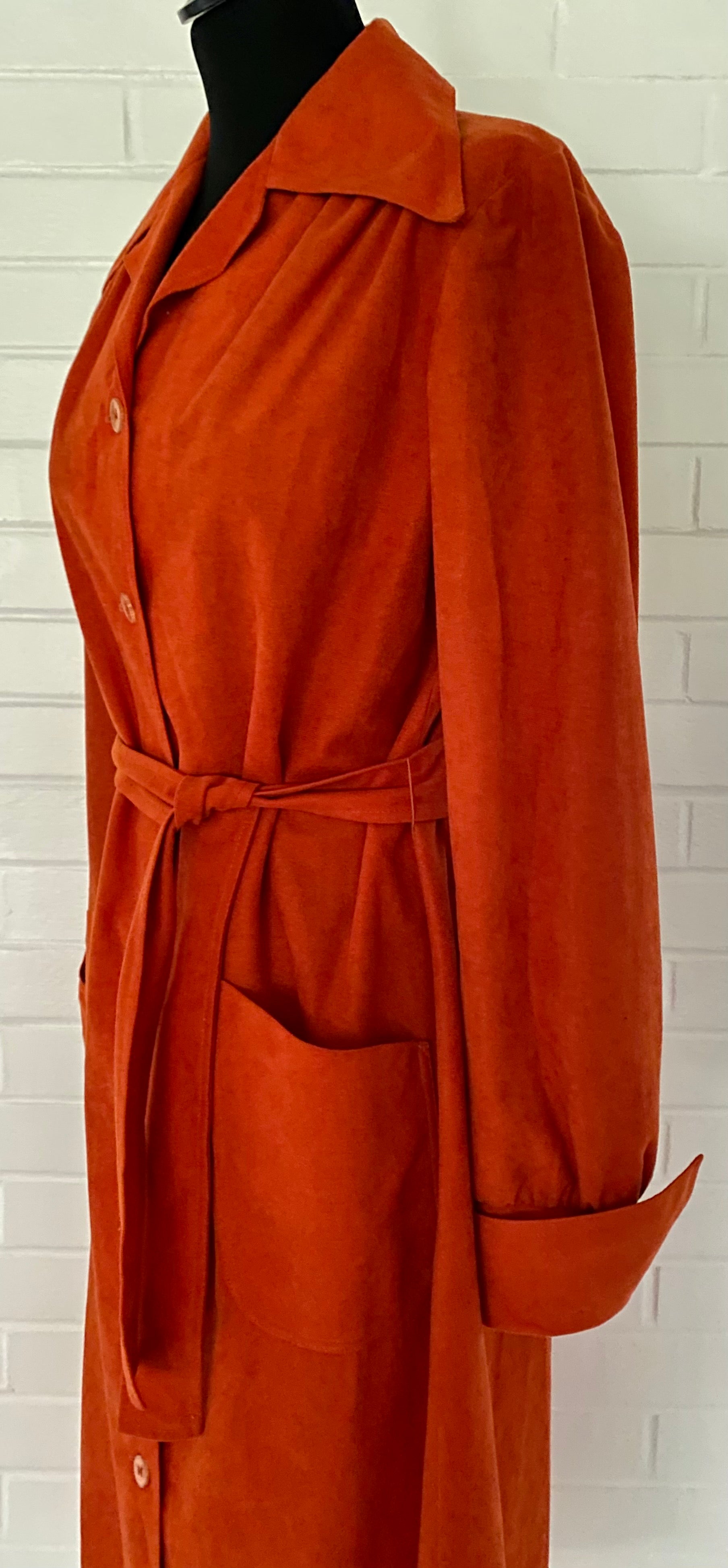Style: This dress is styled like a trench coat. It has a large collar and buttons up the center front. The sleeves are long and have fold up cuffs that close with two buttons. There are two front patch pockets and is a self fabric belt.