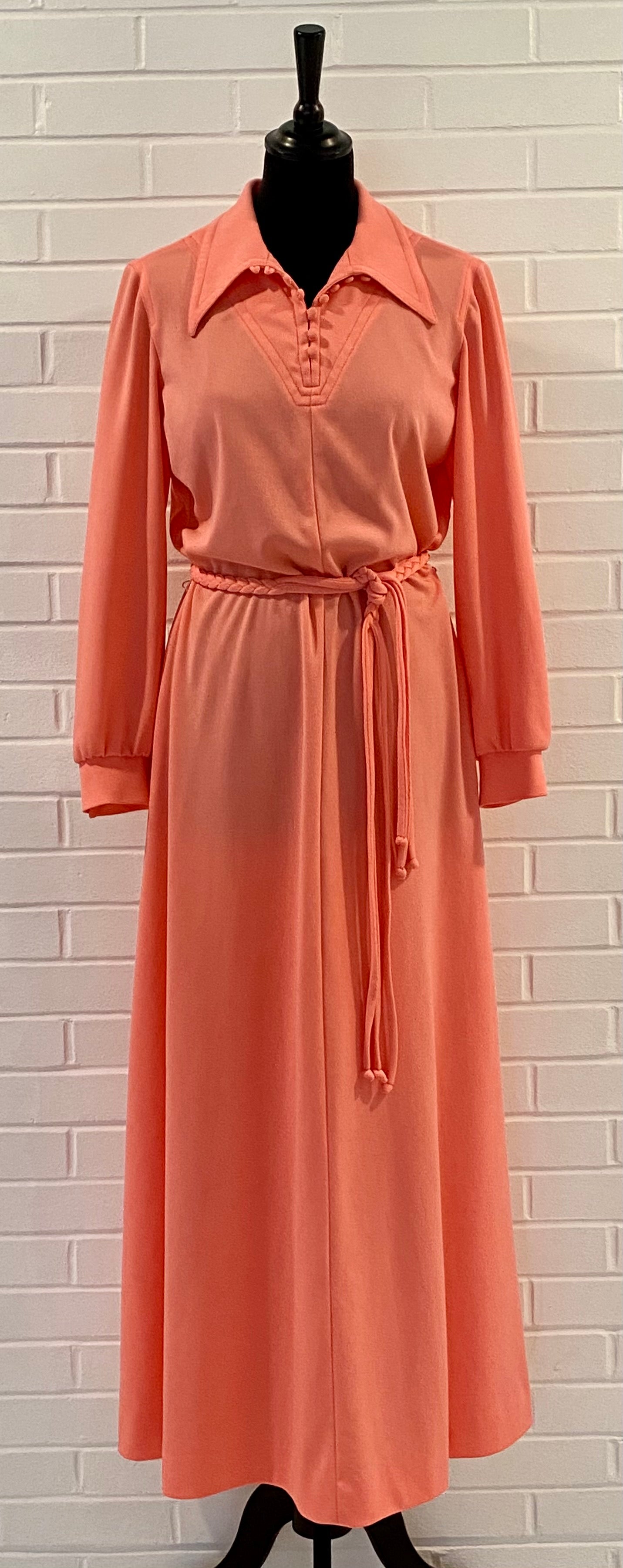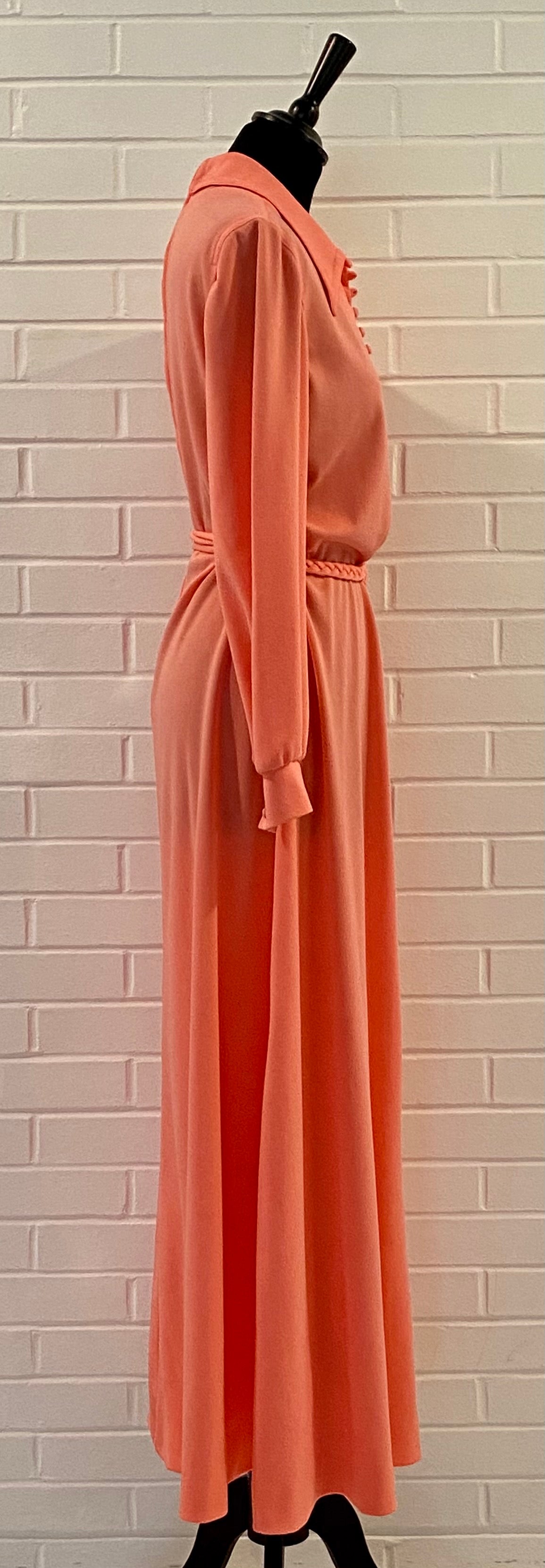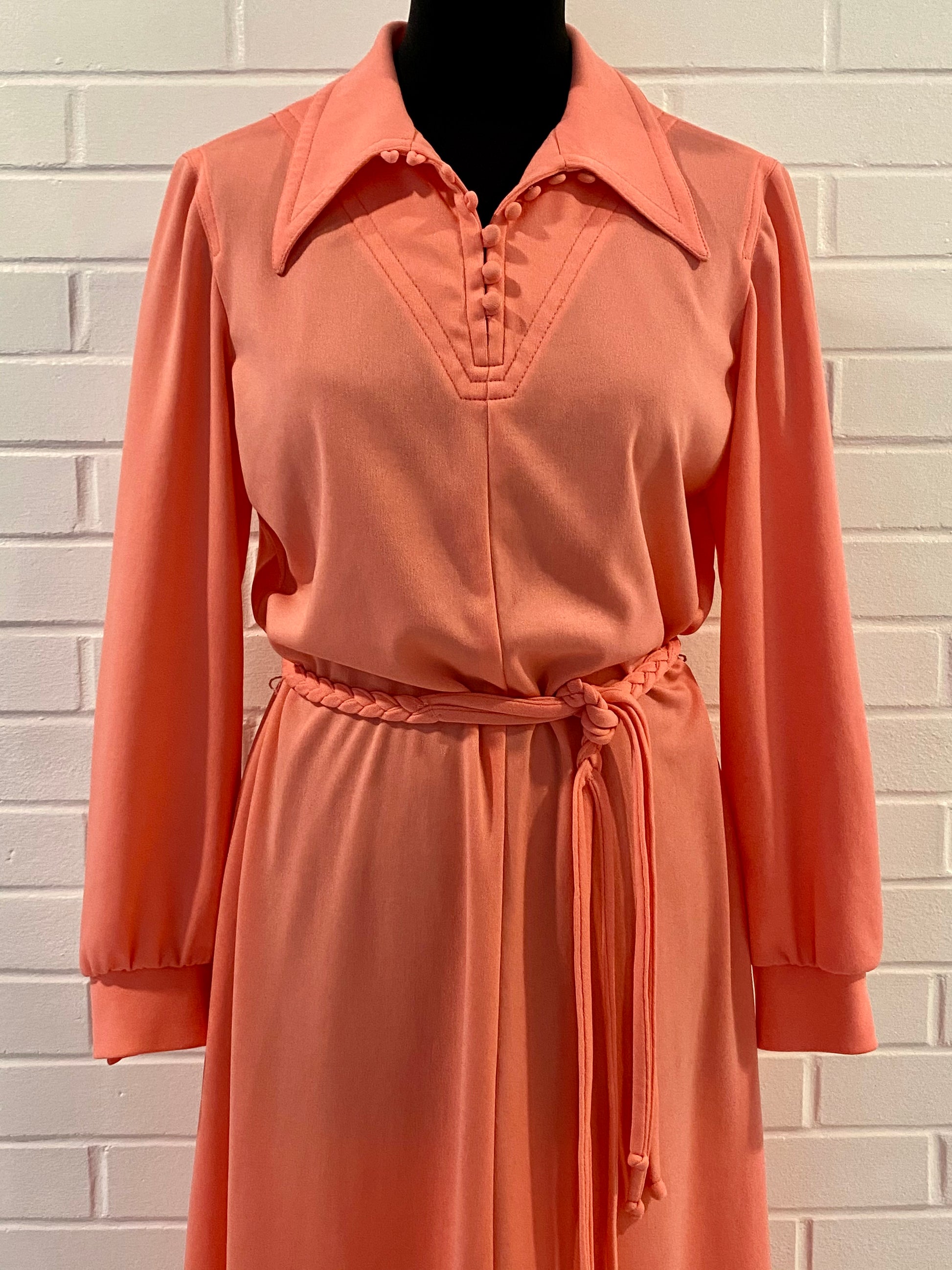 Style: A long maxi, A-line style dress with pointed, stylized collar and center front self fabric covered button details. There is center back zipper entry. It has long sleeves with cuffs and buttons and a self fabric braided tie belt.