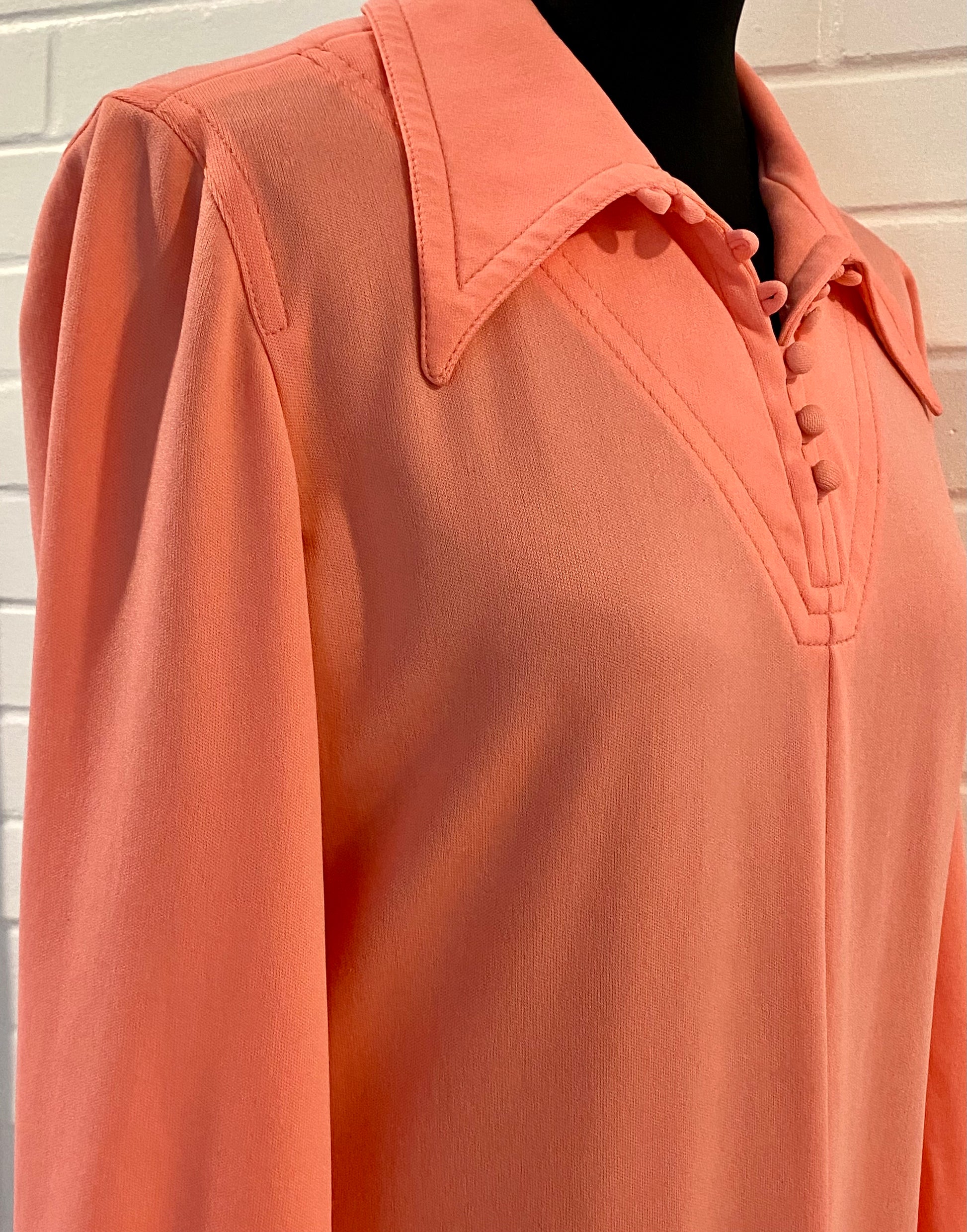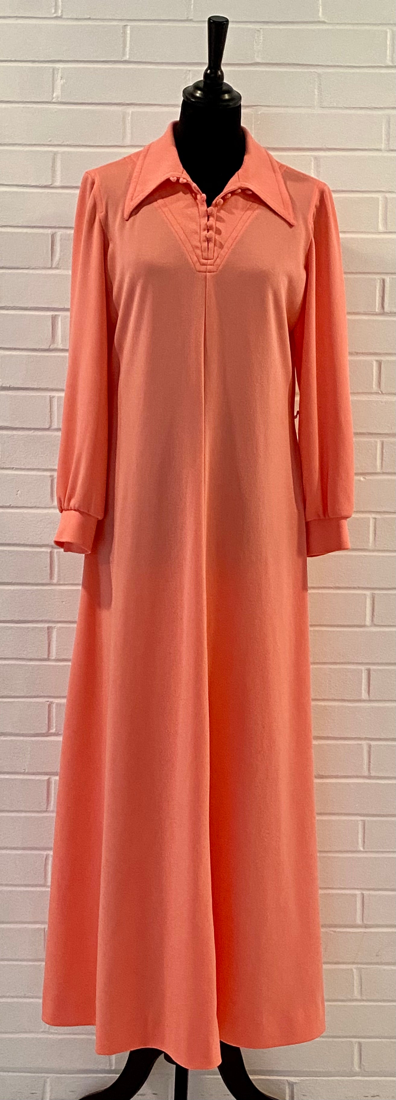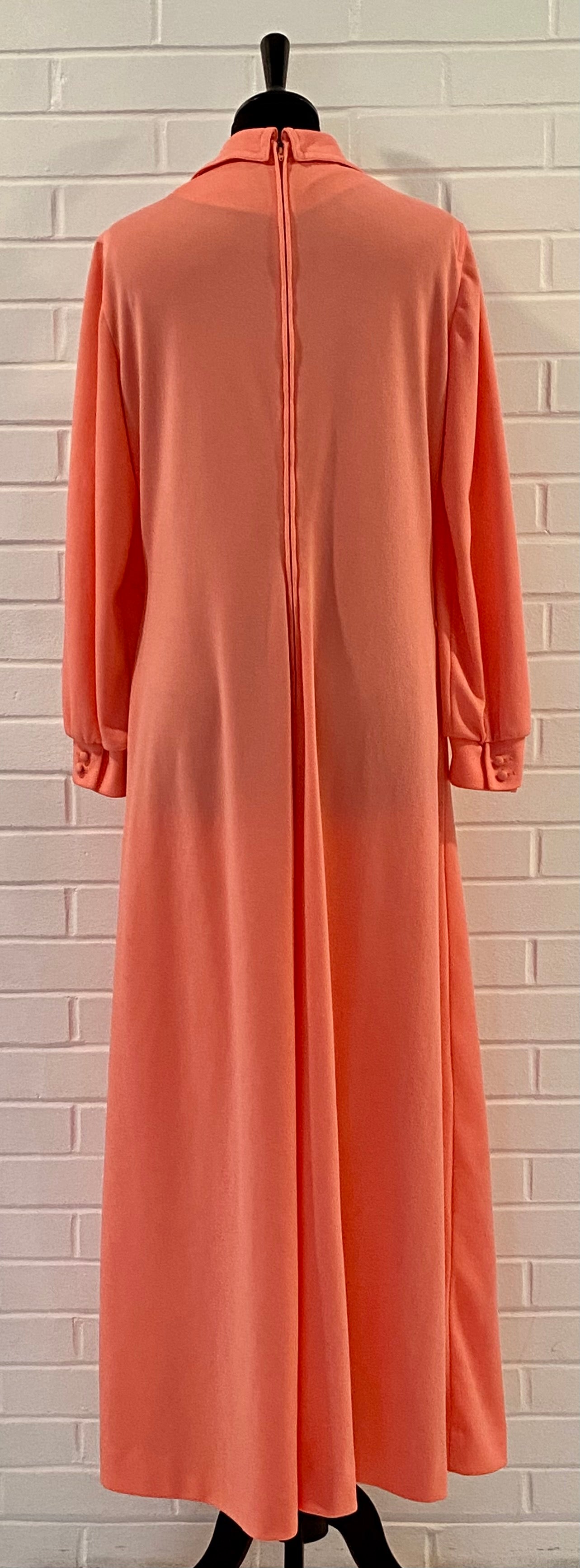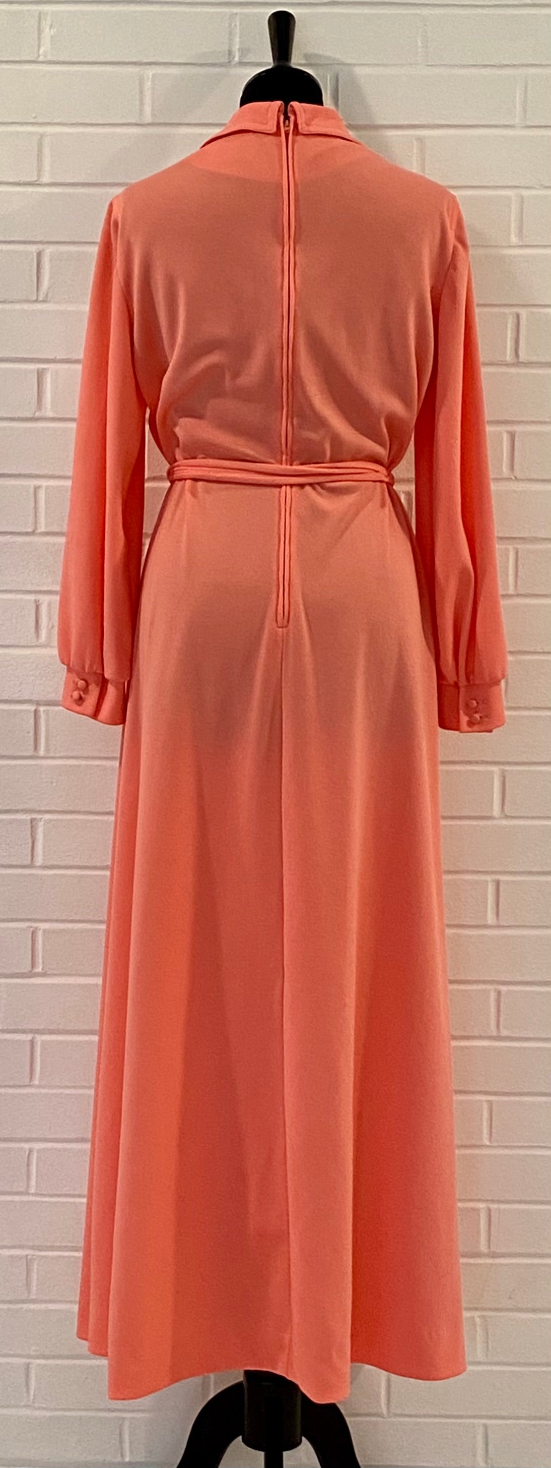 Style: A long maxi, A-line style dress with pointed, stylized collar and center front self fabric covered button details. There is center back zipper entry. It has long sleeves with cuffs and buttons and a self fabric braided tie belt.