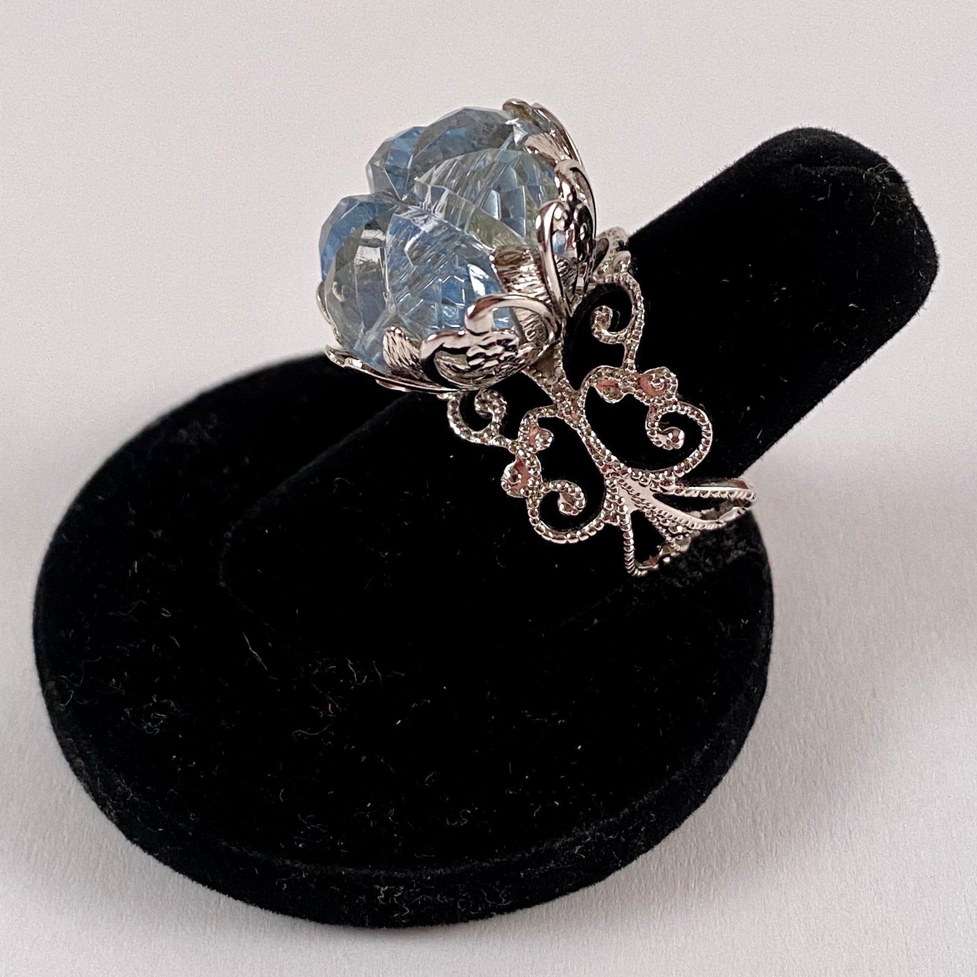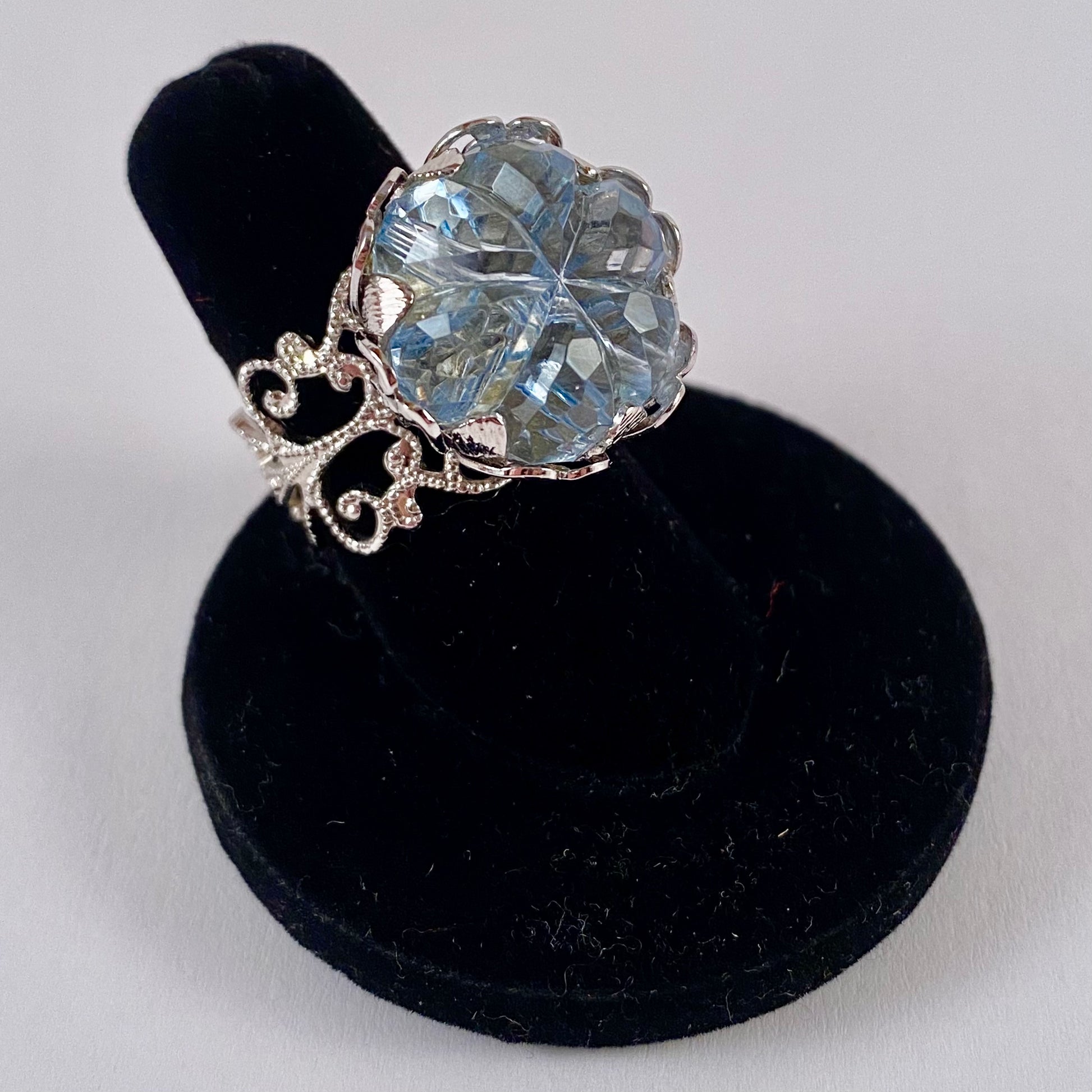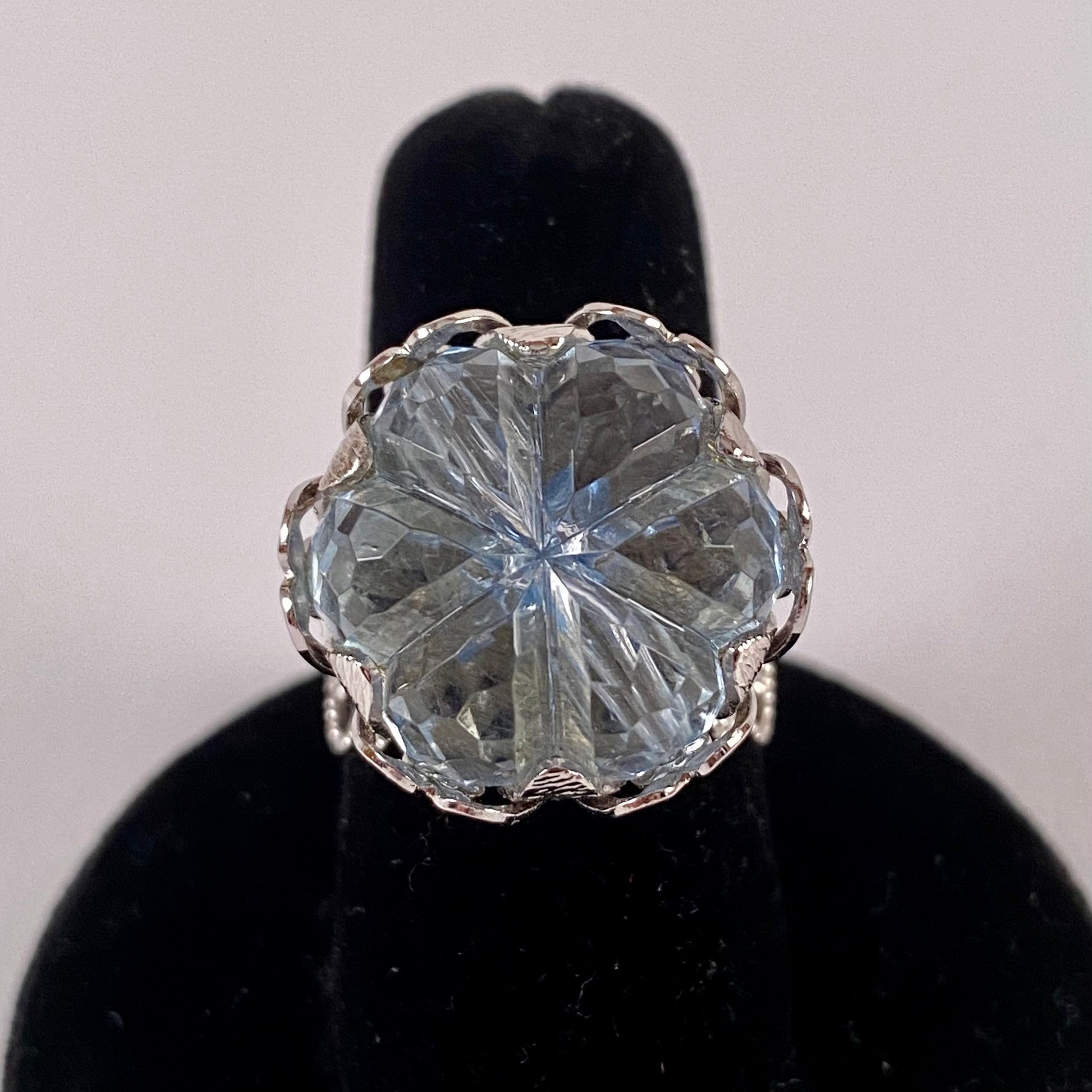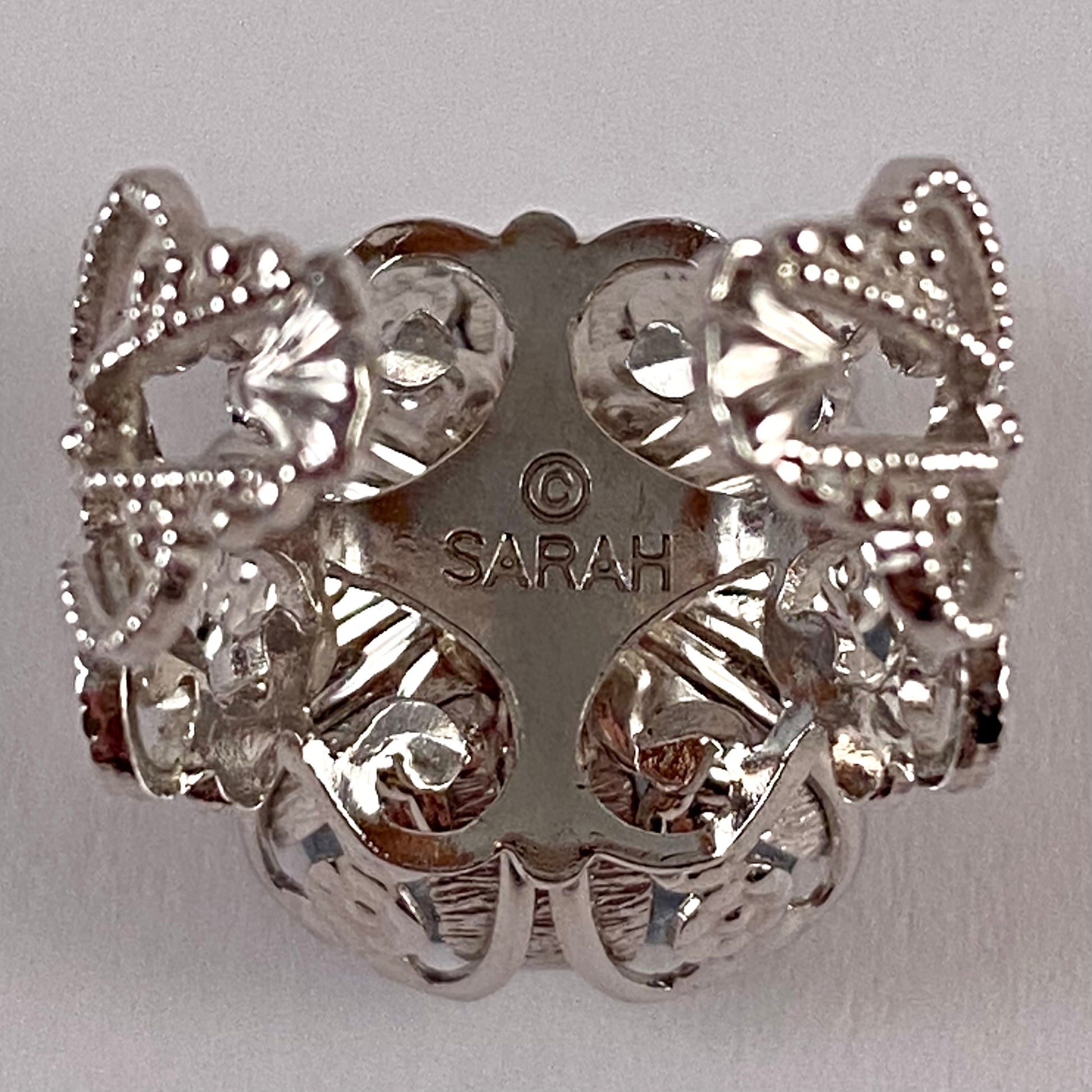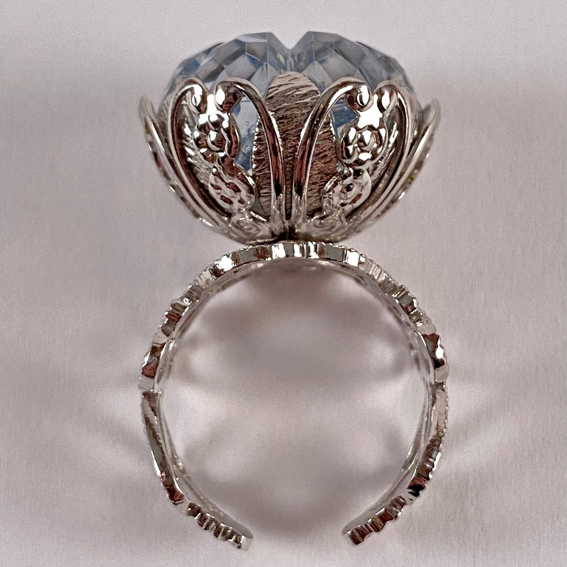 This fantastic Blue Lace ring is a 1973 Sarah Coventry creation. The ring features a large, light blue, faceted plastic stone with a carved surface. The stone is set in a deep, silver-tone, filigree cup on a goregous, open back, silver-tone, filigree band. The ring is signed ©SARAH inside of the band. It measures a size 7 but can be easily adjusted using the open back. The ring is in excellent vintage condition.